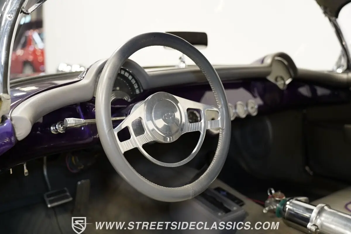 Gray vinyl upholstery with purple piping creates a bold yet sophisticated interior environment that exceeds the comfort of an original '53. Custom door panels include convenient storage compartments with snap closures, combining functionality with style. The leather-wrapped steering wheel sits on a GM tilt column, giving the driver precise control. VDO gauges with detailed pinstriping surround the functional clock, while the strategically positioned aftermarket shifter puts power selection at your fingertips. Pioneer speakers tucked into the kick panels deliver quality sound from the radio unit mounted behind the seat, controlled via remote near the shifter. Safety features include seatbelts and a mounted fire extinguisher.