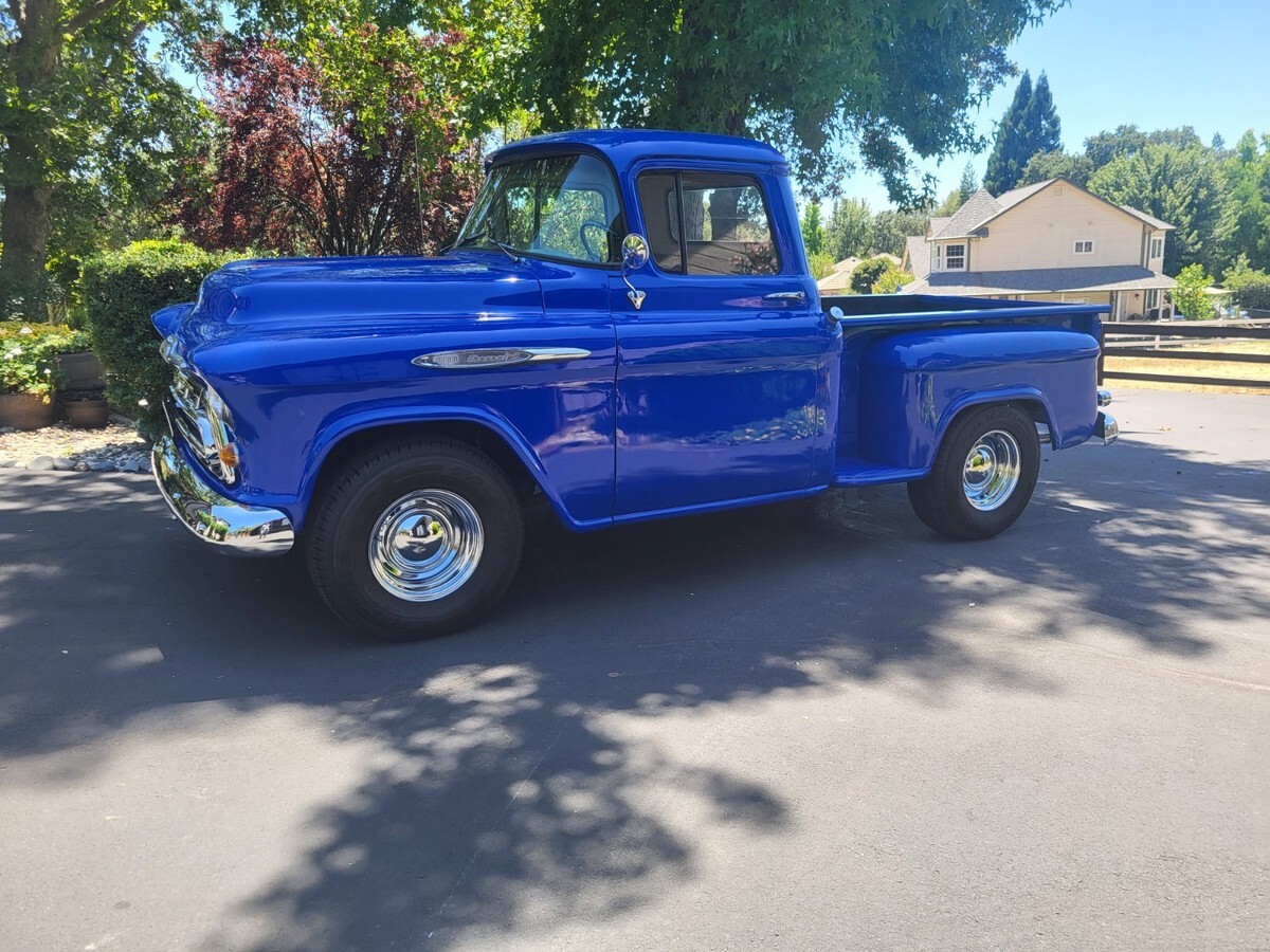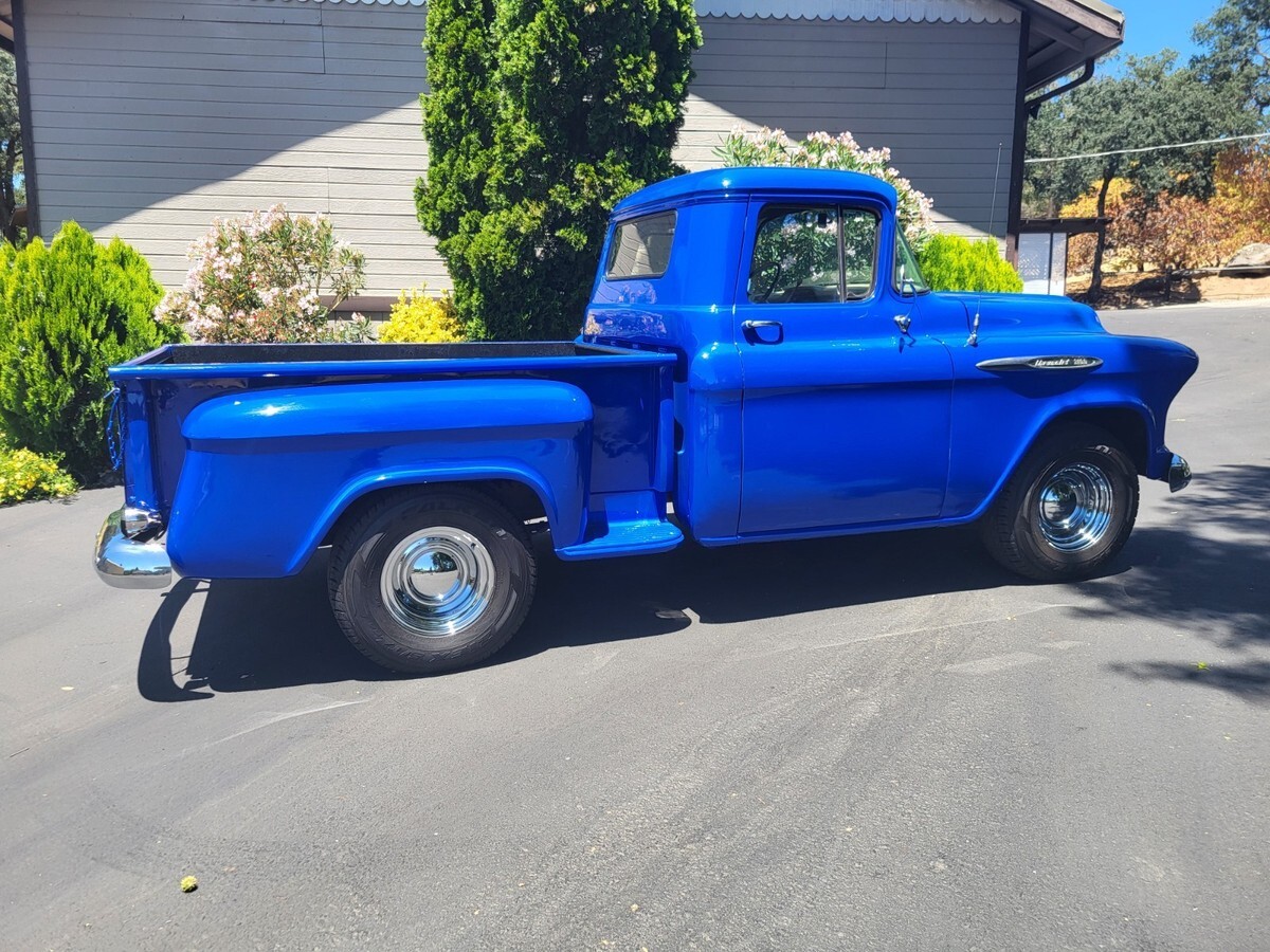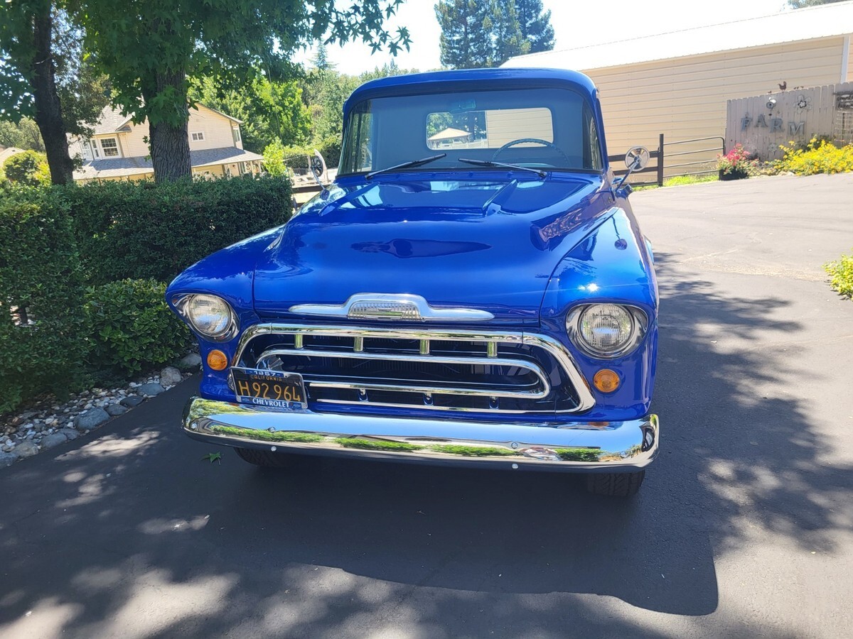 Very nice, sound mechanical 1957 Chevrolet 3100 Pickup, short bed step side. This is an original, second owner, 6 cylinder, 3 on the tree truck. We are selling this for a dear friend. It has nice paint, but body work could be better, no major dents, but there are prep flaws that show on close inspection, most people would not notice, paint looks good, shiny pretty color. There is no major rust, floors are original and sound. It has excellent tires, chrome wheels, baby moon hubcaps. The chrome is good to excellent, grille, bumpers, taillights, headlight bezels are all rechromed.The engine has good oil pressure, new radiator, thermostat and housing, all new hoses, new fuel filter, recent tune-up and oil change. The charging system works. The owner has included a rebuilt carb and a new aluminum radiator to replace down the road if and when needed, new battery last week. The rear end grease was changed, and installed new cover and gasket, along with new brakes and wheel cylinders. The interior is original, non-restored, but complete. Nice spray on bed liner. It has new exhaust system and ebrake cable and nice under carriage. Owner indicates his mechanic retired and did not hook up the new turn signal unit, the instructions come with the truck and unit is on the steering column. additionally, there are extra parts included with the truck, see the picture. Truck is currently on California non op. Potential buyers are encouraged to come inspect this truck or have it inspected. Be happy to answer any questions, or get info from owner, or provide additional pictures if requested.