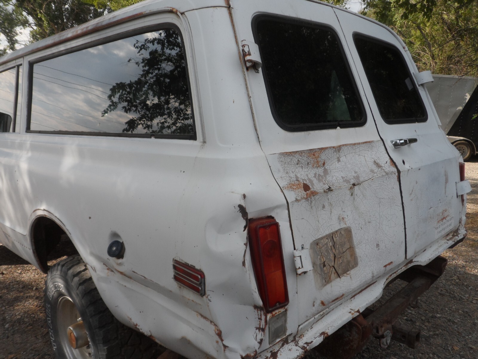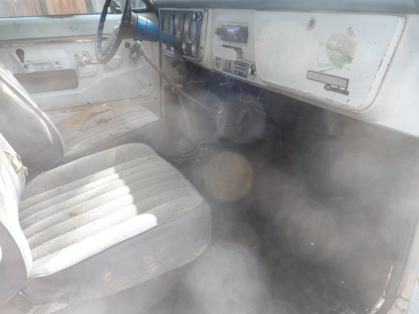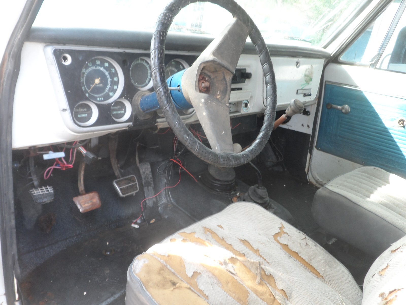70 3/4 ton factory 4x4, 350 engine starts and runs good pouring gas in edelbrock carb, gas tank is inside with a hole in it, has 4 spd trans with part time transfer case lockout hubs, seats shown are not from this and not bolted down, has power steering and brakes, front and rear bumpers off inside, floors are in good shape even the wood in rear floor is not rotted, does need both front rocker panels,both 1/4 panels need repair mostly by taillights, rt rear barn door need repair or replaced, 16" wheels are nice tires weathered checked,w/s cracked all other glass ok, just traded for this so I dont have any history or spare parts, clear Colorado title.
