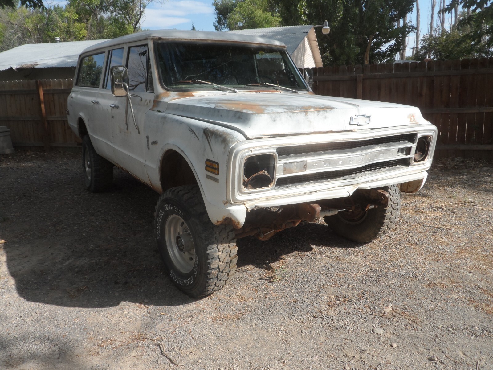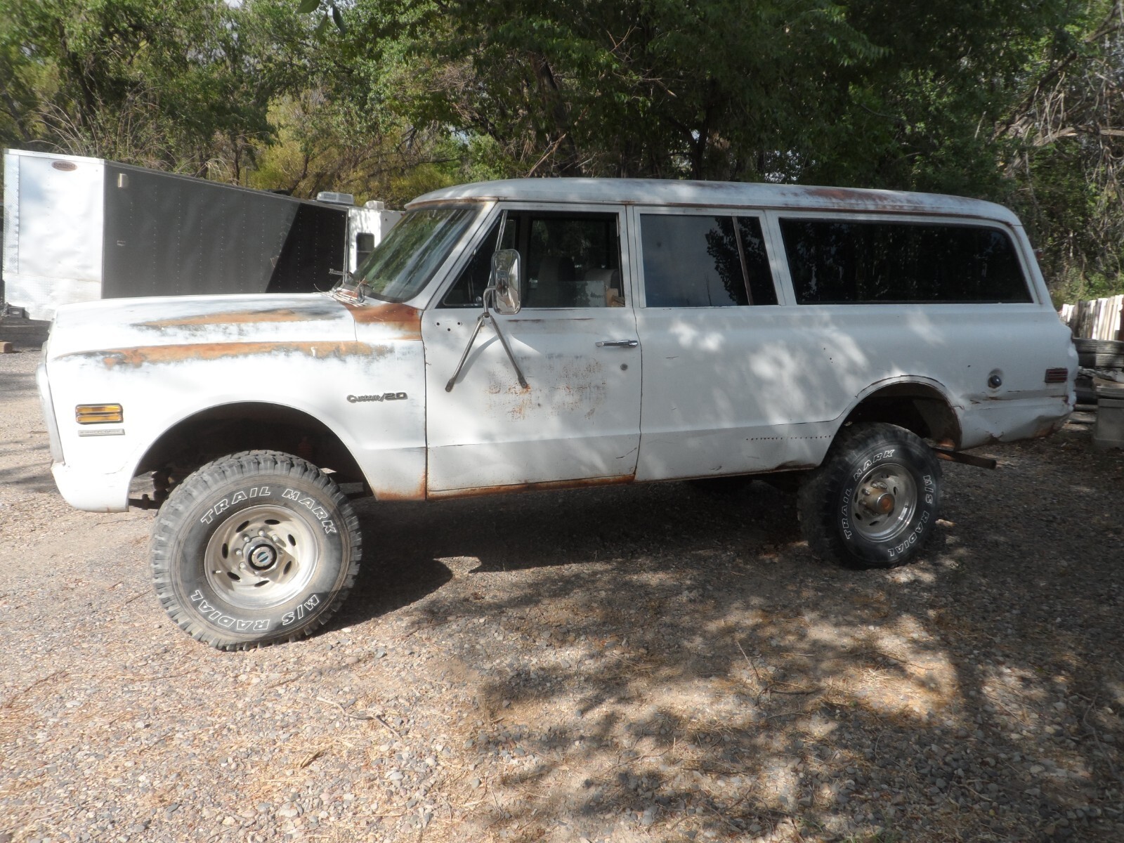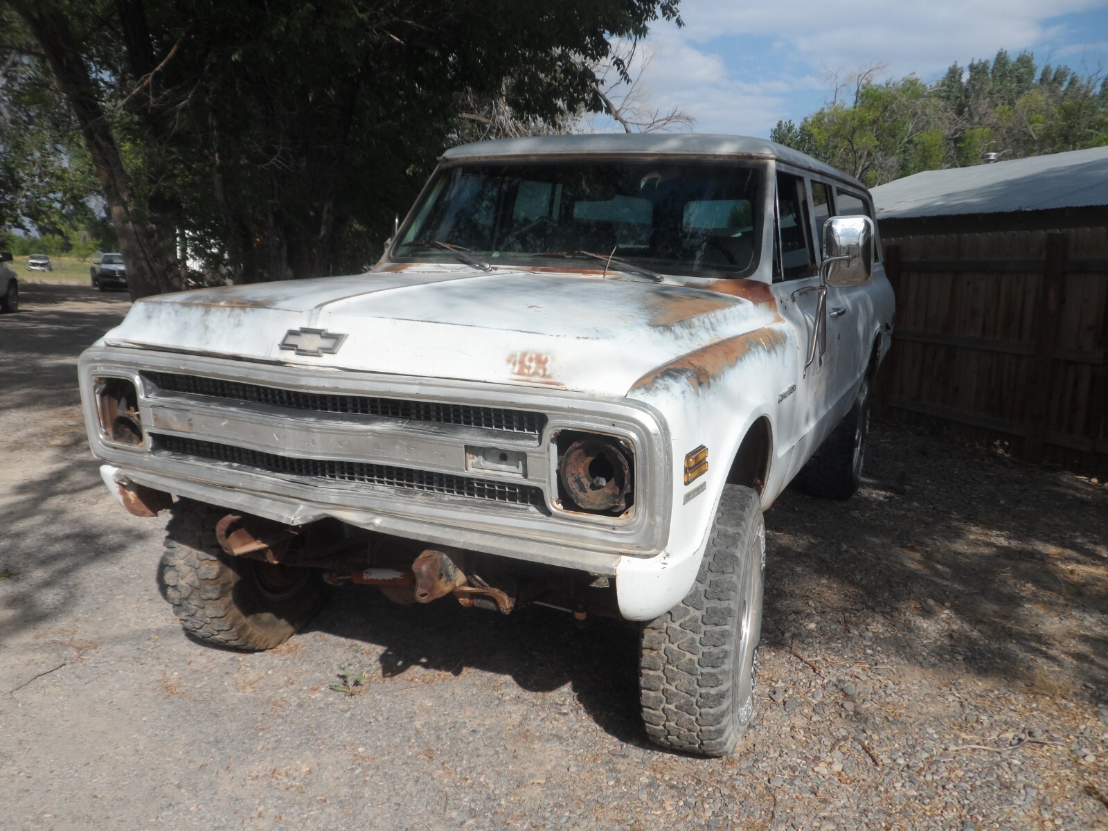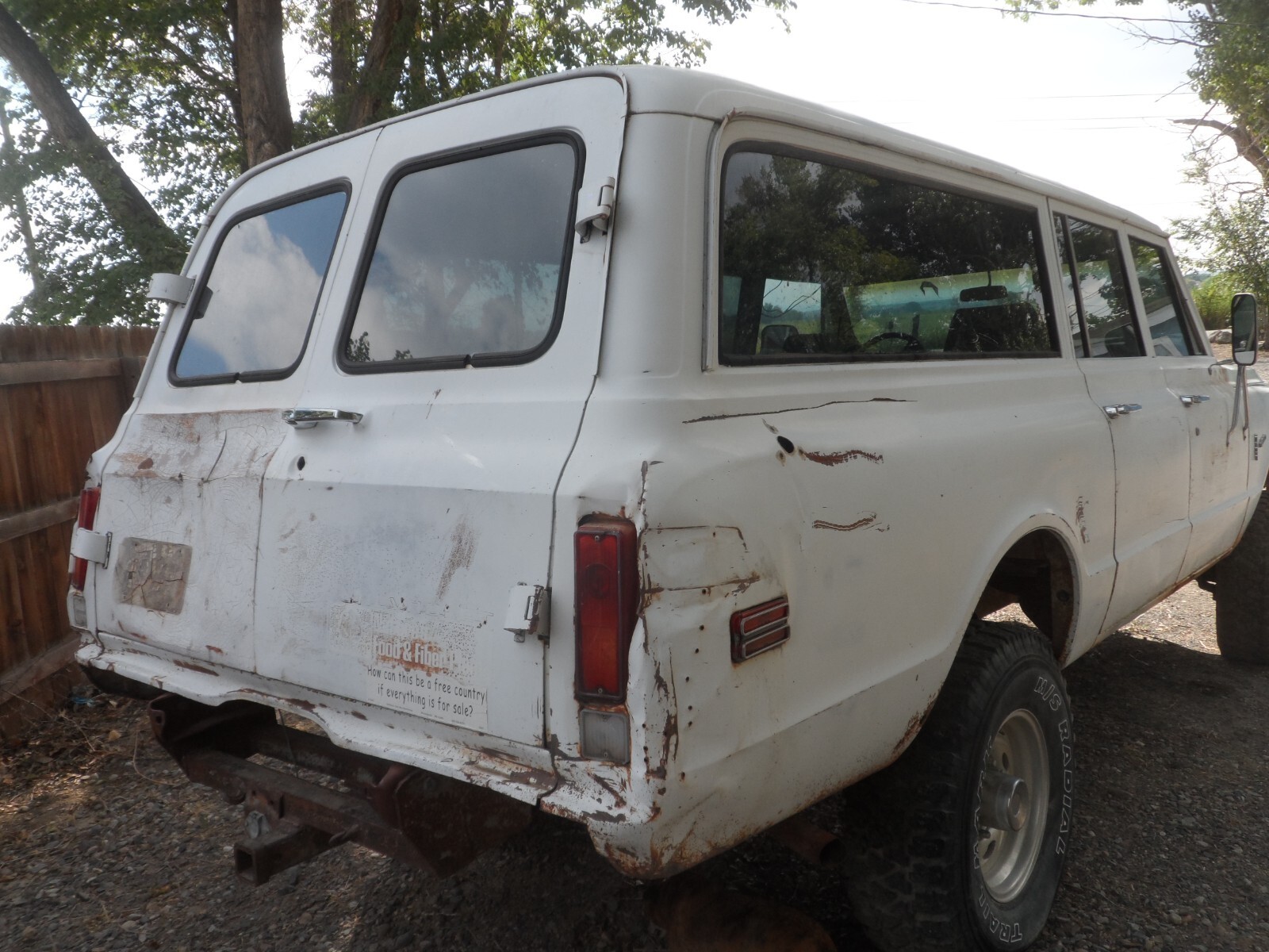 70 3/4 ton factory 4x4, 350 engine starts and runs good pouring gas in edelbrock carb, gas tank is inside with a hole in it, has 4 spd trans with part time transfer case lockout hubs, seats shown are not from this and not bolted down, has power steering and brakes, front and rear bumpers off inside, floors are in good shape even the wood in rear floor is not rotted, does need both front rocker panels,both 1/4 panels need repair mostly by taillights, rt rear barn door need repair or replaced, 16" wheels are nice tires weathered checked,w/s cracked all other glass ok, just traded for this so I dont have any history or spare parts, clear Colorado title.