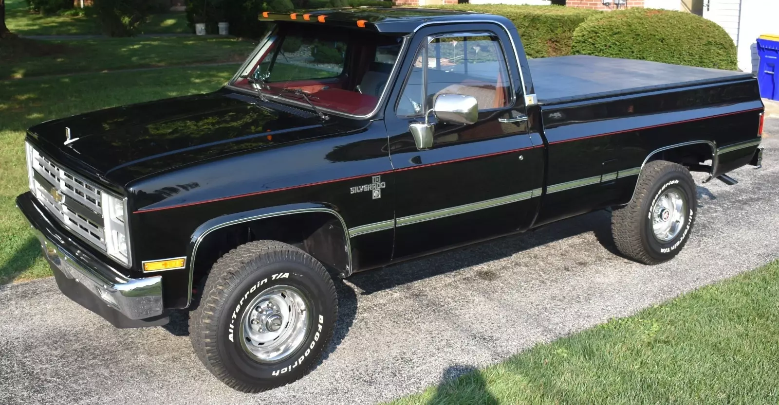 1987 Chevrolet K1500 Silverado with an 8 ft. bed, in black 2-stage urethane and a red cloth interior. It is powered by a ‘crate motor’ 350 cu. in. Chevy V-8 rated at about 300 horsepower and backed by a 700R4 4-speed automatic transmission.