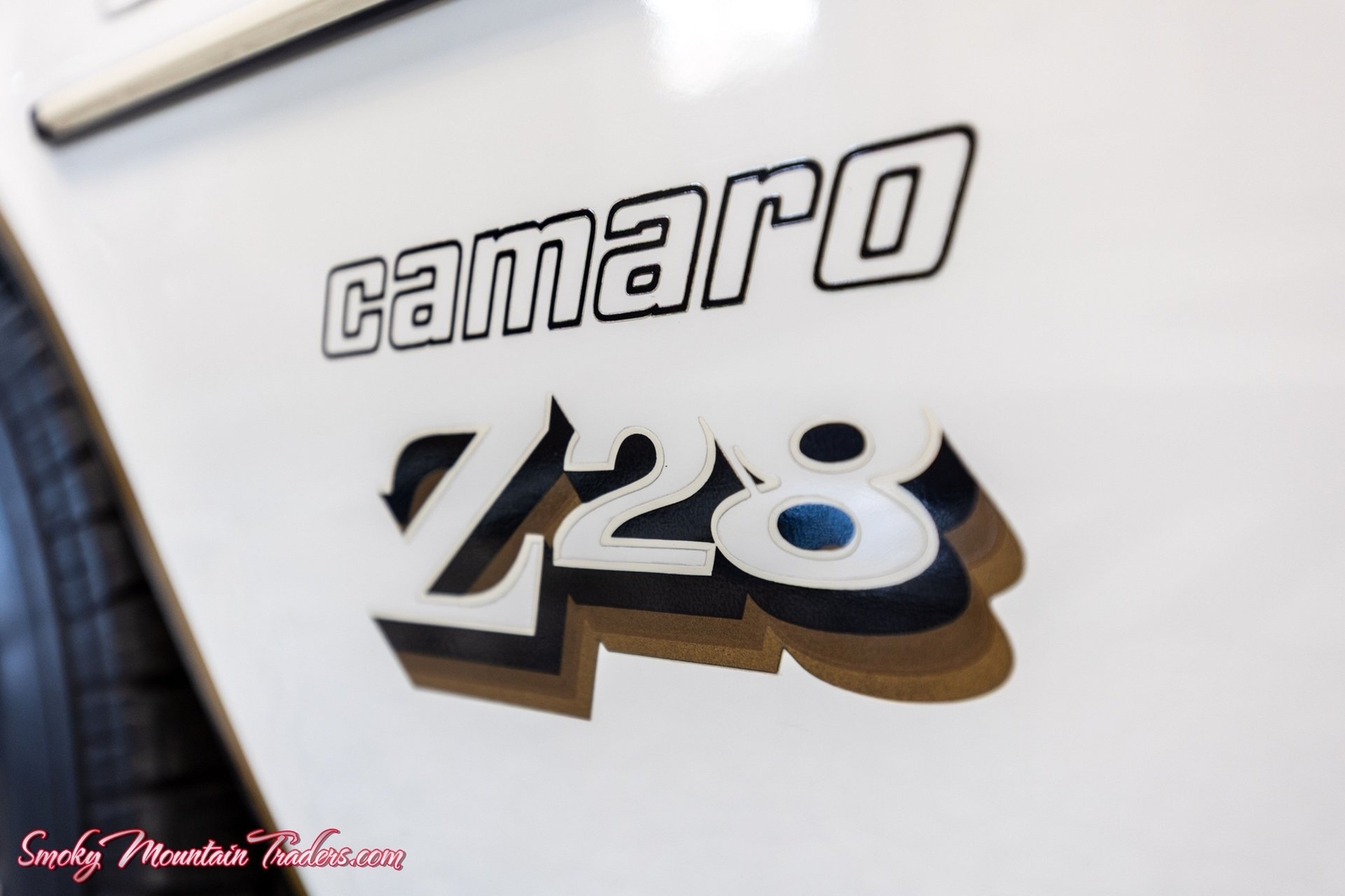 We will start with the exterior of this Camaro. This stunning 1978 Chevrolet Camaro Z28 is a true icon of late '70s American muscle, finished in a crisp white exterior that perfectly contrasts with its aggressive black and gold Z28 striping and trim accents. The paint has a beautiful finish, highlighting the car's bold lines, signature front air dam, and rear deck spoiler that define the Z28's performance-oriented styling. All the glass and weather stripping is in excellent condition as well. To finish off the look it's sitting on the color-keyed 15" Wheels with BFGoodrich Radial T/A Tires.