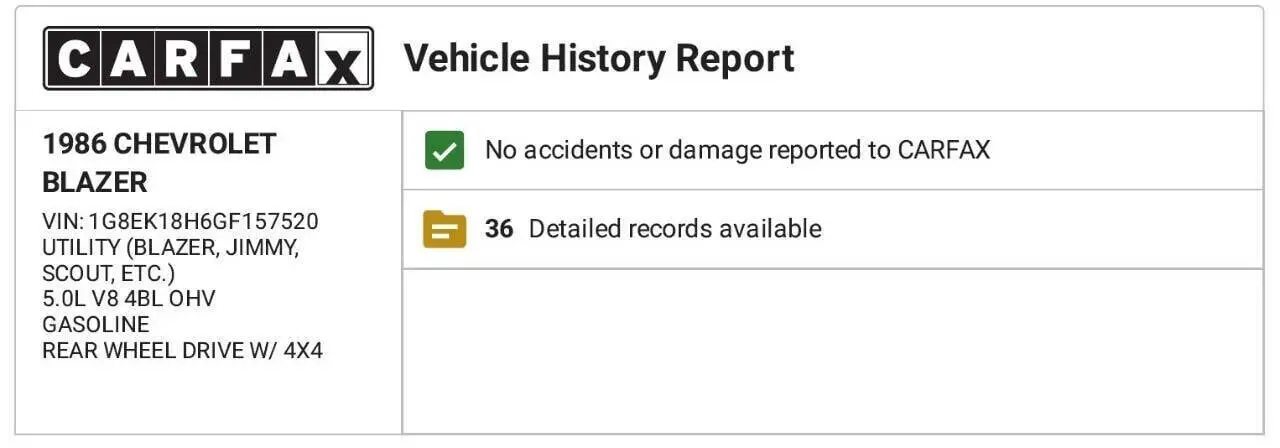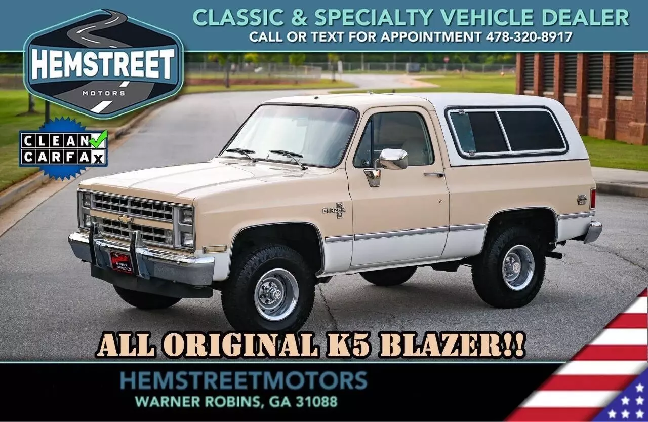 100+High resolution photos and detailed description on Affordable Nationwide shipping available! NO dealer or doc FEE's!! WE DO TRADE IN's!! WE BUY SPECIALTY Vehicles, even if you don't buy from us! 1986 Chevrolet K5 Blazer 4x4 Silverado Trim Level CLEAN CARFAX - no accidents reported 5 digit odometer shows 00,103 TONS of original paperwork from when this truck was sold NEW! NO RUST - Georgia truck all its life! FULLY LOADED with over 35 RPO CODE OPTIONS (SEE RPO STICKER) Doeskin Tan Exterior with White Bottom and white Hardtop Saddle tan deluxe cloth interior Originally came with a 305 V8 Now has a GM Goodwrench crate 350 installed 4-speed Automatic transmission with overdrive (700r4) Original 15 Rally wheels 31x10.5x15 All-terrain tires with almost new tread Power Windows and locks, ALL FUNCTIONAL (New switches & door lock actuators) Power rear window Tilt Steering Sliding rear top windows Fold down rear seat Cruise control 3.42 Front and rear gear ratio with Locking differential Automatic locking front 4wheel drive hubs Trailer package with Trailer brakes Chrome front bumper with Bumper Guards Factory Jack still in place in engine bay Factory AC blows Cold! Full inspection of all fluids: front & rear dif, trans & transfer case Brand New OEM dark brown dash pad Brand New upgraded bluetooth radio Brand New Brake master cylinder and reservoir Brand New fuel pump & fuel pump sending unit Brand New synthetic oil change Brand New spark plugs! Brand New AC compressor and Condensor! (AC blows ICE cold) This full-size K5 Blazer is in excellent condition. Sold new in Georgia and has remained here all of its life, and it shows as it is rust free. I have photos & videos of every lower body panel where these trucks normally show signs of rust. There are no bubbles or surface rust on this truck. It runs and drives great, tracks straight going down the road and is alot of fun to drive. I have personally taken this K5 on a 3 hour trip with no problems, as well as alot of around town driving. We have performed a full inspection on this truck, as we do with all of our vehicles, but most dealers don't. We have also performed several repairs and have gotten everything working correctly on the truck, including: all gauges, all power windows, all power door locks, all lights & mechanically we have made some repairs and performed some maintenance on the truck. This is a turn key truck that you can get in and drive and enjoy right now! We are proud of our 5 years of 5 star reviews on Google and put in the extra time, effort and love to these vehicles that others just don't do. Buyer from a dealer you can trust! We are located in Warner Robins, GA just outside of Robins Air Force Base. We offer nationwide shipping with delivery straight to your driveway (at great prices!!), live walk around video's & underside photos are available, full online/electronic paperwork and buying process and can even assist you with financing on our collector & classic vehicles! Competitive rates, 10% downpayment and LONG terms up to 15 years on our classic and collector cars for super low monthly payments. We are here to answer any questions you may have and make long distance or in person purchases a pleasant experience. 115 point inspection & mechanical and/or cosmetic issues fixed on every car we sell. No dealer upcharges or Fee's of any kind. GA residents required to pay TAVT & $43 tag/title at time of sale.