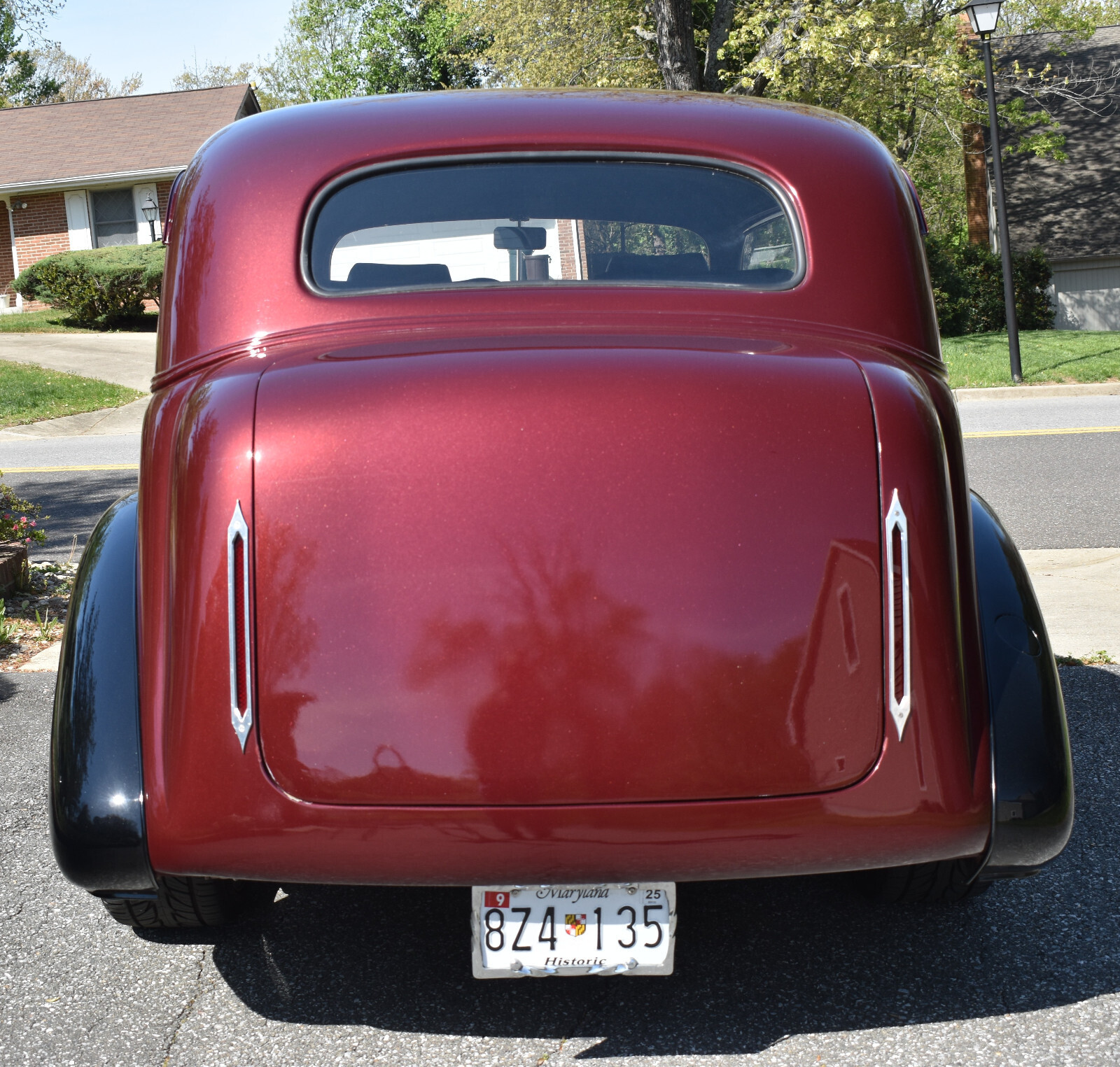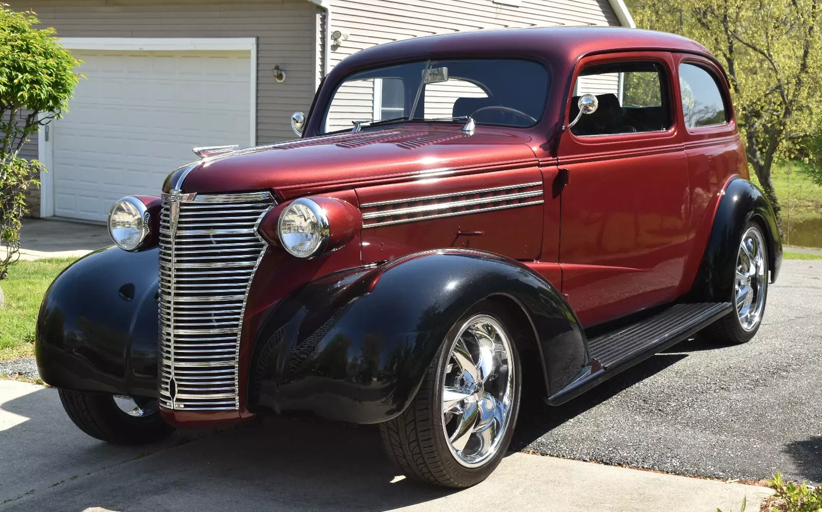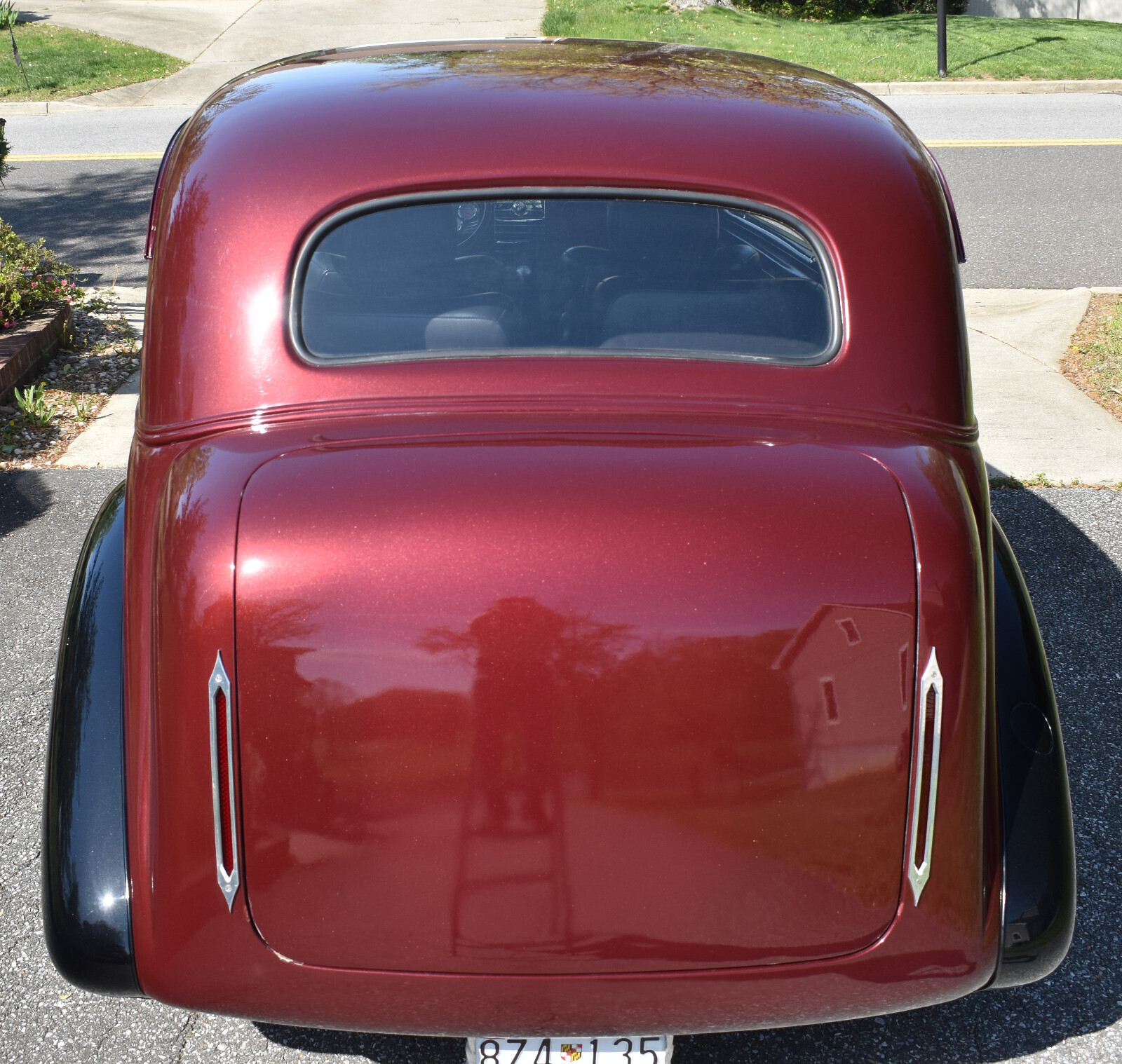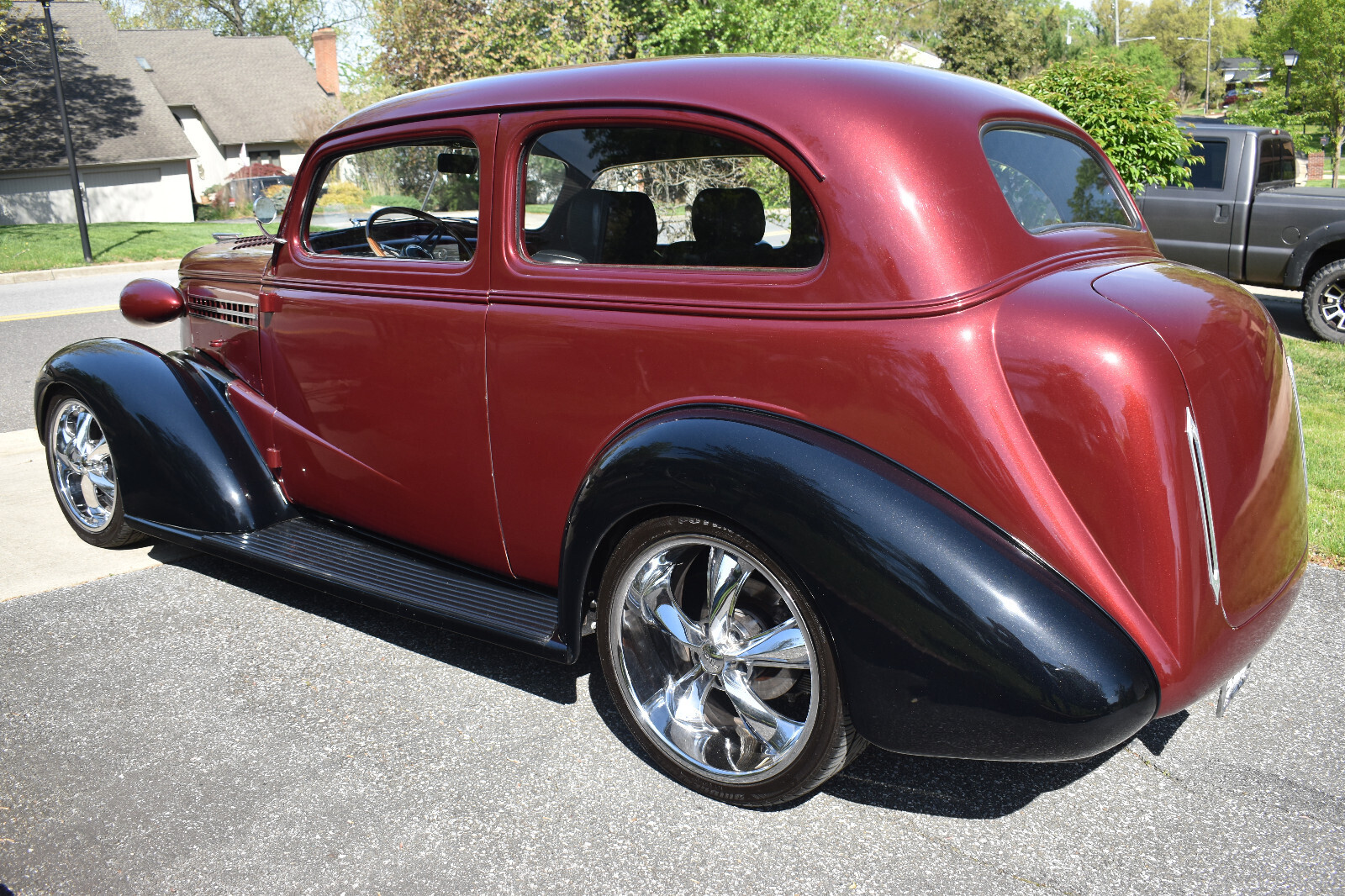 1938 Chevrolet Master Deluxe 2-Door sedan ALL STEEL, Street Rod/Hot Rod in a beautiful burgundy metallic with black fenders. Power comes from a 350 cu. in. Chevrolet engine with Vortec heads, backed by a 700R4 4-speed automatic transmission, and 9” Ford rear. This is an older build but shows very well, starts easily, and runs great. A red and black vinyl custom interior with bucket seats compliments the exterior. Odometer indicates it has only been driven 2100 miles in approximately 10 years.