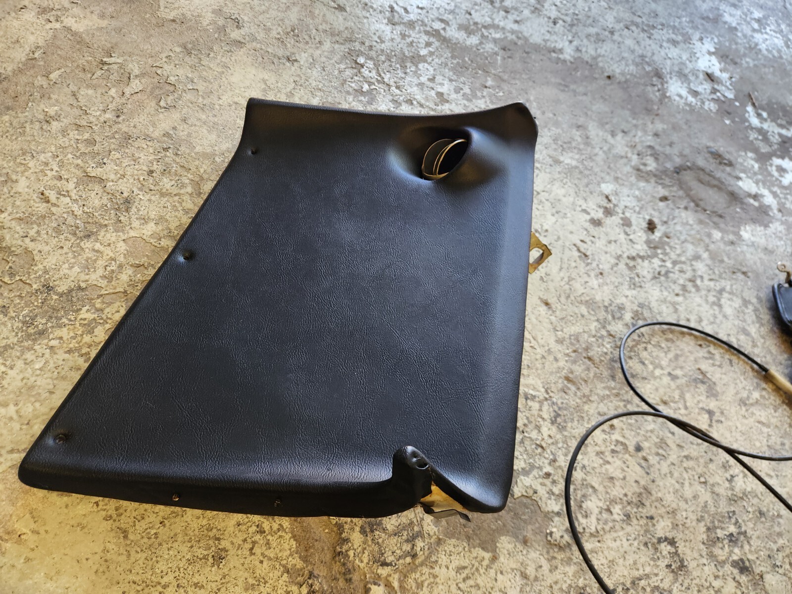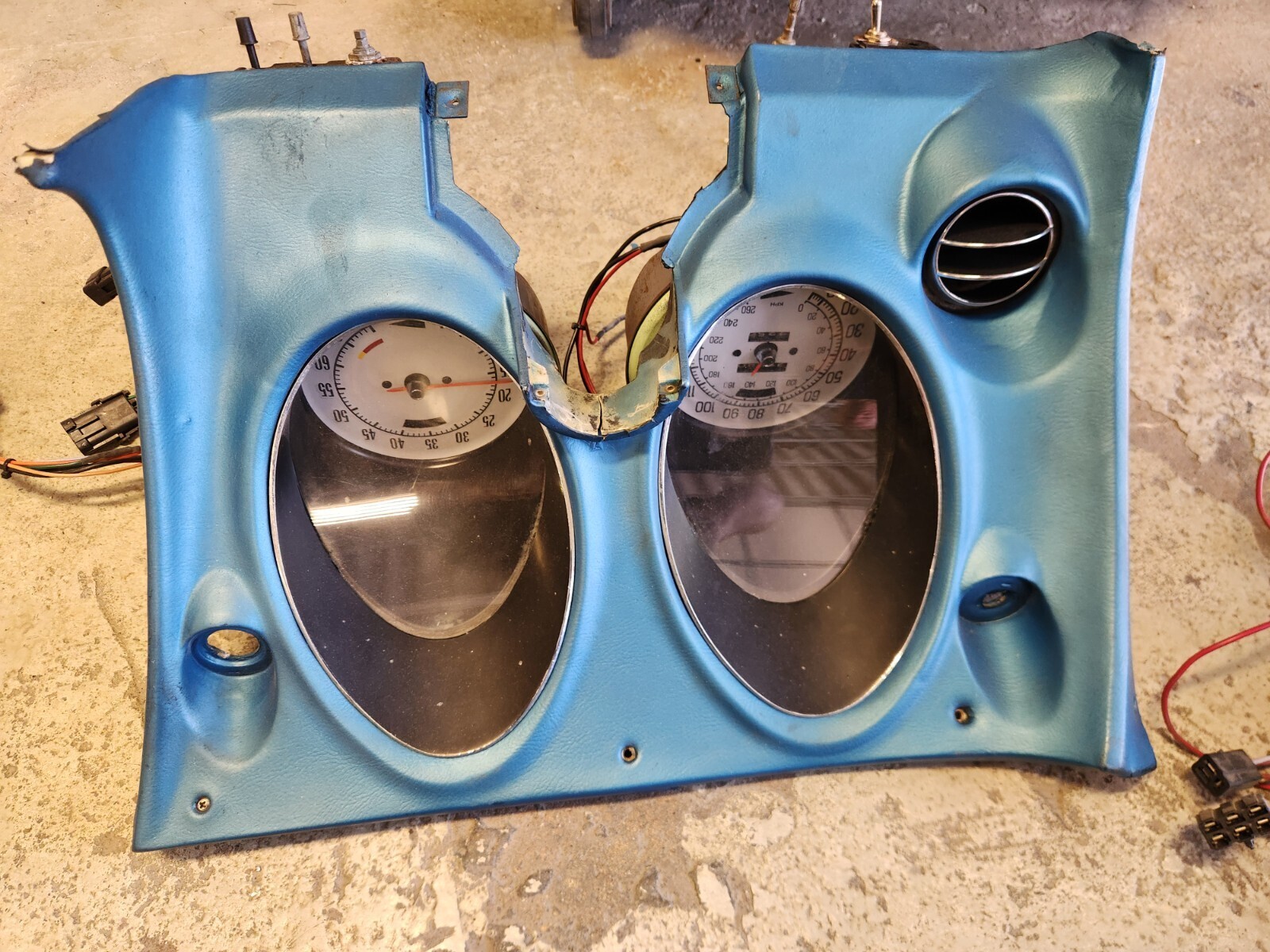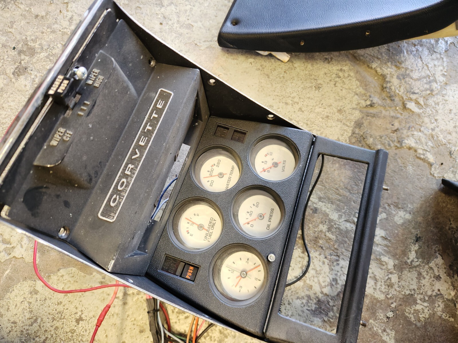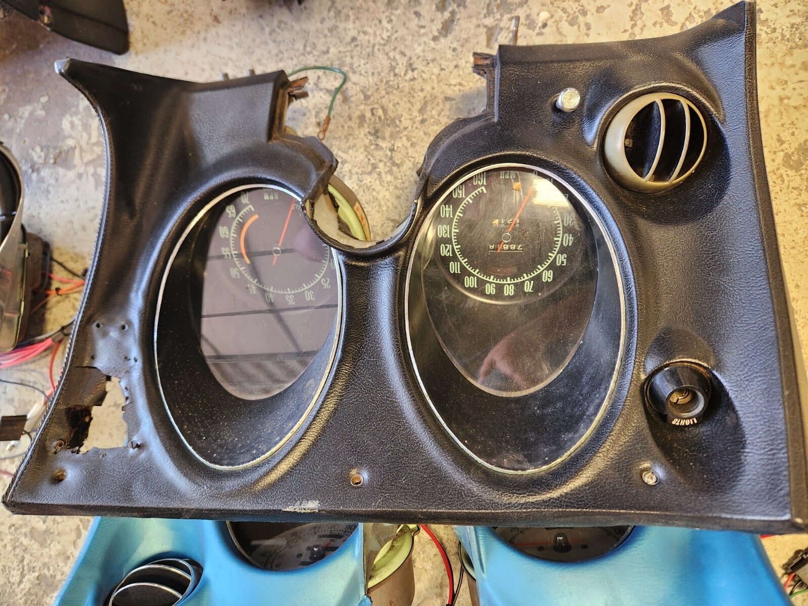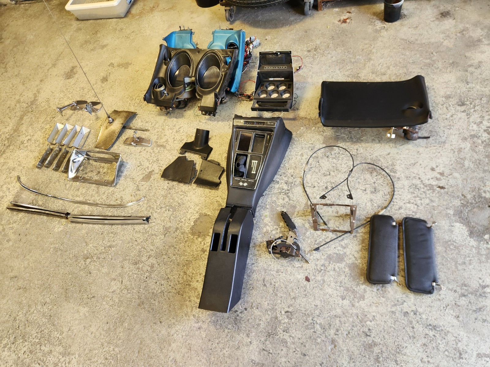 Interior includes 1969 style seats with headrests. Consoles included as shown. Center gauge cluster with white faced gauges. Two speedometer/tachometer clusters included, one with white face gauges in correct 1968 blue dash panel and the other in modified black dash panel. Correct 68 passenger dash panel included and top dash pad as well. One door panel is original and the other is a reproduction. Carpet not included.