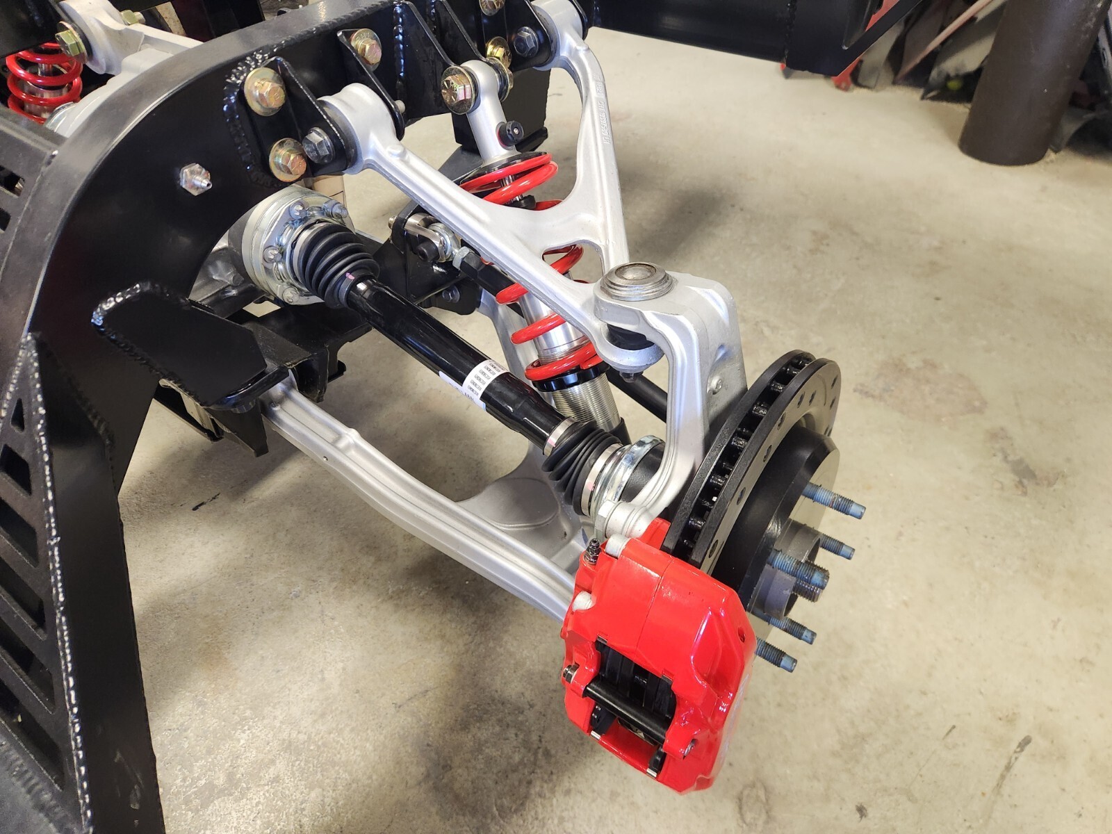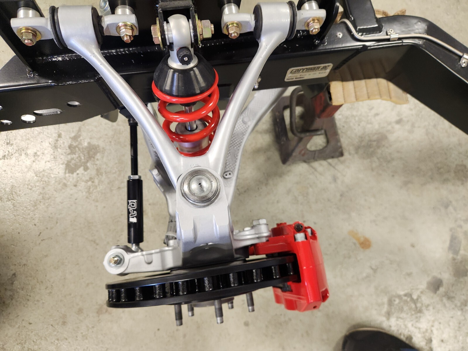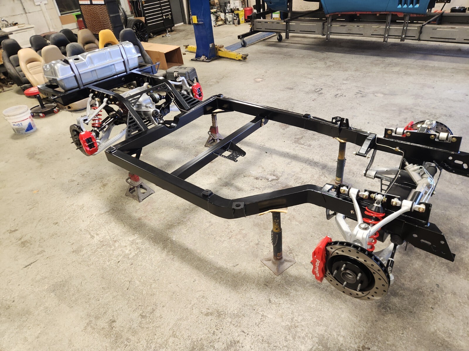 Coffman chassis (Powdercoated) includes Wilwood Brakes and T-Bird rack and pinion steering. Also includes a DANA 44 3.73 ratio differential with custom cover, custom subframe. Coffman uses C6 and C7 steering and suspension components with C8 axles. Coil over suspension allows for full adjustment.