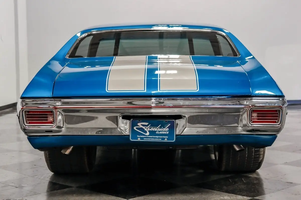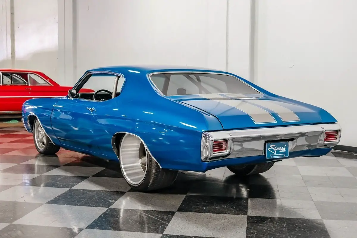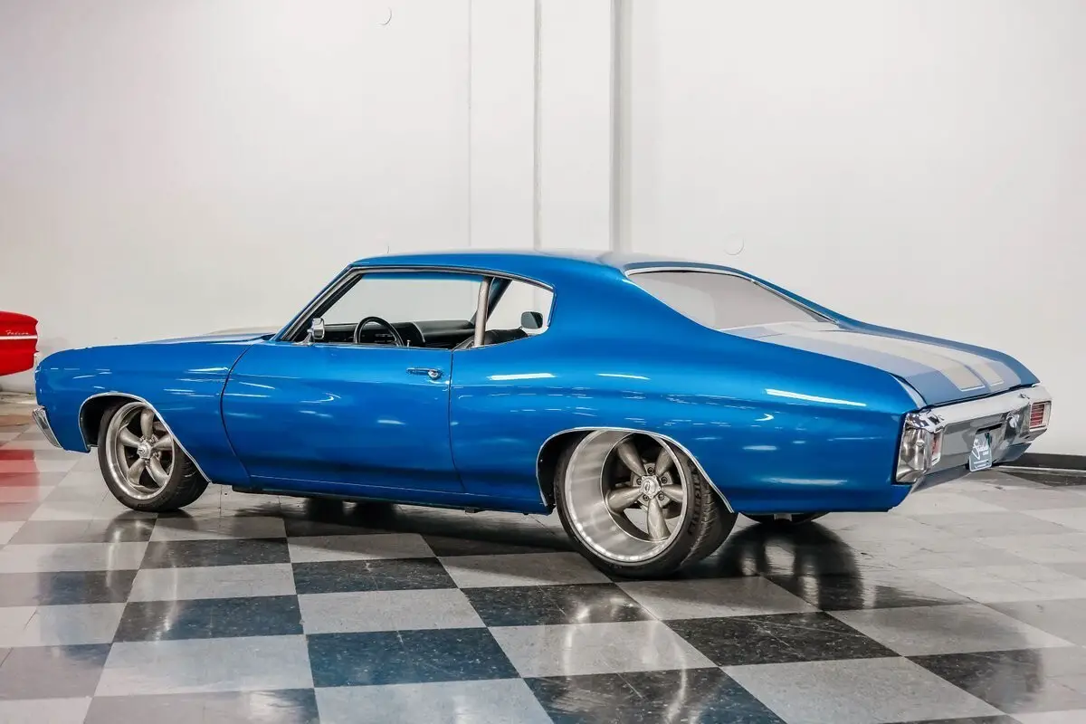 This 1972 Chevrolet Chevelle Malibu Pro Touring underwent a transformation with a 1970 Chevelle front and rear conversion. The blue metallic paint creates a powerful presence, accented by silver racing stripes. The modified profile features aluminum hood pins and deep-tinted glass. The stance comes from staggered Coys wheels - 18-inch front and massive 20-inch rear, wrapped in Michelin rubber (245/40ZR18 front, 345/30ZR20 rear).