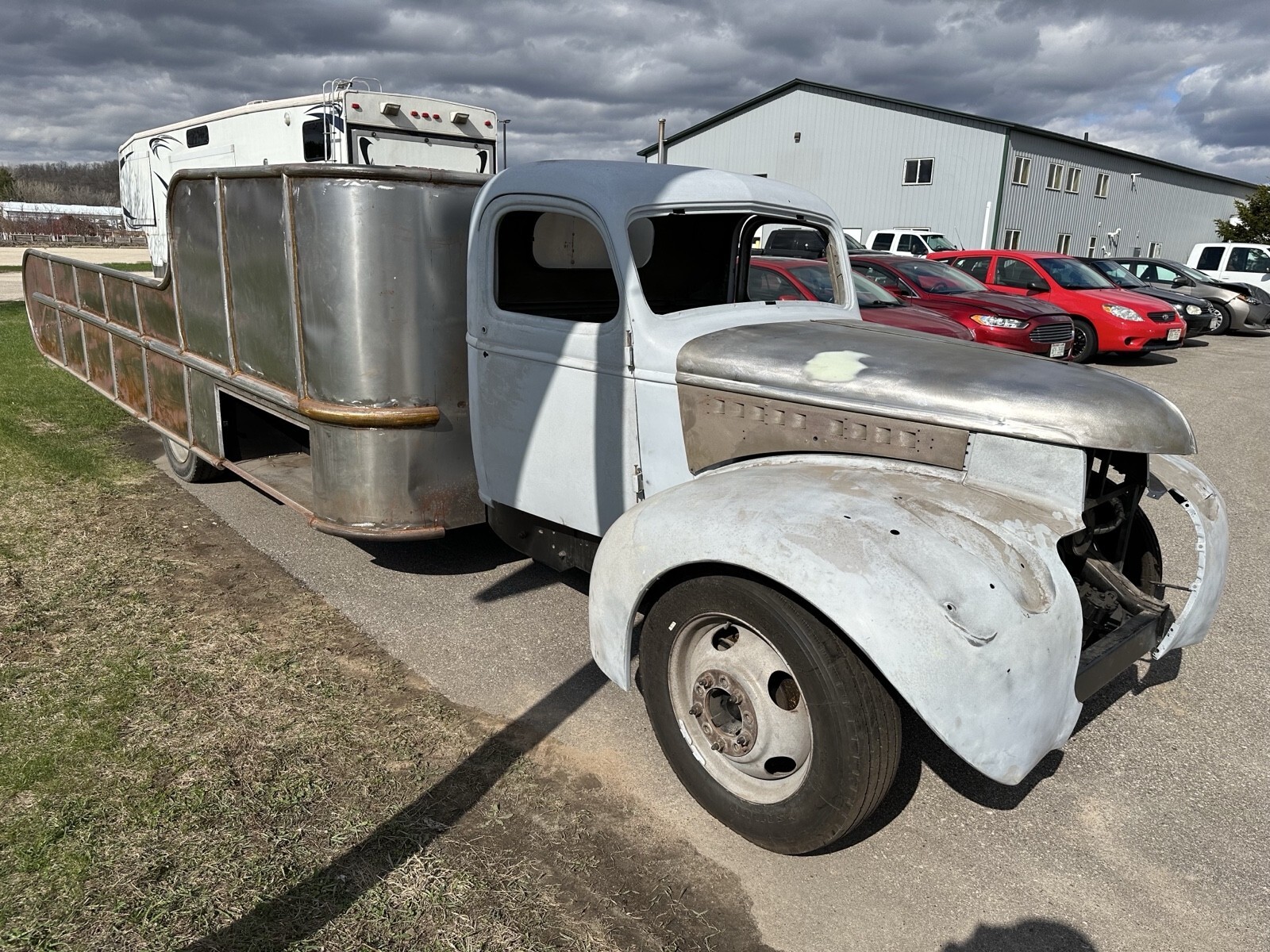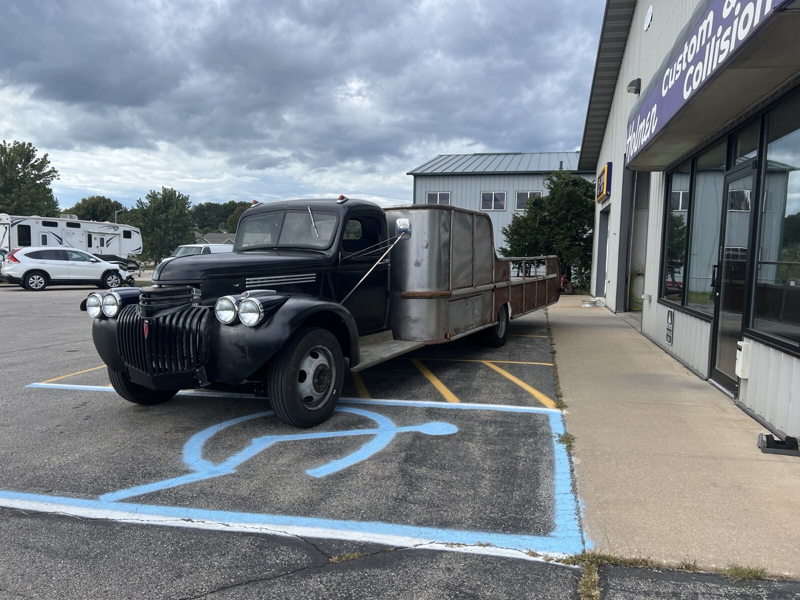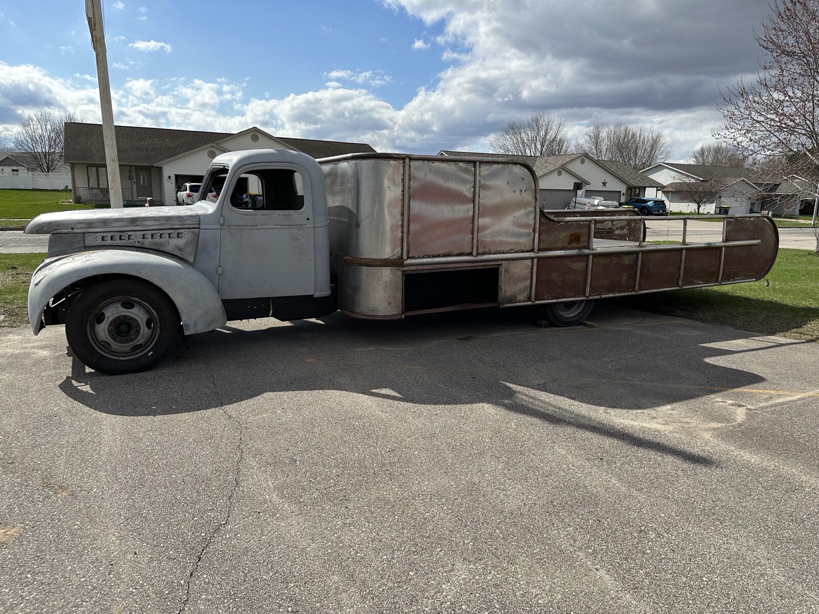 Project started over 20 years ago. 1946 Chevy mounted to a 2000 GMC frame, 7.4 big block engine 4L80 E Orginal 34,000 miles cut away Was a U-Haul vehicle for just over a year 21 foot car trailer installed on the back with homemade sides Everything underneath the 1946 is all 2000 gmc except the radiator and throttle cable Vehicle is currently running and just did 560 miles to ratstock first time it ran in over 20 years. Vehicle is not 100% completed take it in any direction you want Has air ride suspension It currently has ramps for loading or it can be used as a tilt bed the pivot is in place but the hydraulic ram is not 4 tires have 30,000 miles miles 2 are brand new Zero rust on the frame Everything under the truck looks brand new The body was rust free The body work has been started is 90% done and all is in approxy premier now The headlights are custom made, you wont find another pair like them