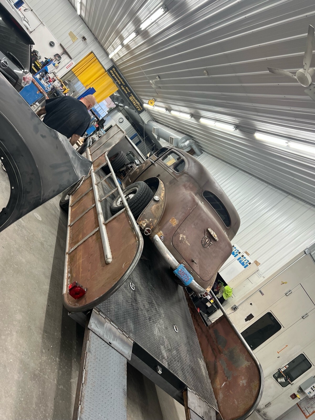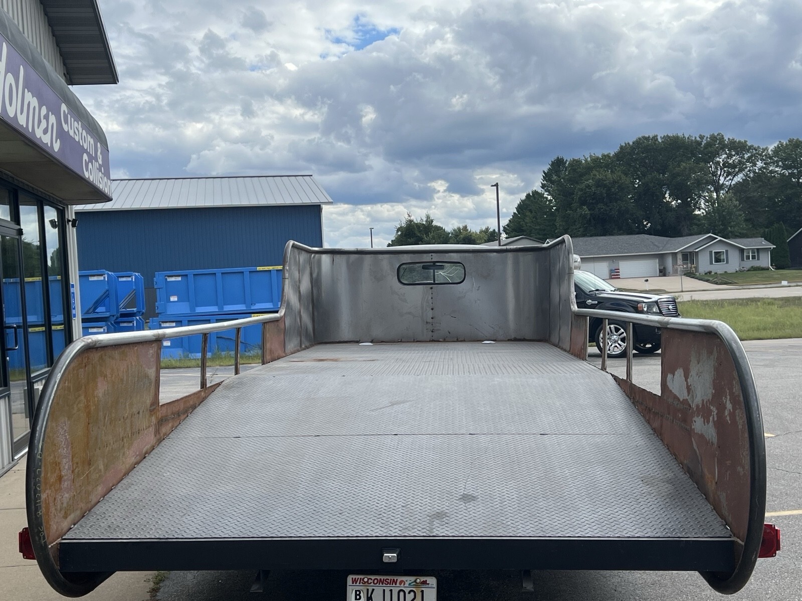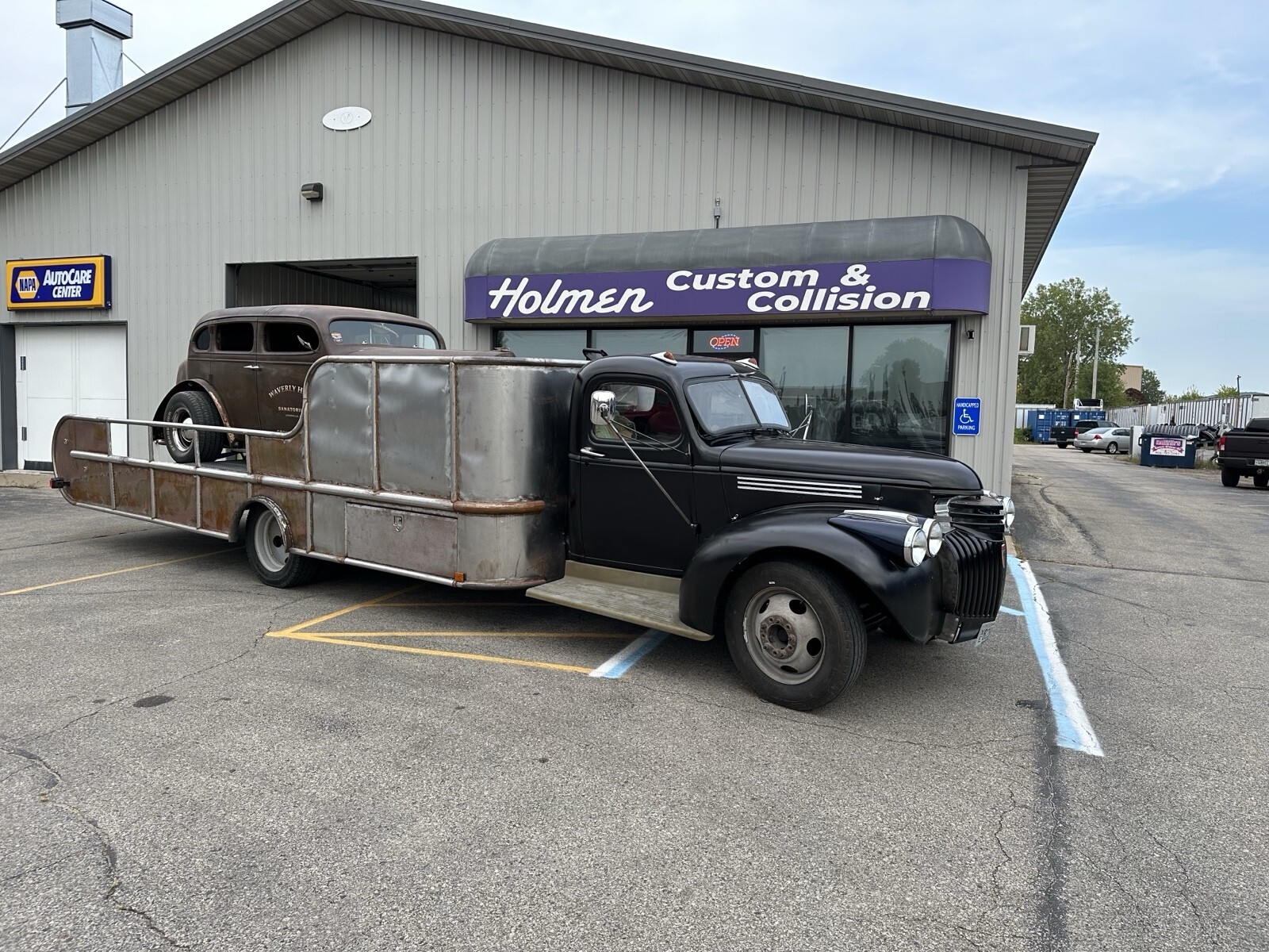 Project started over 20 years ago. 1946 Chevy mounted to a 2000 GMC frame, 7.4 big block engine 4L80 E Orginal 34,000 miles cut away Was a U-Haul vehicle for just over a year 21 foot car trailer installed on the back with homemade sides Everything underneath the 1946 is all 2000 gmc except the radiator and throttle cable Vehicle is currently running and just did 560 miles to ratstock first time it ran in over 20 years. Vehicle is not 100% completed take it in any direction you want Has air ride suspension It currently has ramps for loading or it can be used as a tilt bed the pivot is in place but the hydraulic ram is not 4 tires have 30,000 miles miles 2 are brand new Zero rust on the frame Everything under the truck looks brand new The body was rust free The body work has been started is 90% done and all is in approxy premier now The headlights are custom made, you wont find another pair like them
