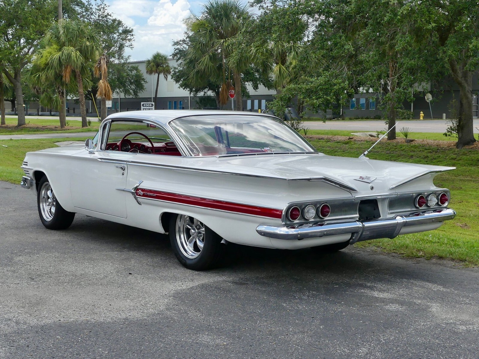 This Impala is finished in a fresh Ermine White paint job with lots of chrome trim and brightwork plus a beautiful red accent on the quarterpanels. She sits on a sweet set of 17in American Racing Torq Thrust polished alloy wheels wrapped in low profile tires. Out back you will find what is arguably the best looking set of tail lights to ever grace an automobile. Also included are a set of