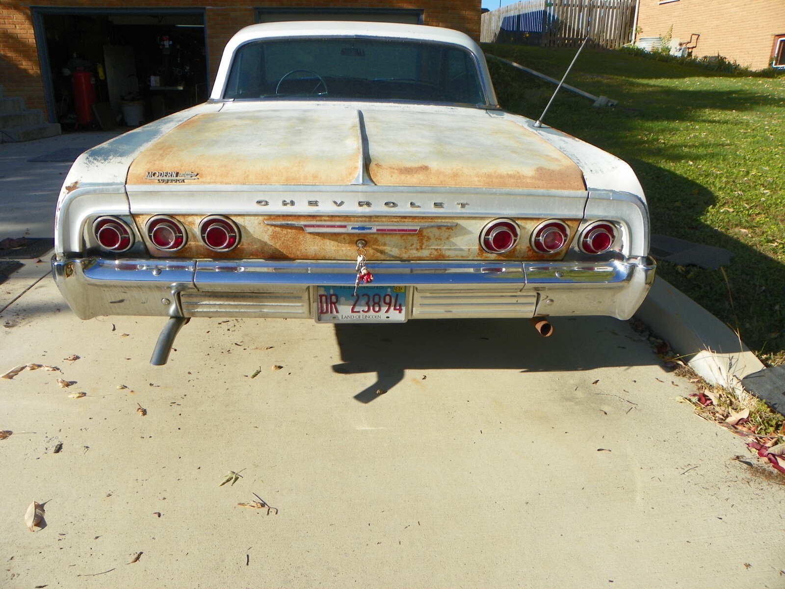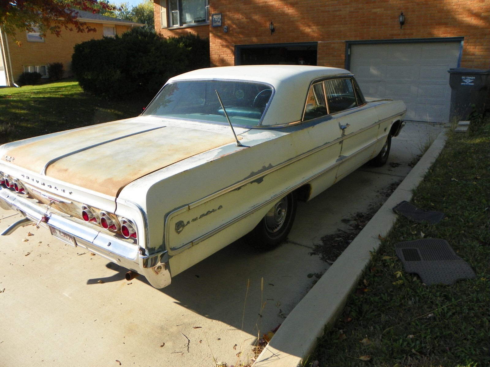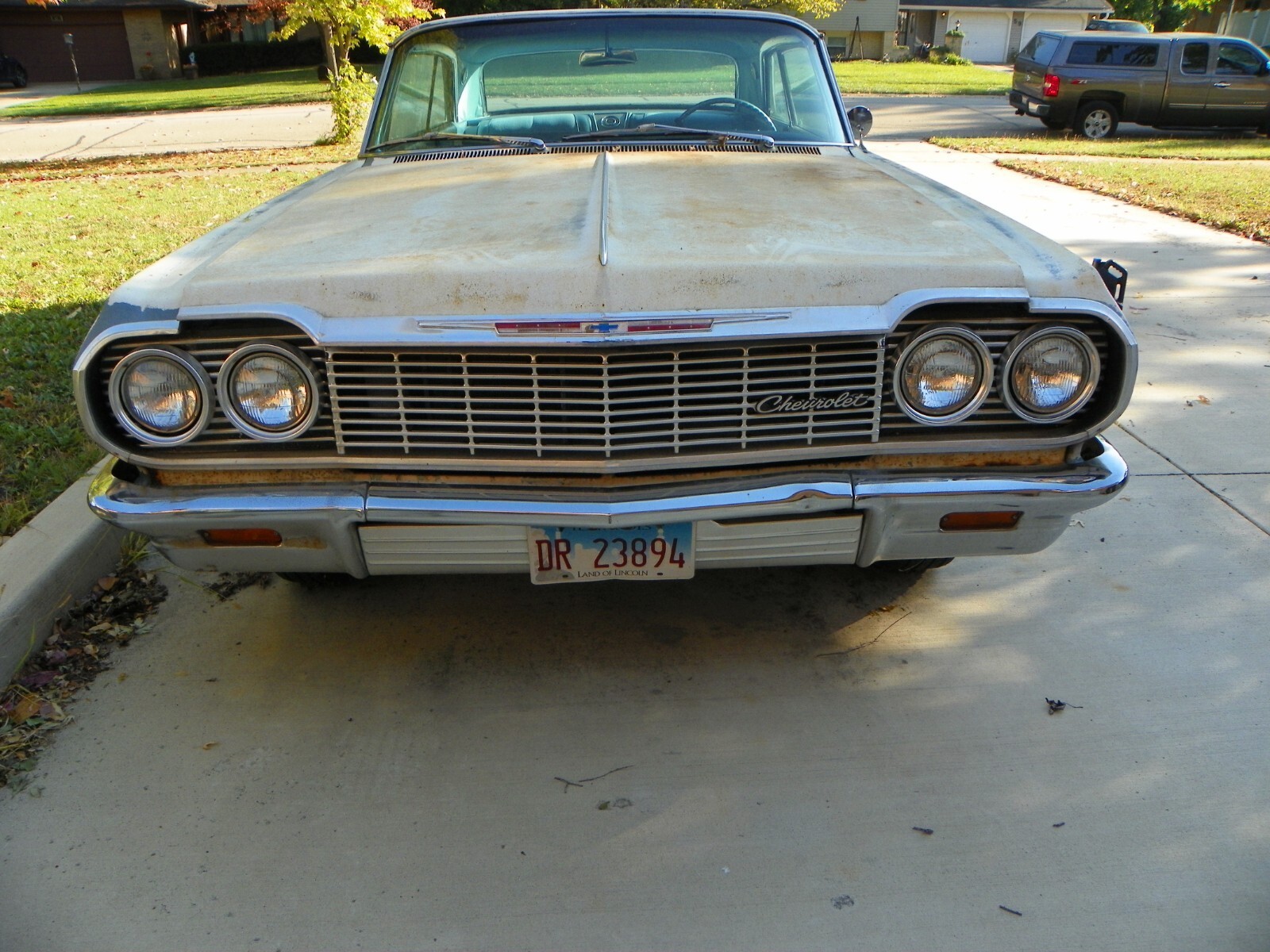 This is a complete 1964 Impala with the original 327 V8and original auto transmission, It is a 4 barrel and power steeringand power brakes. This car starts up and you can drive it. I wouldnot want to go more than 30 or 40 miles because the front end needsto be worked on. In the last two years it has been driven about6,000 miles back and forth to work at no more than 55 MPH.This was a California car when new. It was originally a Silver Bluecar and has had a quick White paint job years ago. Motor needswork, it uses oil. Floors and floor braces are still solid, no need toreplace floors. Trunk has three tiny pin holes other wise very solid.The car was hit in the quarter on the drivers side and still needs work.No rust repairs on any part of the car. This is a factory air car. The partsare not on the car but come with it. Any questions, call 630-559-5139Tired of seeing rusty junk without a motor, come and drive this and startthe restoration. Also, if you are interested in buying the original Chevroletdealer showroom poster, 40" X 60" that is pictured, call. It is like NEW.Just added under photos, I did not have a lift to use. floors and bracehave .no rust.