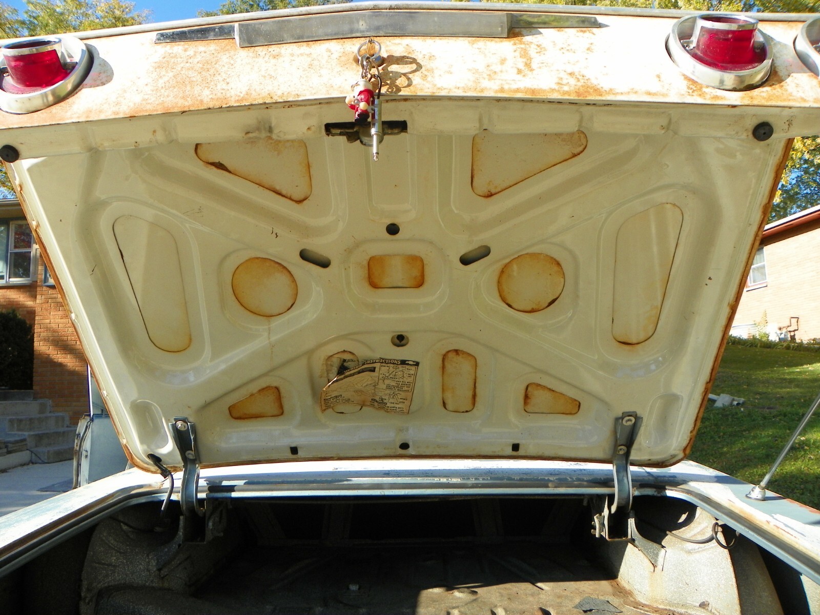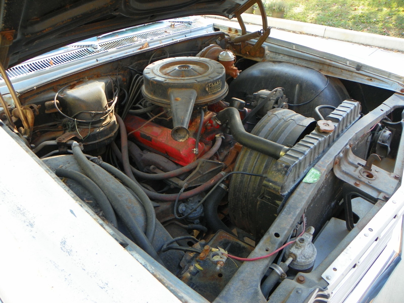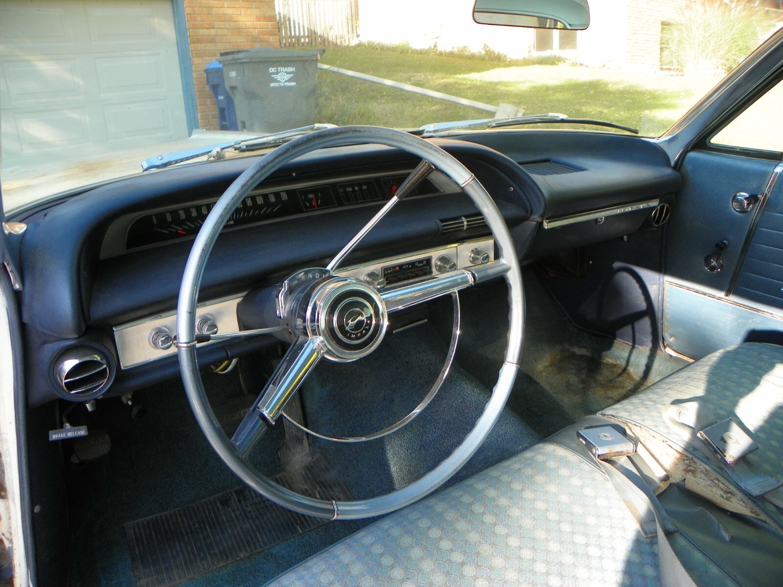 This is a complete 1964 Impala with the original 327 V8and original auto transmission, It is a 4 barrel and power steeringand power brakes. This car starts up and you can drive it. I wouldnot want to go more than 30 or 40 miles because the front end needsto be worked on. In the last two years it has been driven about6,000 miles back and forth to work at no more than 55 MPH.This was a California car when new. It was originally a Silver Bluecar and has had a quick White paint job years ago. Motor needswork, it uses oil. Floors and floor braces are still solid, no need toreplace floors. Trunk has three tiny pin holes other wise very solid.The car was hit in the quarter on the drivers side and still needs work.No rust repairs on any part of the car. This is a factory air car. The partsare not on the car but come with it. Any questions, call 630-559-5139Tired of seeing rusty junk without a motor, come and drive this and startthe restoration. Also, if you are interested in buying the original Chevroletdealer showroom poster, 40" X 60" that is pictured, call. It is like NEW.Just added under photos, I did not have a lift to use. floors and bracehave .no rust.