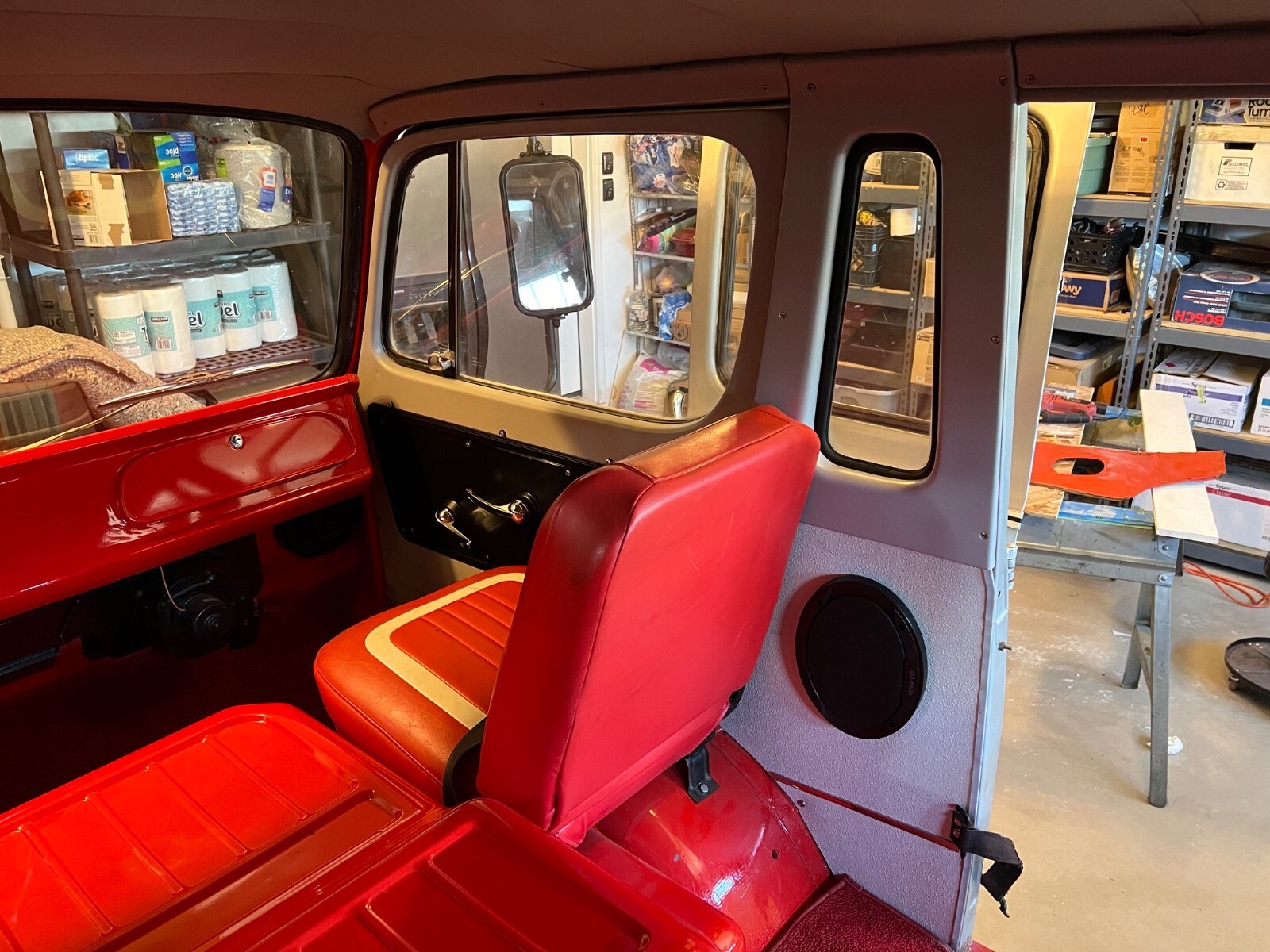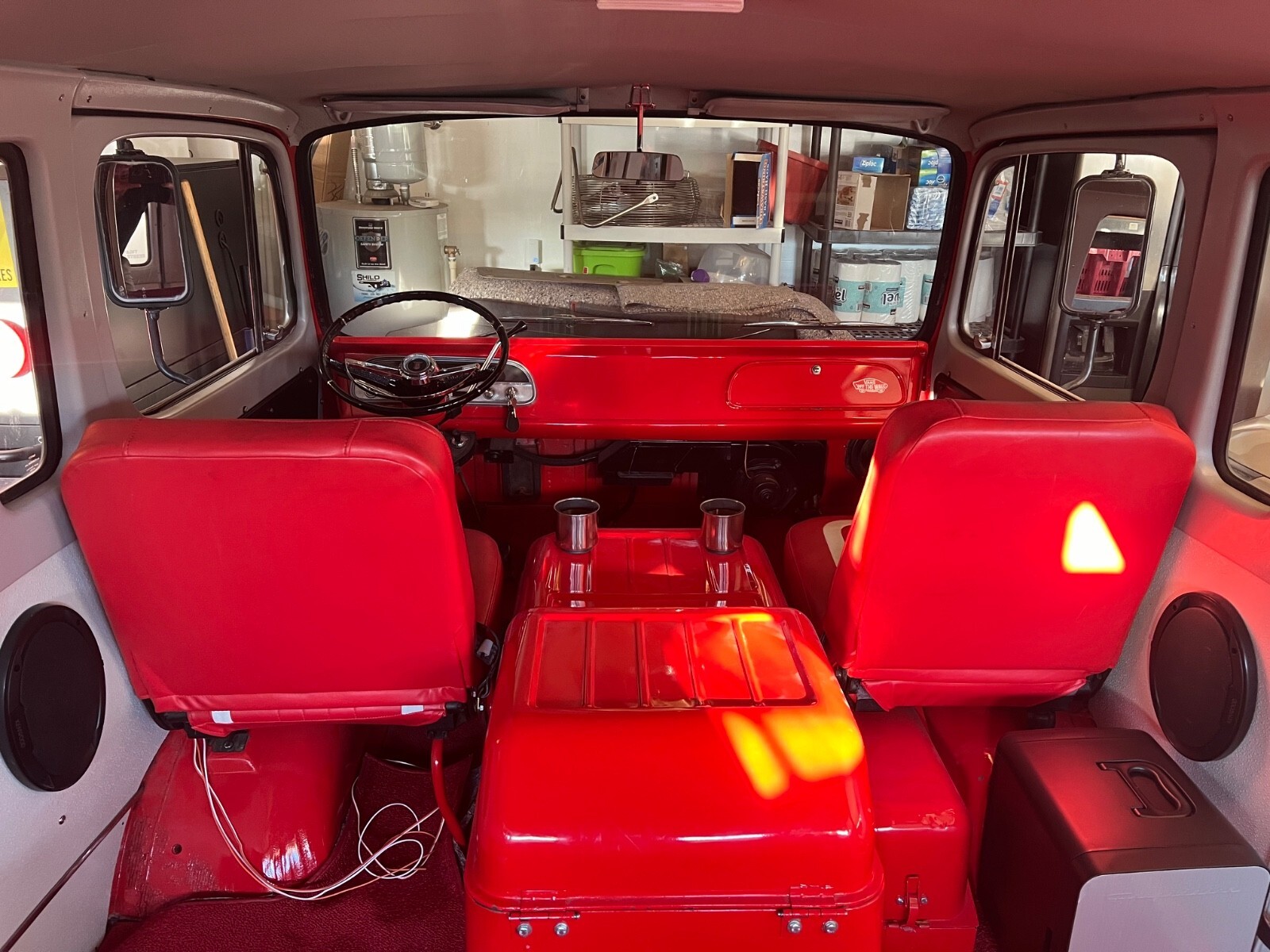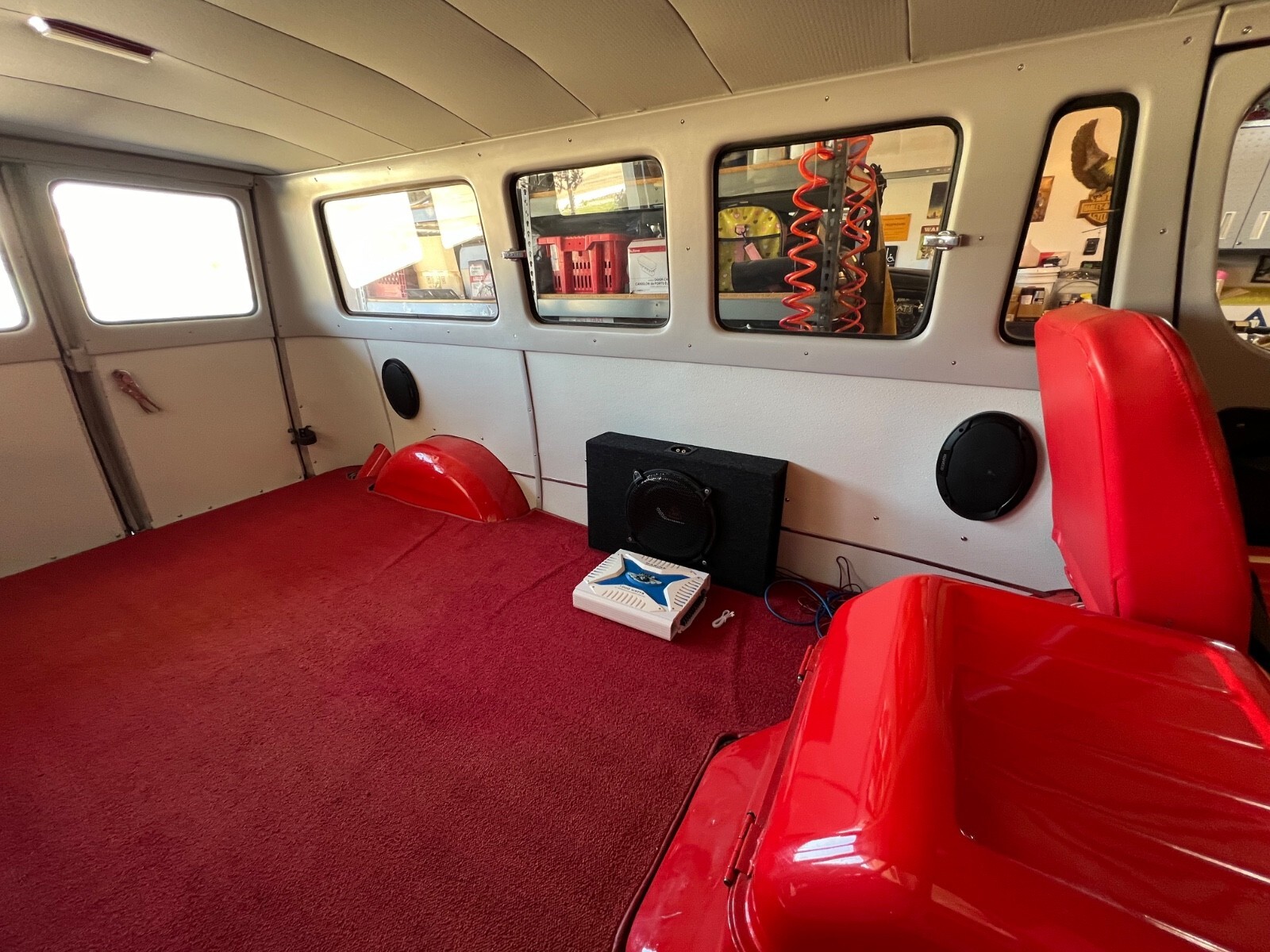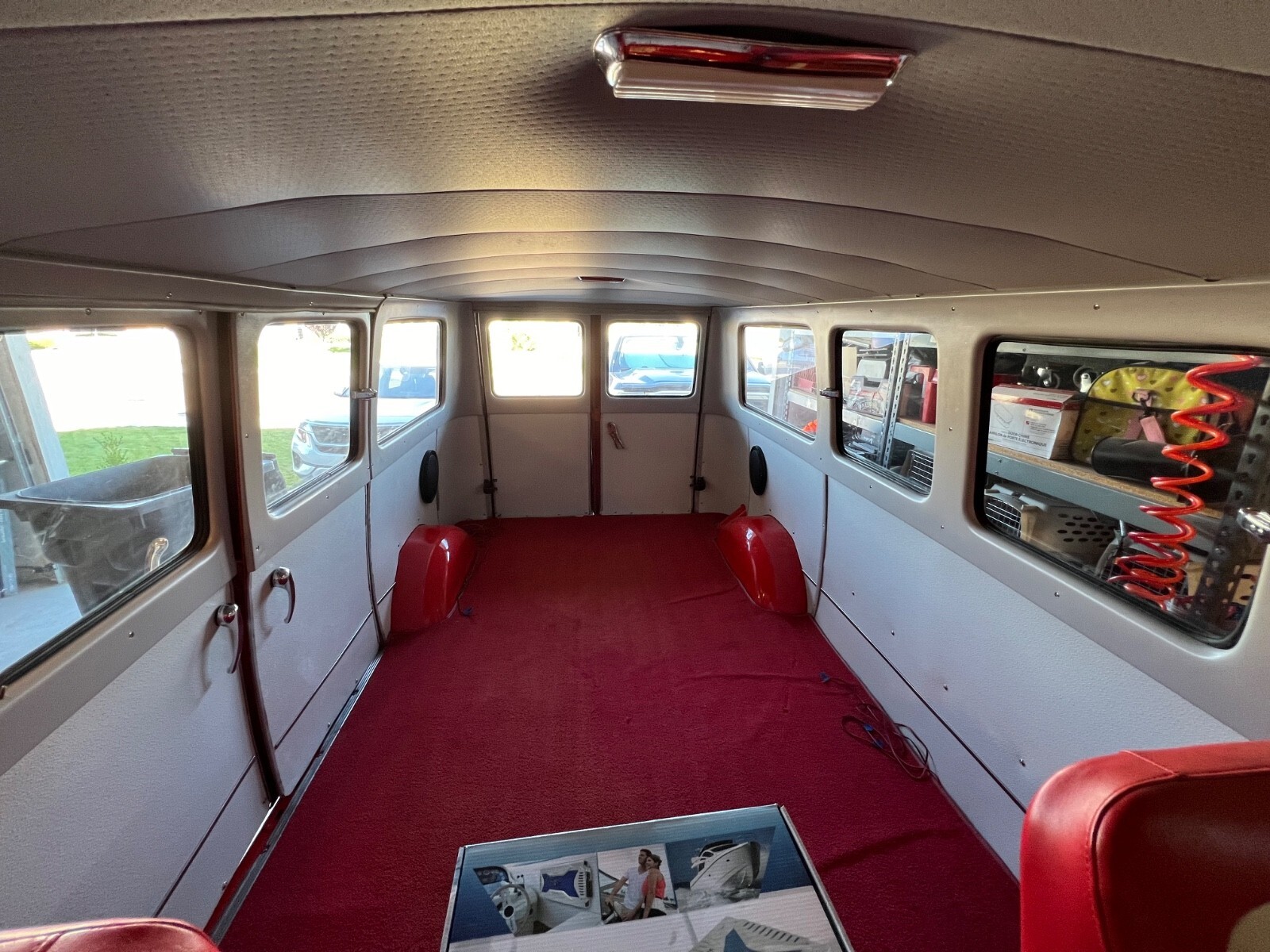 Fully Carpeted, with padding, Newer Upholstery on all seats and bench, Lap belts installed, Dash, floor, doghouse, etc. painted, dash radio delete, New Head liner, Fully insulated walls, and solar insulated ceiling, Two tone interior, grey and red combo, lower panels are a fiberglass used in commercial bathrooms, easy to clean, moisture and mold resistant. All top molded panels are original in great shape. New early old style 60's chevy Steering wheel 15", All new Stereo system 1000amp 4channel bluetooth (just hit play on your phone instead of a deck) with 4 three way 6x9 pioneer speakers. Stereo wired separate from vehicle wiring.