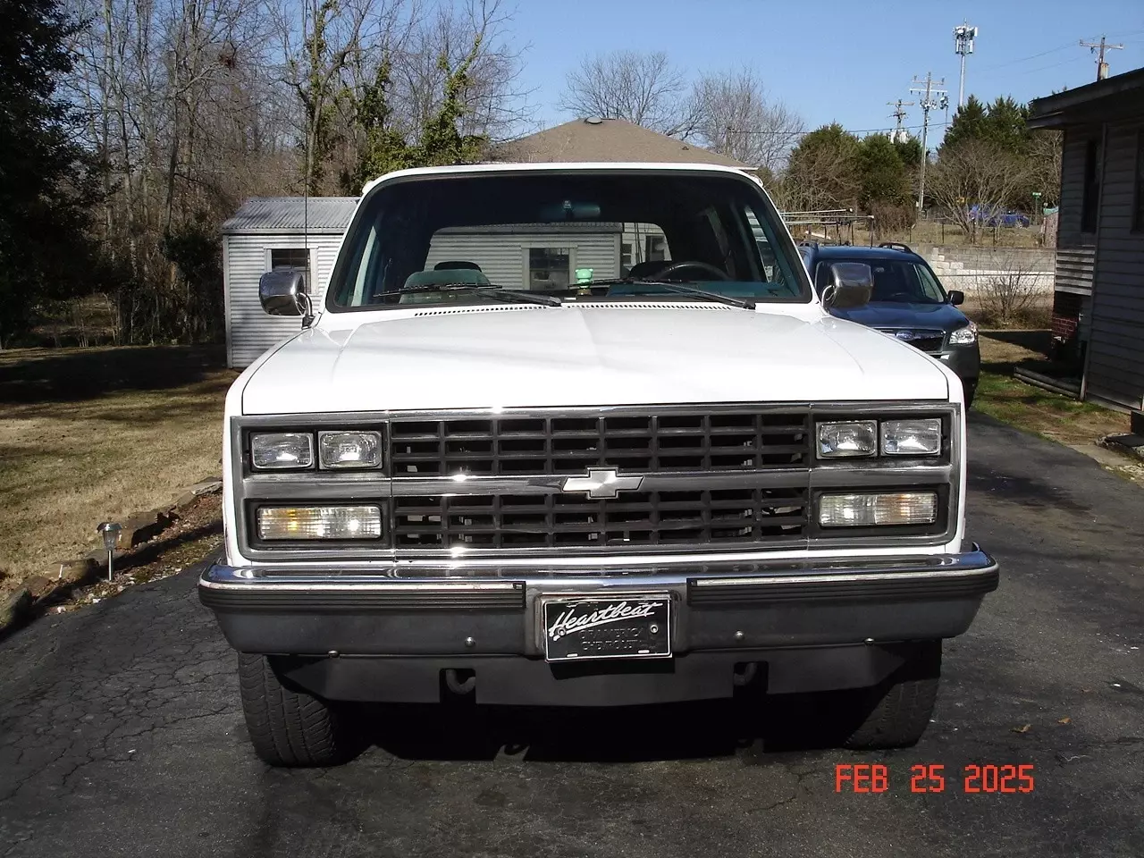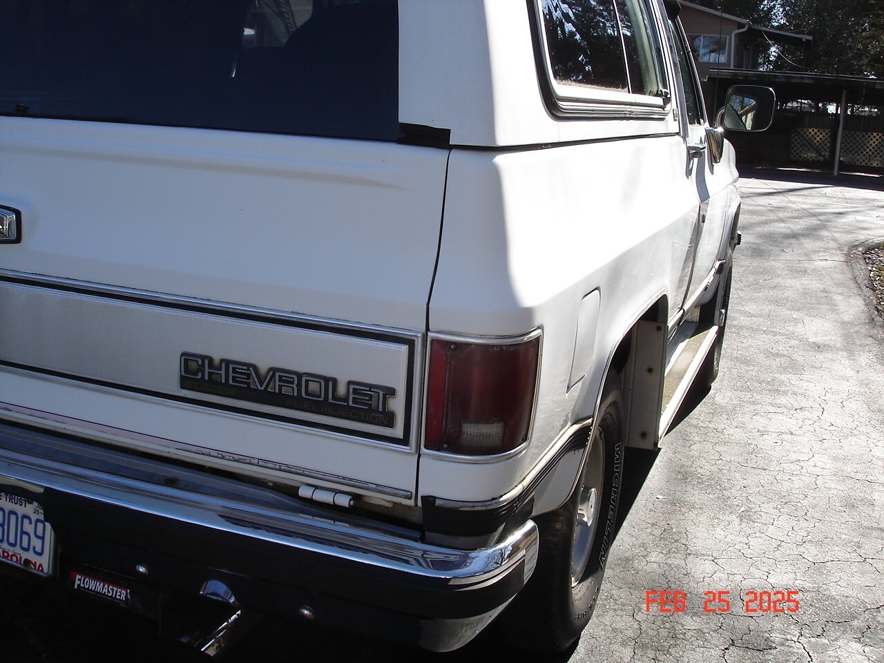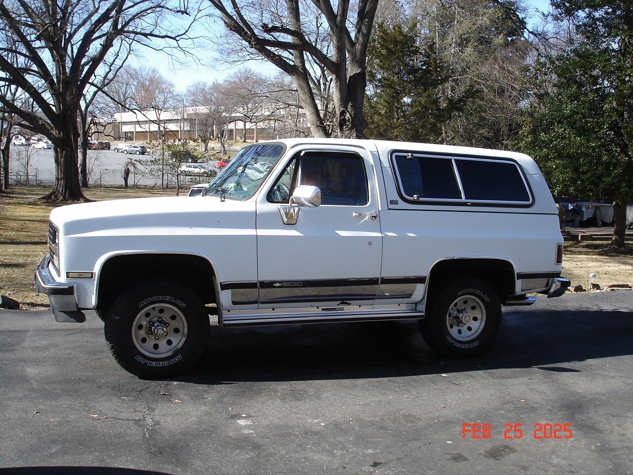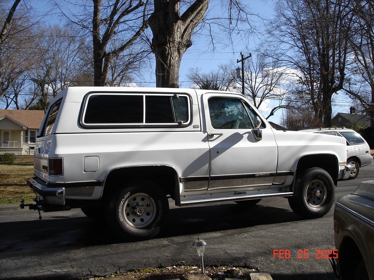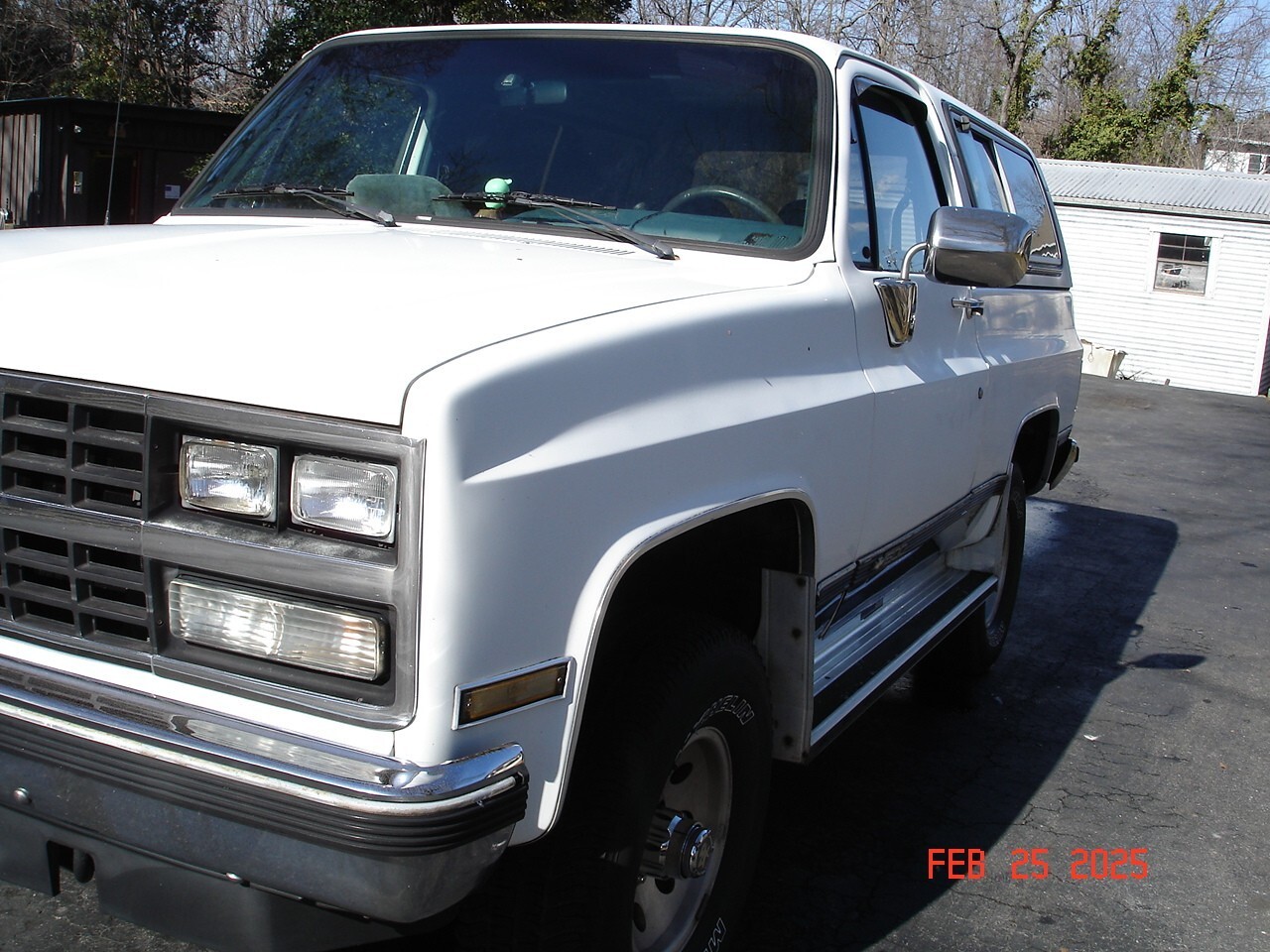 The 1989 Chevrolet Blazer with running boards has a blue interior and white exterior and is a classic SUV featuring a 5.7L V8 engine, automatic transmission, and is a 4WD drive. This vehicle is a 1 owner and has a mileage of 194,500. It comes with various features such as power windows, air conditioning (does not work), cruise control, radio with cassette player (does not work) and a trailer hitch. The Blazer also has cloth seats, a tilt steering wheel, and power steering, making it a comfortable and versatile option for off-road adventures or everyday use. It is a true square-body classic with all original features including the spare tire that has never been used, user manual and strong mechanical performance. It is perfect for collectors, off-roaders (even though it has never been off road), or for restoration enthusiasts. The removeable top has never been removed!