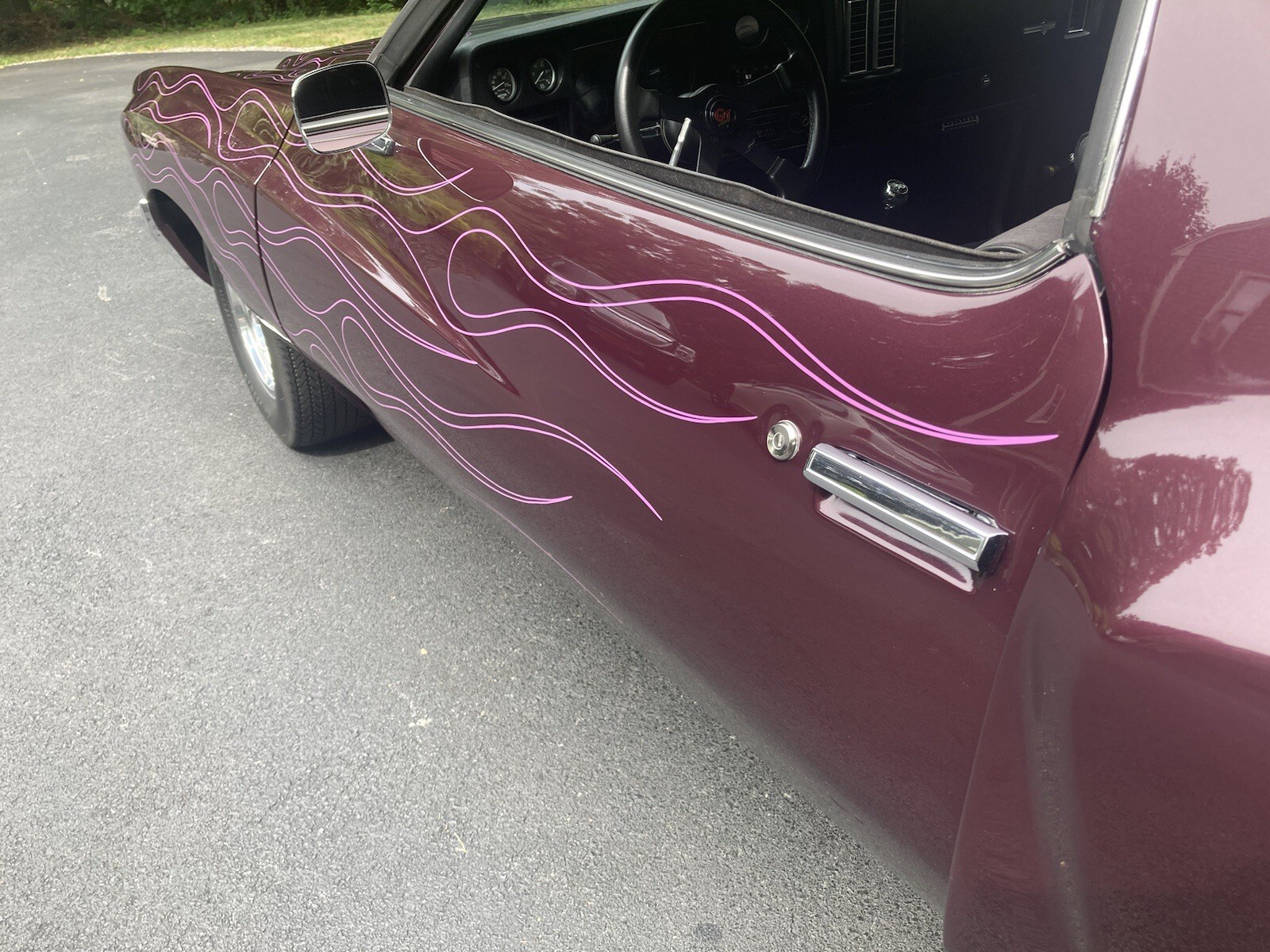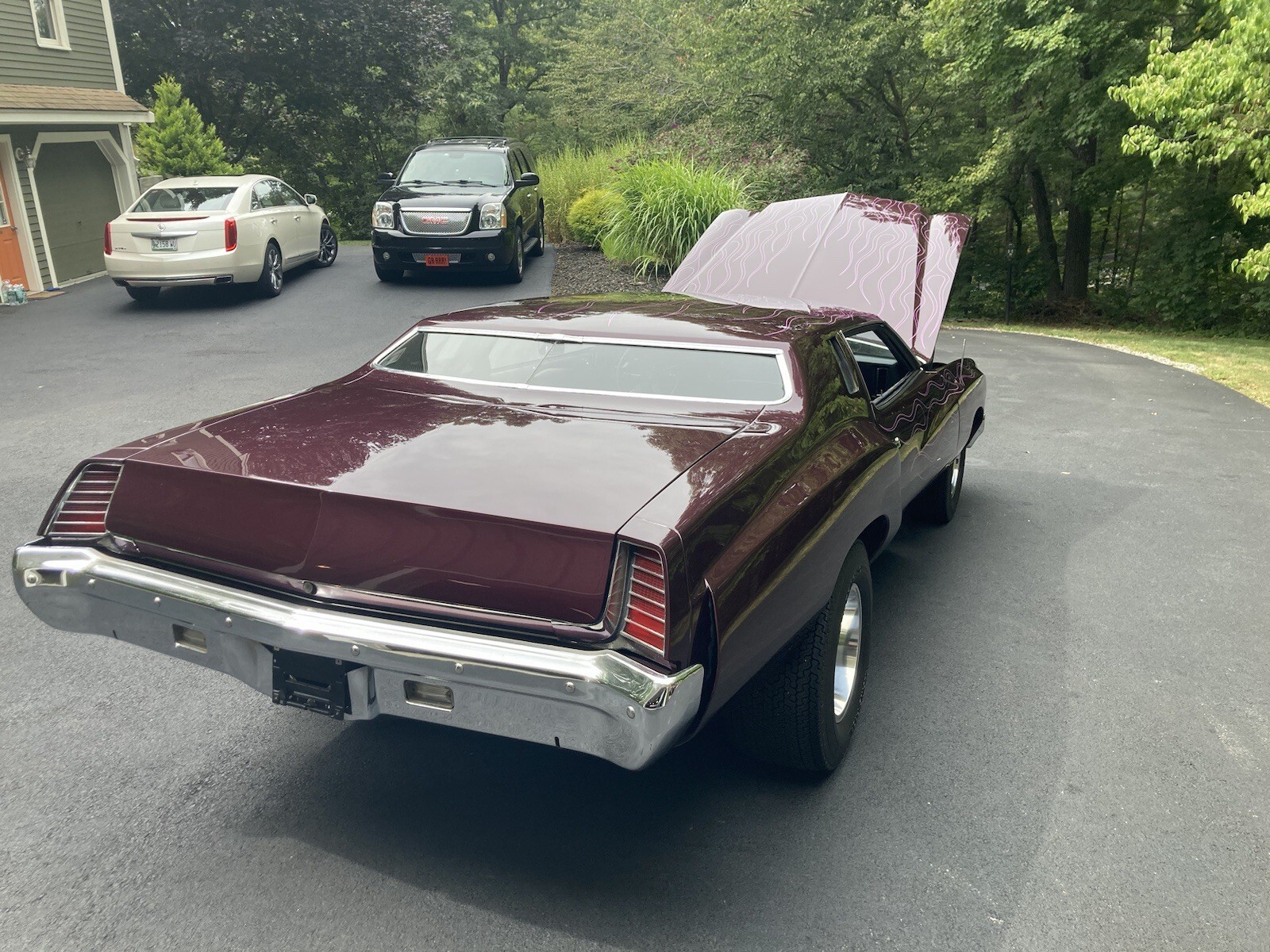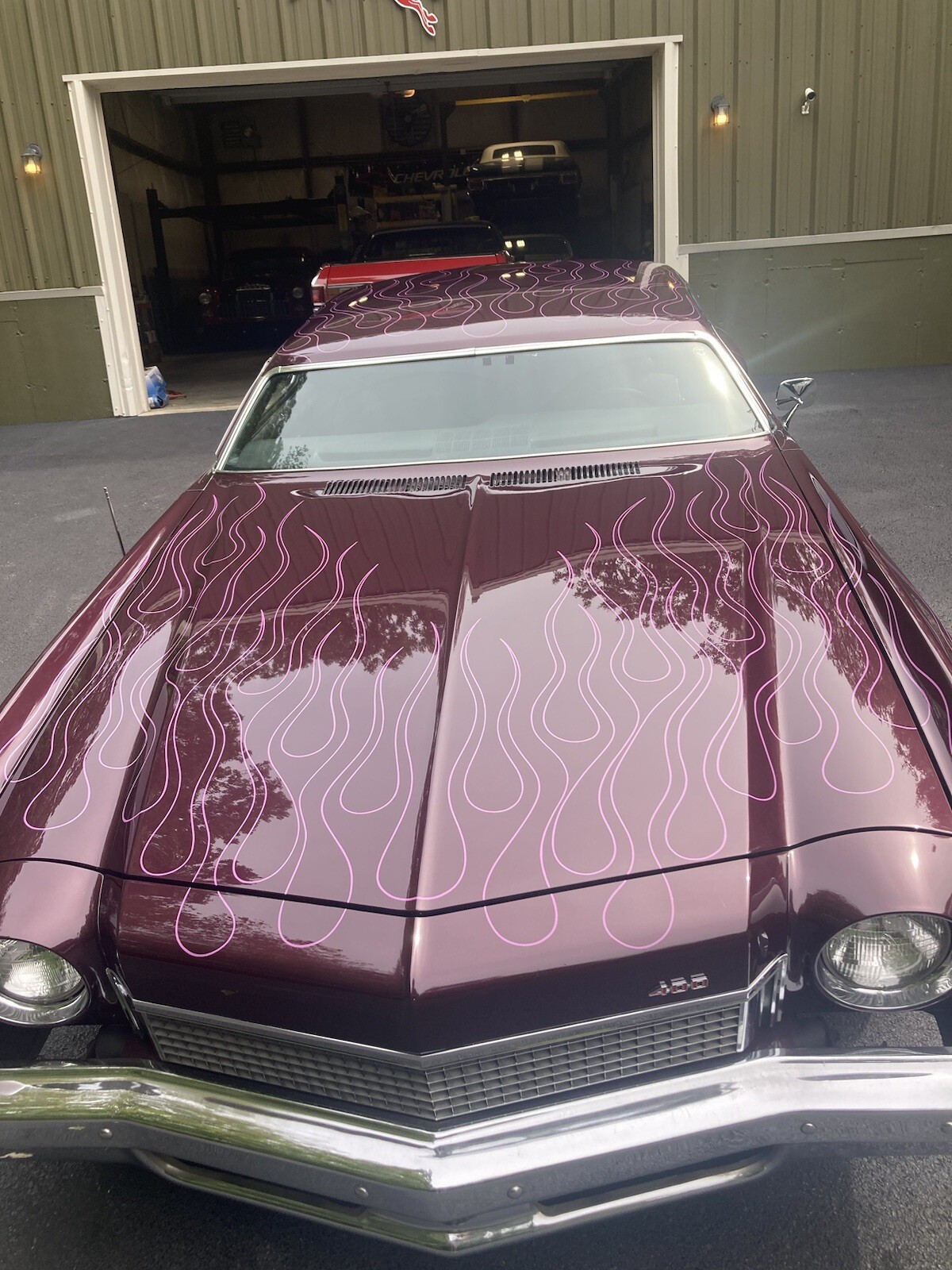 Custom 1973 Monte Carlo Chop Top Hot Ro, car was built in late 70s early 80s roof chop is 71/2 inches, has custom rear wide body to accommodate the 10” wide wheels. Has its laquer paint from 1985. Car shows very well it’s not perfect it has patina from its age. But is a head turner. I had Charlie Decker hand paint the outline flames. Car runs drives excellent. It’s fun to drive . Has a 350 built by a local engine builder that built performance engines. I bought it 7 years ago and gave it a thorough mechanical overhaul brakes tire’s exhaust tune up etc. brand new US mag, car needs door glass and could use some interior work driver seat bolster is split. Easy fix. I have a pattern for the door glass. Feel free to ask questions and I’ll do my best to answer. If you require more pics lmk. I have lots of history on the car and old pics.
