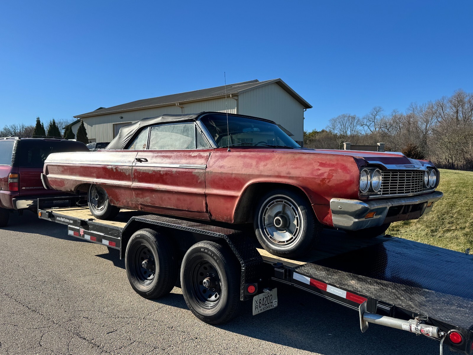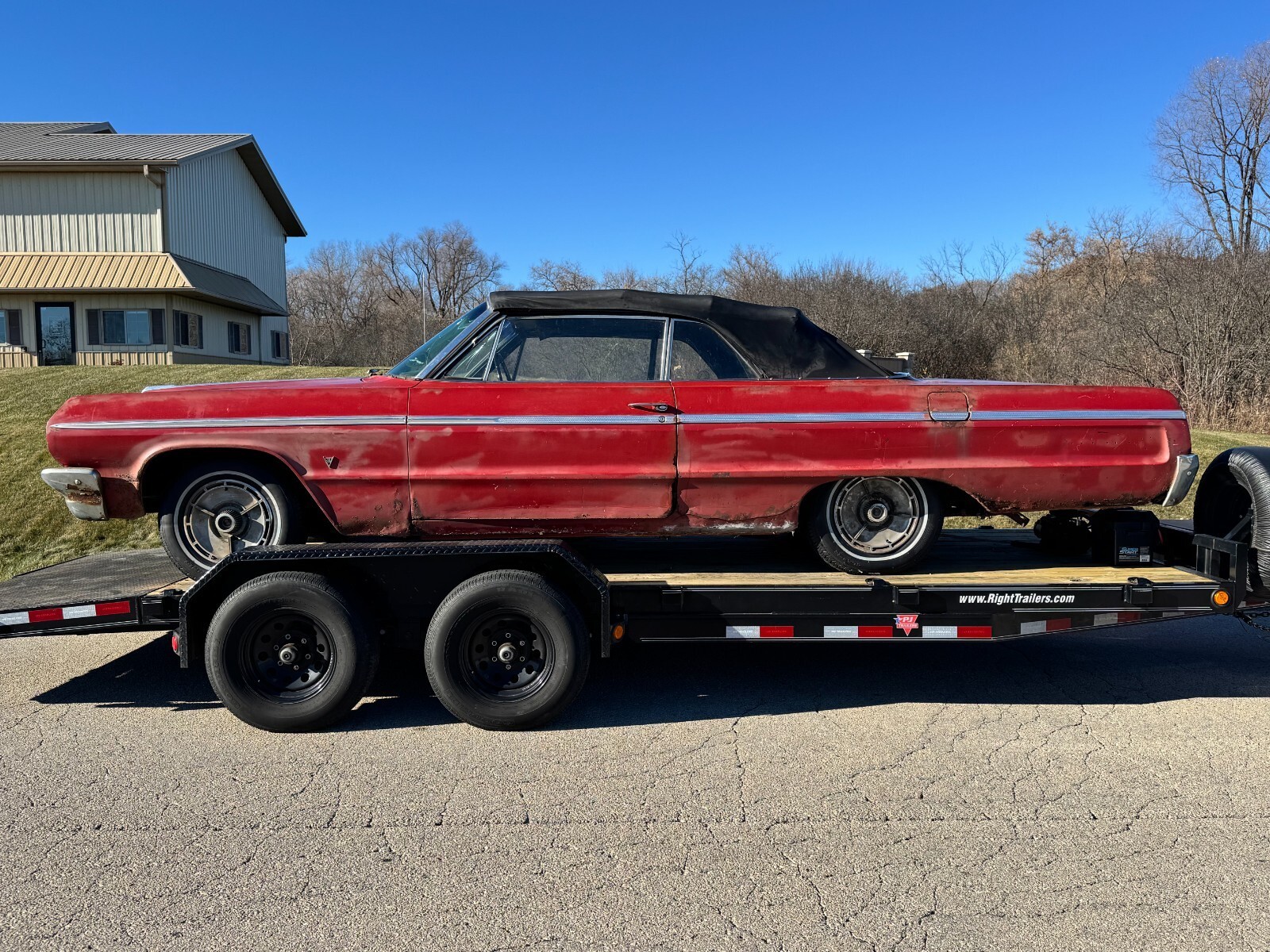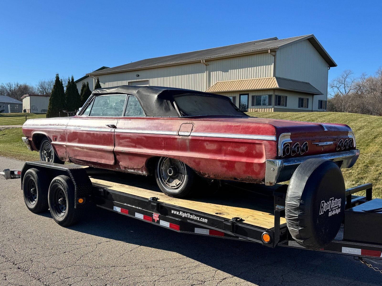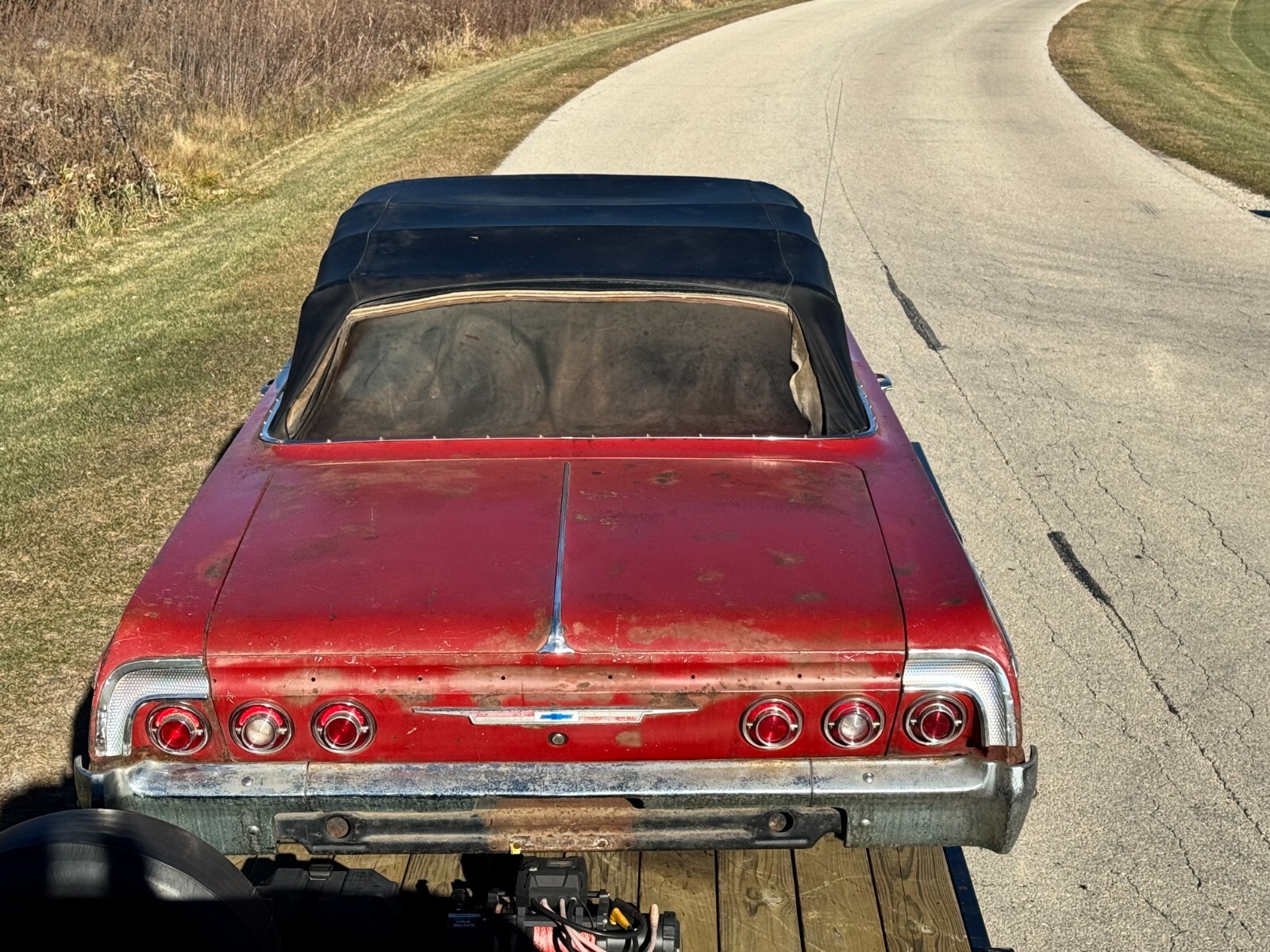 1964 Impala SS Convertible, non-running project car. This car was just discovered this week stored away in a garage since 1983. This one owner time capsule will need extensive and complete restoration, but it is very complete with many of the hard to find parts present and accounted for. This is a true body code 1467 V8, SS Convertible, not a clone or something made to resemble the real thing. Painted in its correct color code 922, Ember Red with its correct and original code 815-2 Black Bucket seat SS interior with center console and floor shifted automatic transmission with the "2" code black convertible top still in place. While we mentioned it will need an extensive restoration, this car checks all the hard to find boxes for an X-frame convertible rebuilder! Engine is a 283 and turns free with the new starter and we expect it should be able to run with very little work. The transmission is a 2 speed Powerglide auto, but all that can change depending on the direction you go with the restoration. We even have a shop we work with that can restore it just how you want it, just let us know if you want to go that direction!! I am listing this here with a reasonable reserve, but knowing what these cars can bring, I am not giving it away. We can work with you, but understand what you are looking at and bidding on before you commit to bid. This is a LARGE project, but if done right, could be a 6 figure car all day long!!