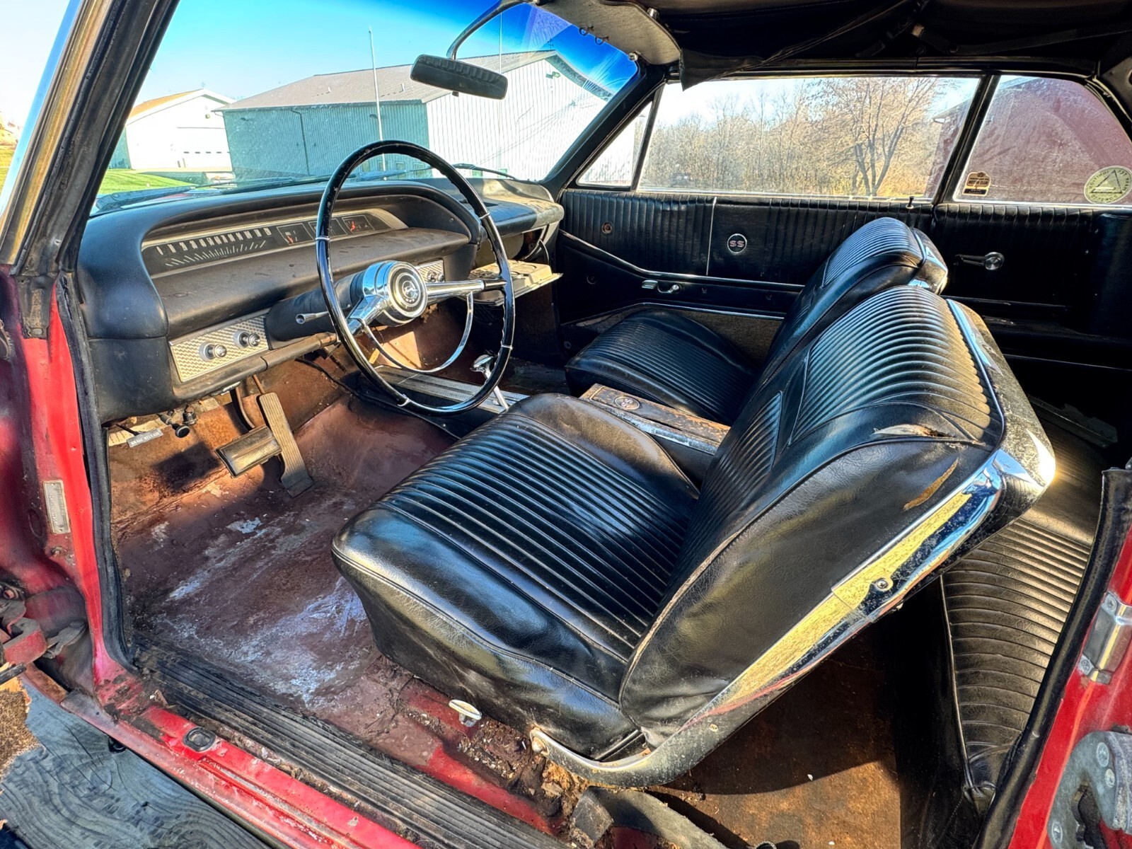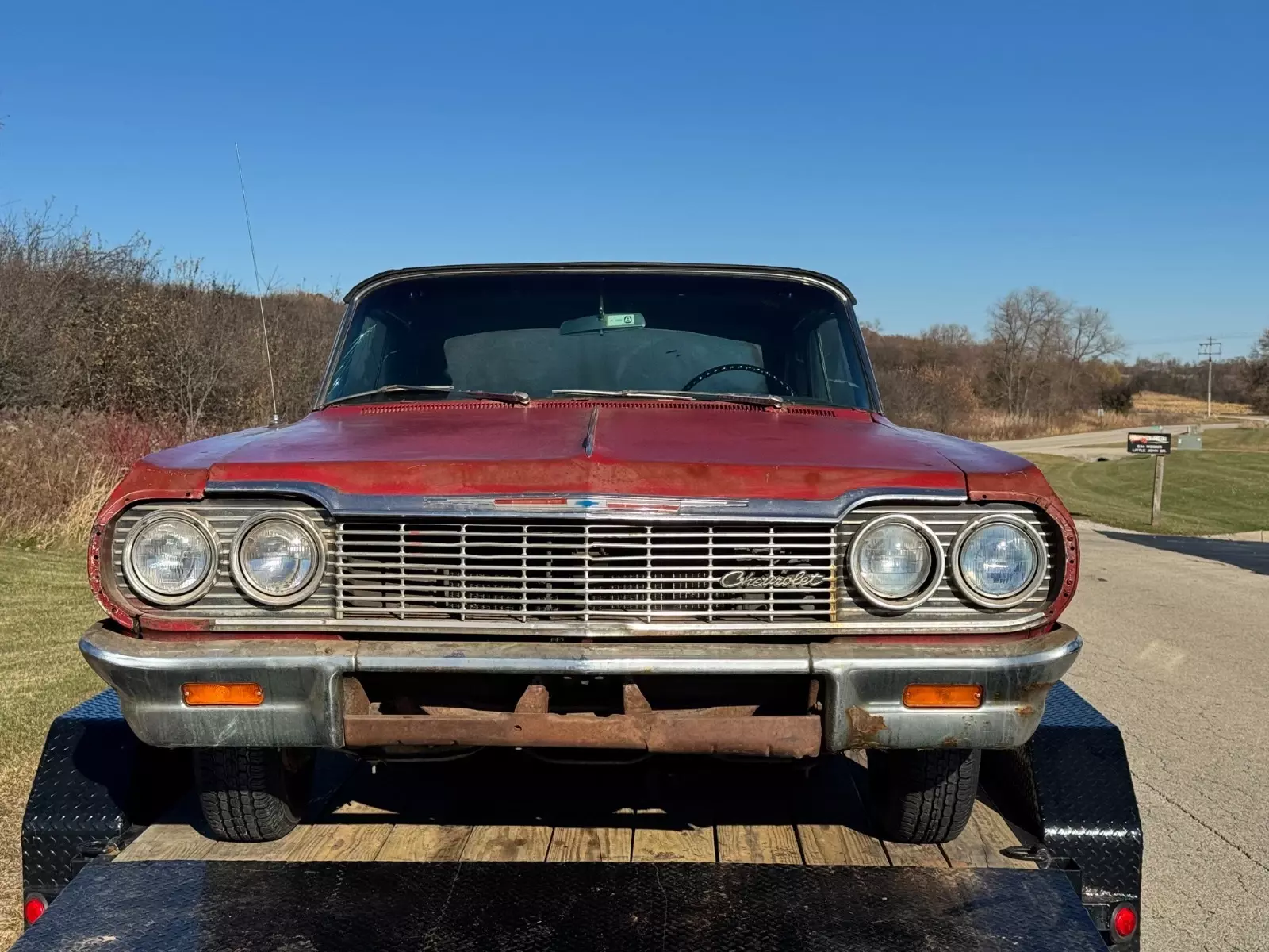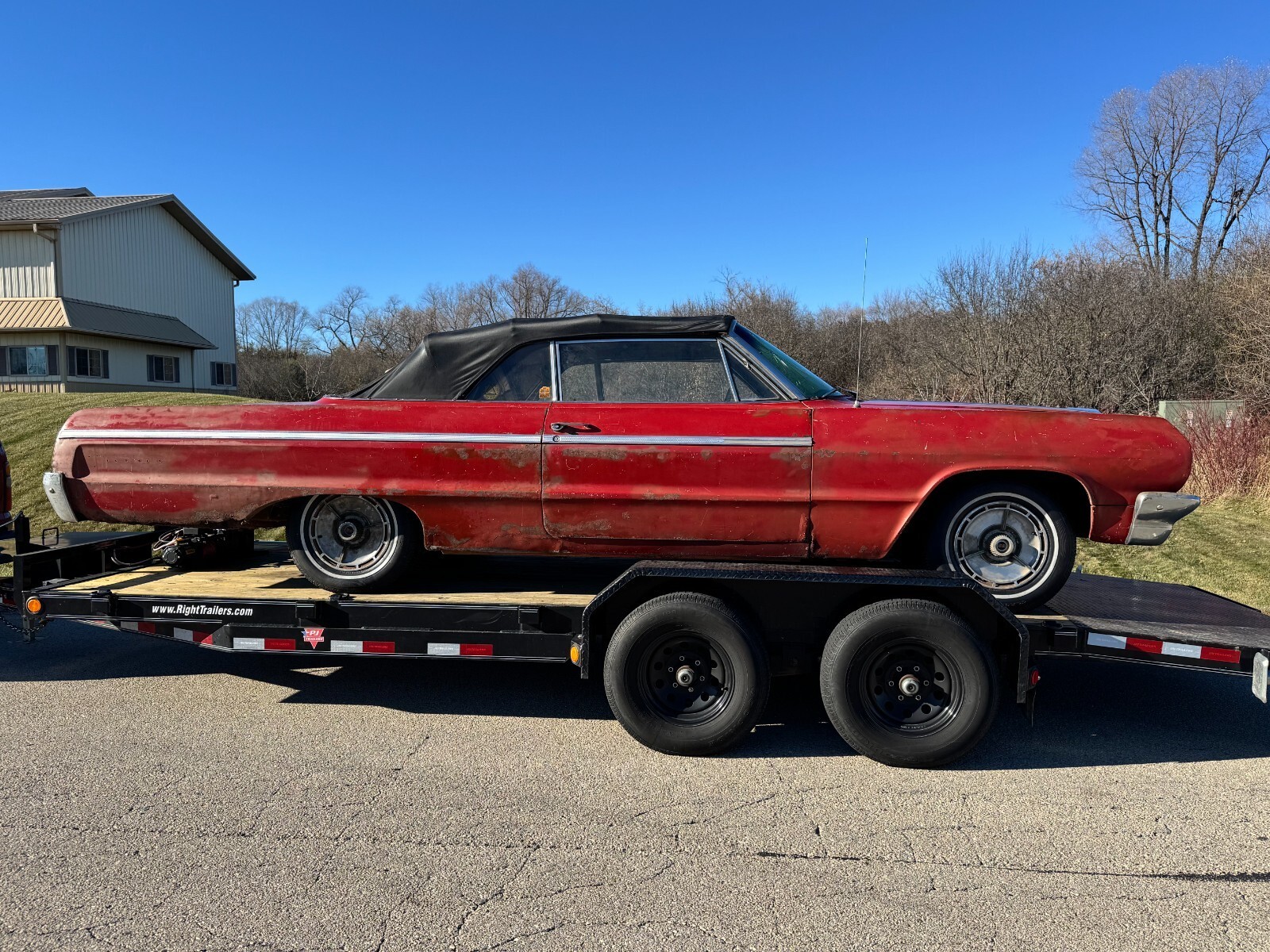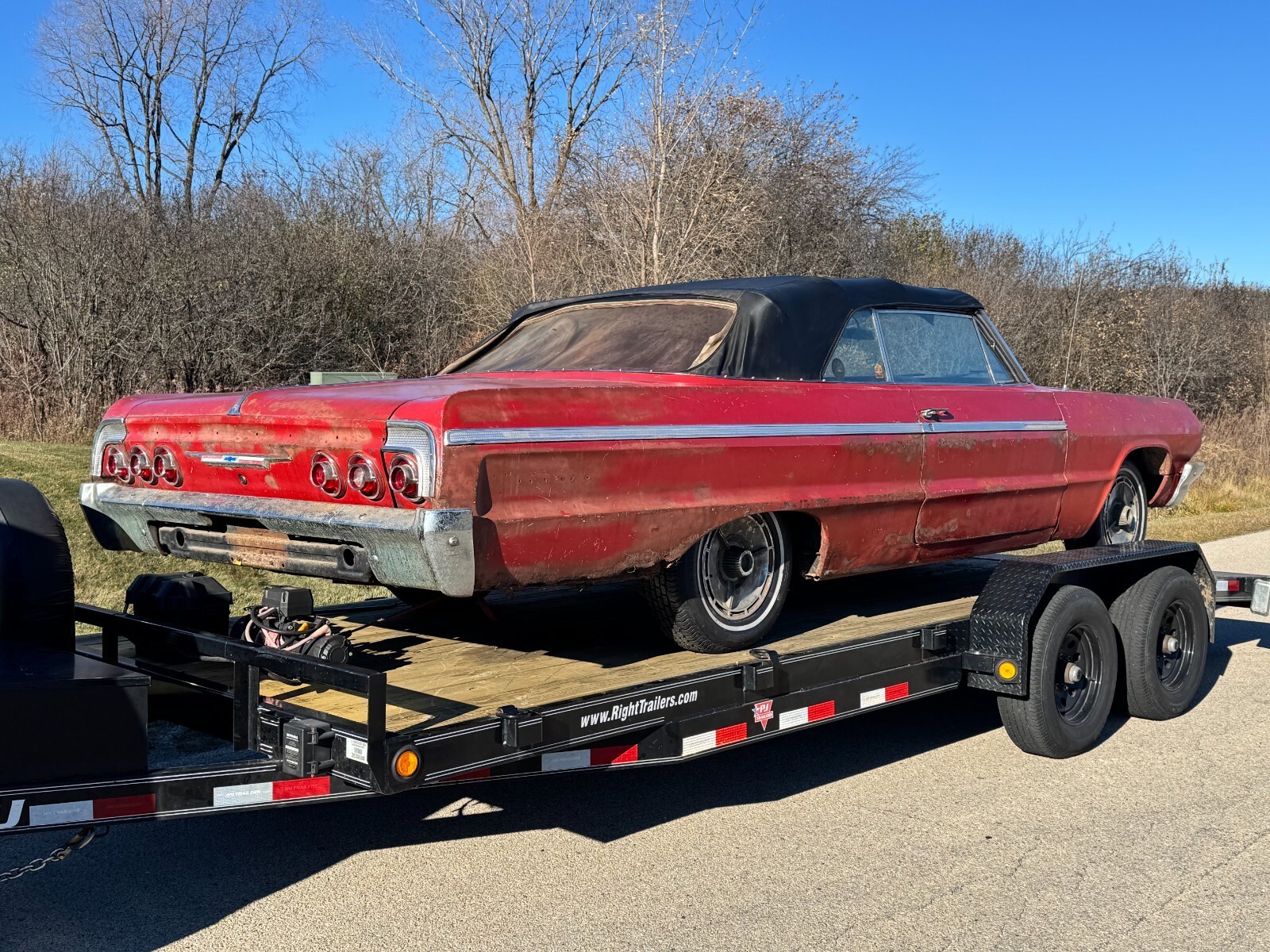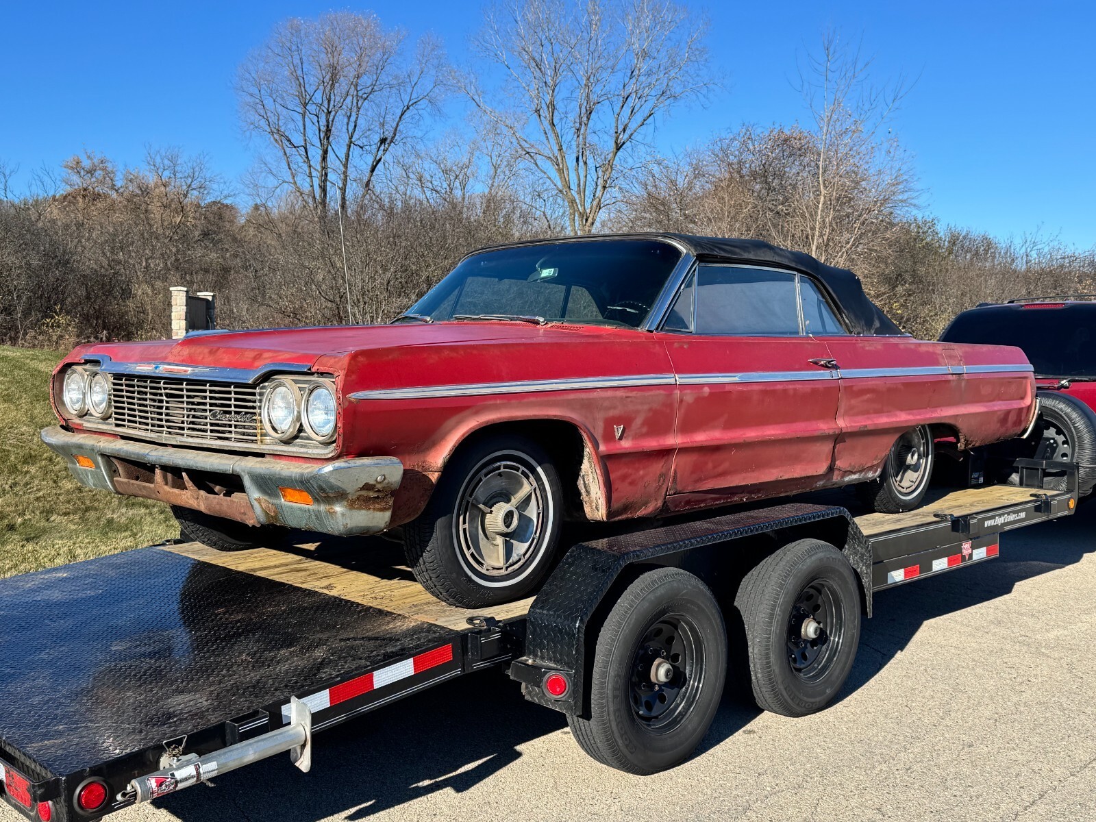 1964 Impala SS Convertible, non-running project car. This car was just discovered this week stored away in a garage since 1983. This one owner time capsule will need extensive and complete restoration, but it is very complete with many of the hard to find parts present and accounted for. This is a true body code 1467 V8, SS Convertible, not a clone or something made to resemble the real thing. Painted in its correct color code 922, Ember Red with its correct and original code 815-2 Black Bucket seat SS interior with center console and floor shifted automatic transmission with the "2" code black convertible top still in place. While we mentioned it will need an extensive restoration, this car checks all the hard to find boxes for an X-frame convertible rebuilder! Engine is a 283 and turns free with the new starter and we expect it should be able to run with very little work. The transmission is a 2 speed Powerglide auto, but all that can change depending on the direction you go with the restoration. We even have a shop we work with that can restore it just how you want it, just let us know if you want to go that direction!! I am listing this here with a reasonable reserve, but knowing what these cars can bring, I am not giving it away. We can work with you, but understand what you are looking at and bidding on before you commit to bid. This is a LARGE project, but if done right, could be a 6 figure car all day long!!