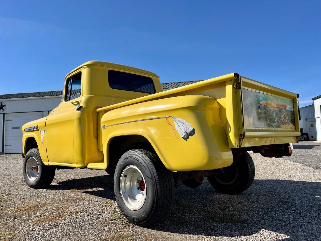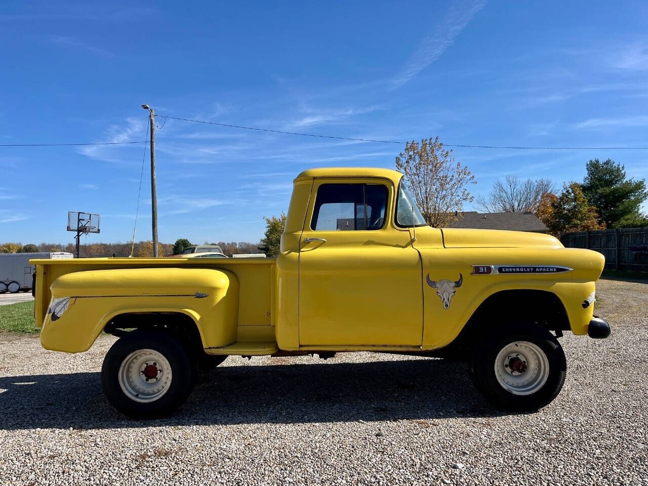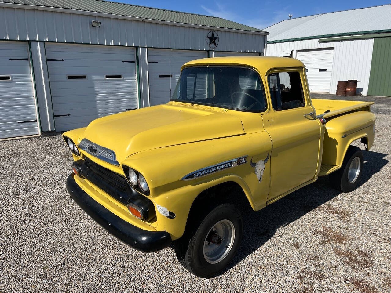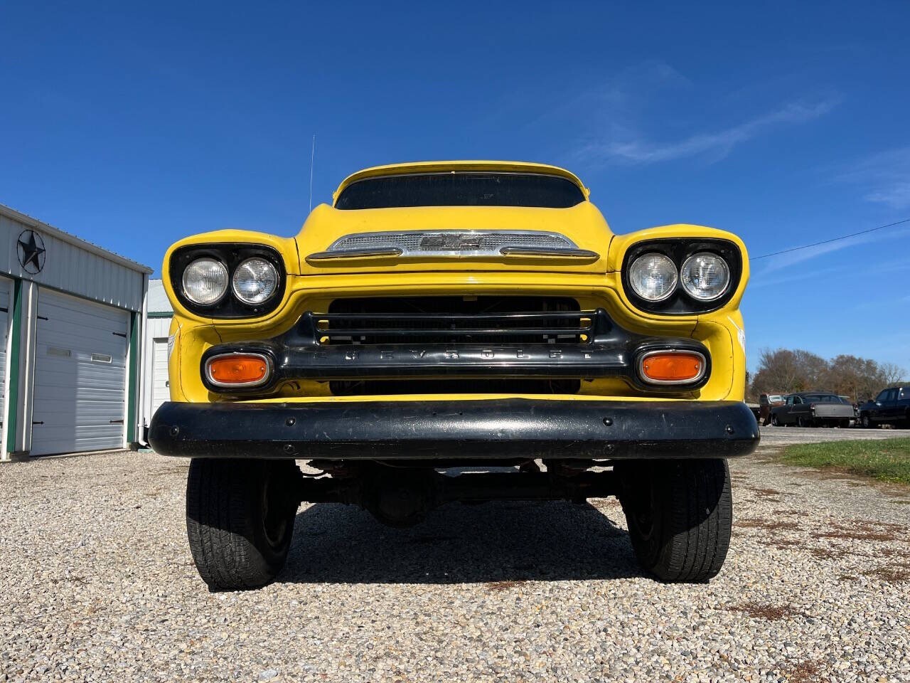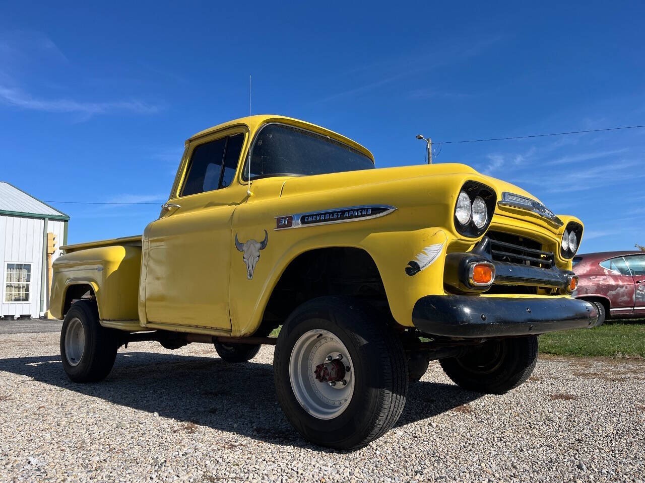 GOOD OL' 59 CHEVY 3100 SHORT BED WITH FACTORY NAPCO 4X4. RARE TRUCK AND MORE RARE WITH SHORT BED. HAS NICE RUNNING 283 2BBL, 4 SPEED MANUAL W/ GRANNY GEAR, LIFTED 3 OR 4 INCHES AND MILES UNKNOWN. SOME PHOTOS SHOW IT BRIGHTER YELLOW THAN OTHERS. IT IS MORE OF THE DULLER COLOR SEEN IN PHOTOS BUT SHE DOES RUN AND DRIVE. WITH JUST A LITTLE WORK SHE CAN BE STREET LEGAL. NO GLASS NEEDED. LAST OWNER JUST PUT ALL NEW TINTED GLASS IN HER.