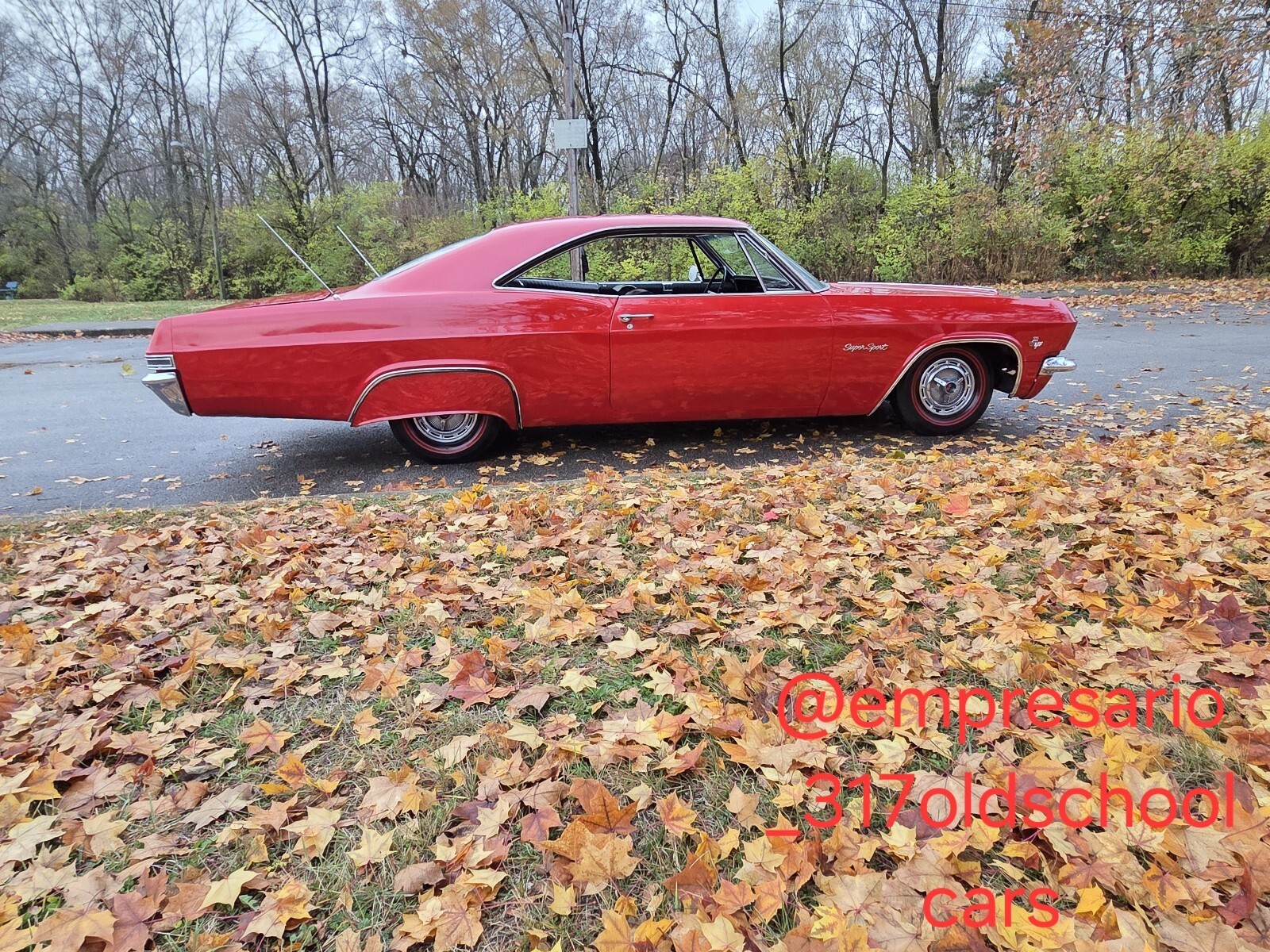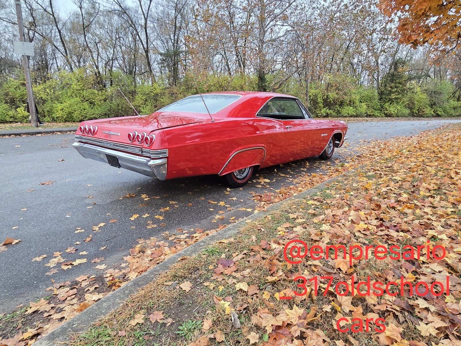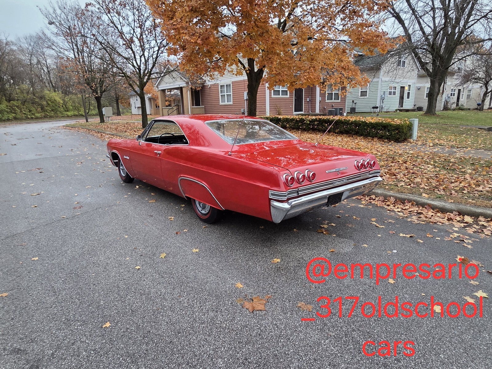 1965 Chevrolet Impala Super Sport. Factory color combo, Rally Red with Black vinyl interior. 327 V8 engine with 2 speed powerglide automatic transmission. Power steering. Power brakes. 12 bolt posi rear end. All new front & rear suspension. Stock wheels on U.S. Royal Dual Redline Tires. Runs & drives excellent. Nice interior. Clean body. Nice paint. Skirts. Dual antenna. Drive it anywhere. Clean title. $32,000. Located in Indiana.