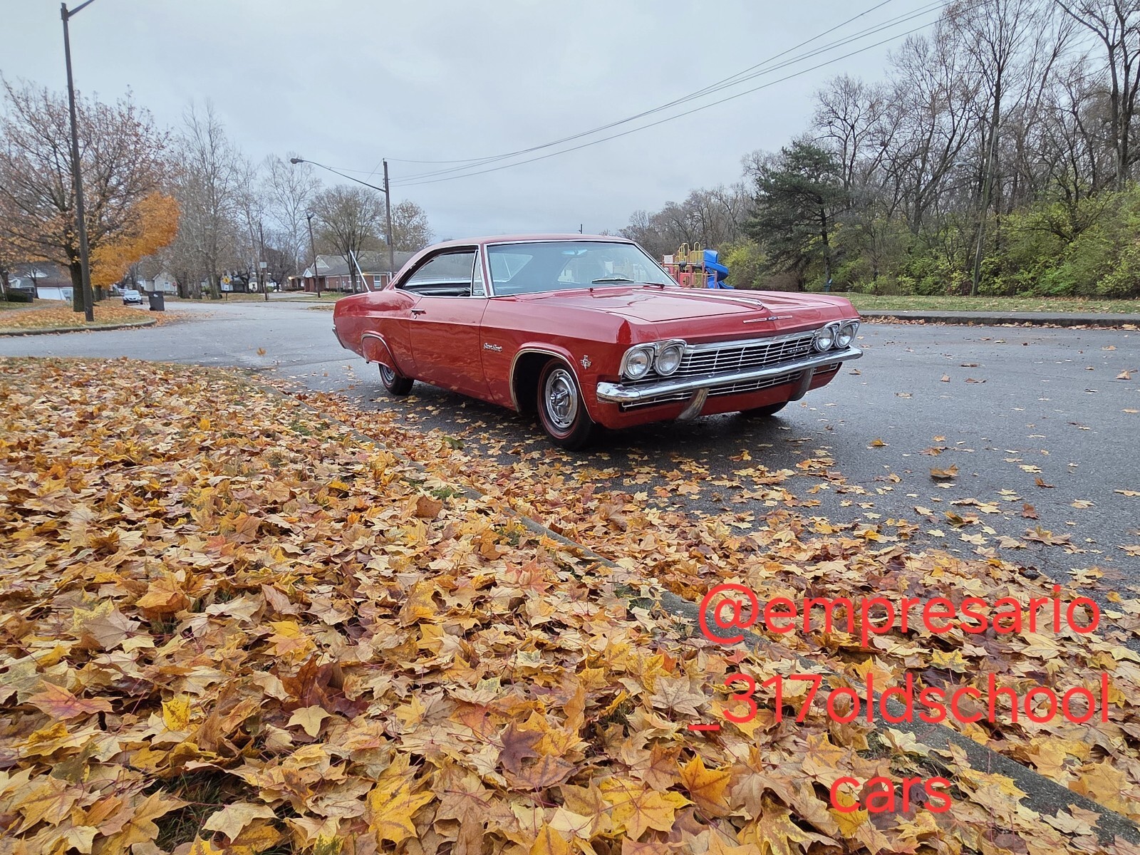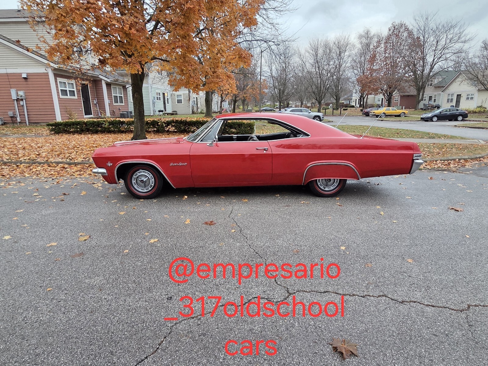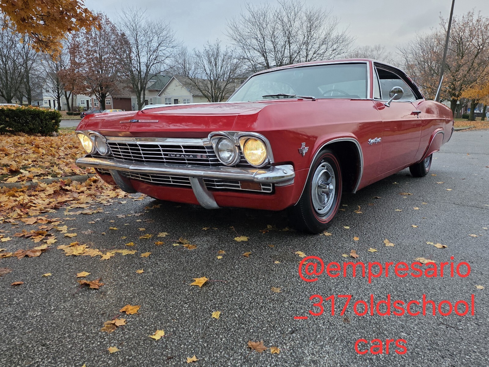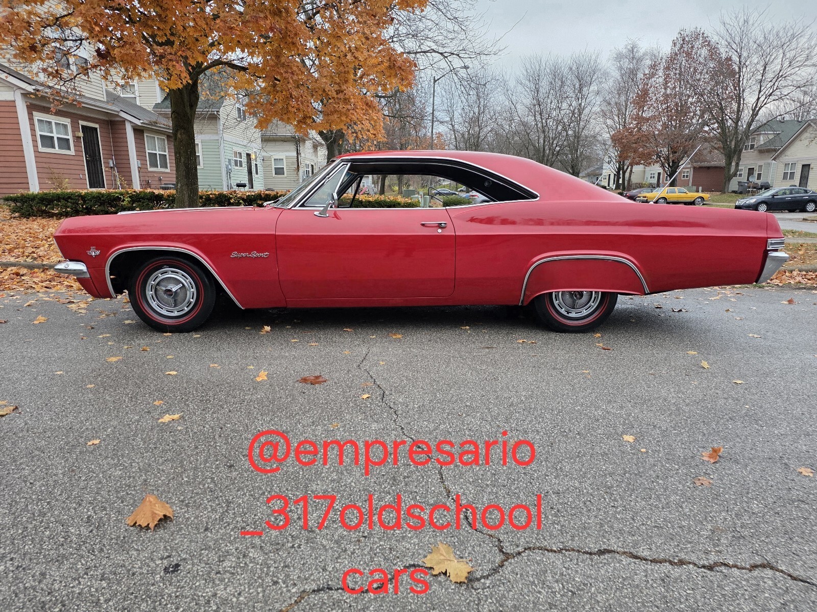 1965 Chevrolet Impala Super Sport. Factory color combo, Rally Red with Black vinyl interior. 327 V8 engine with 2 speed powerglide automatic transmission. Power steering. Power brakes. 12 bolt posi rear end. All new front & rear suspension. Stock wheels on U.S. Royal Dual Redline Tires. Runs & drives excellent. Nice interior. Clean body. Nice paint. Skirts. Dual antenna. Drive it anywhere. Clean title. $32,000. Located in Indiana. NO TRADES!!!