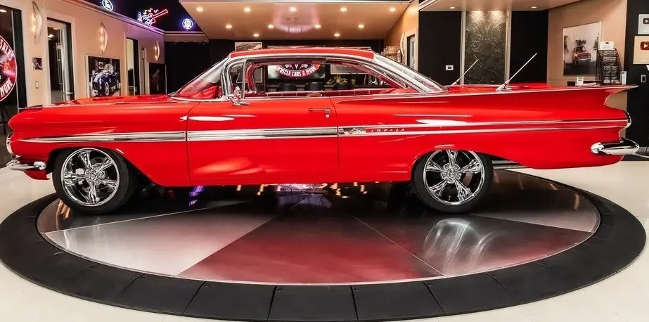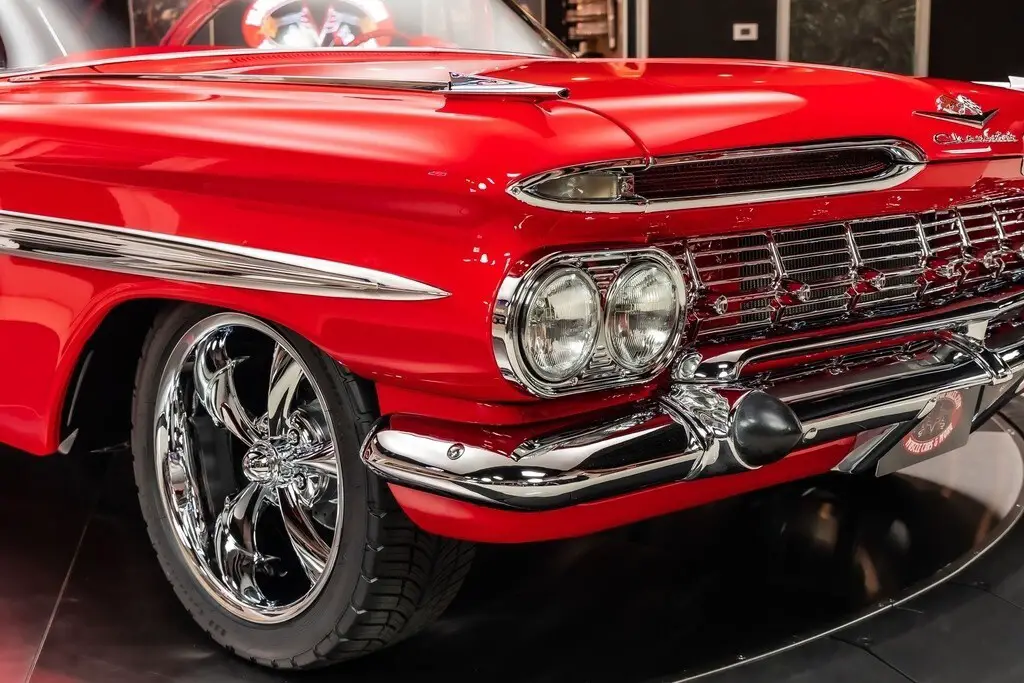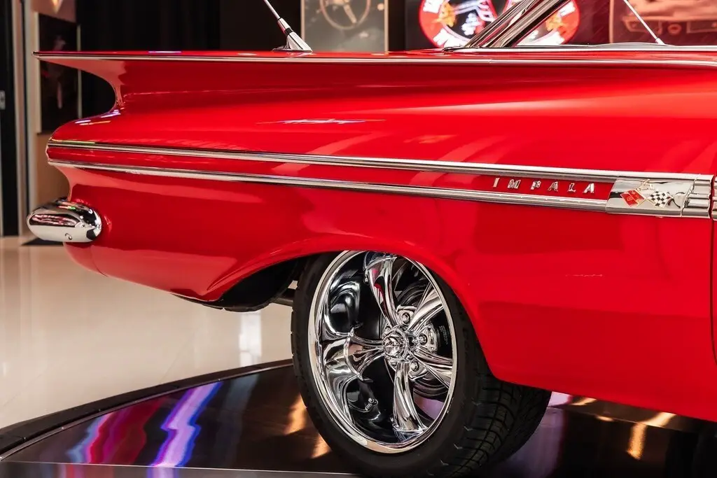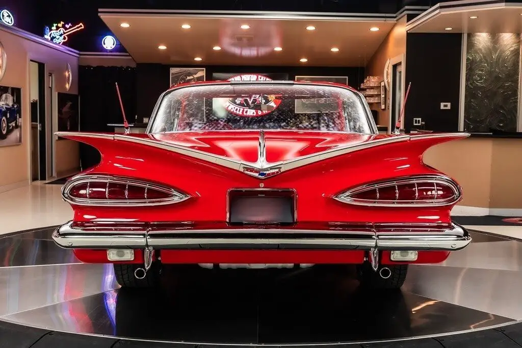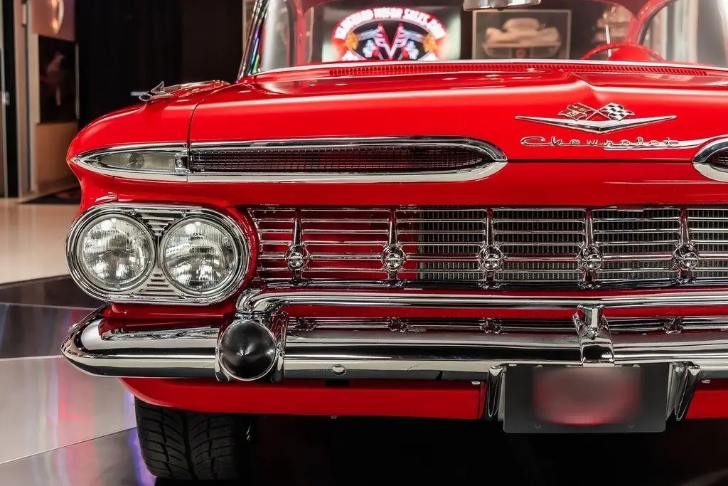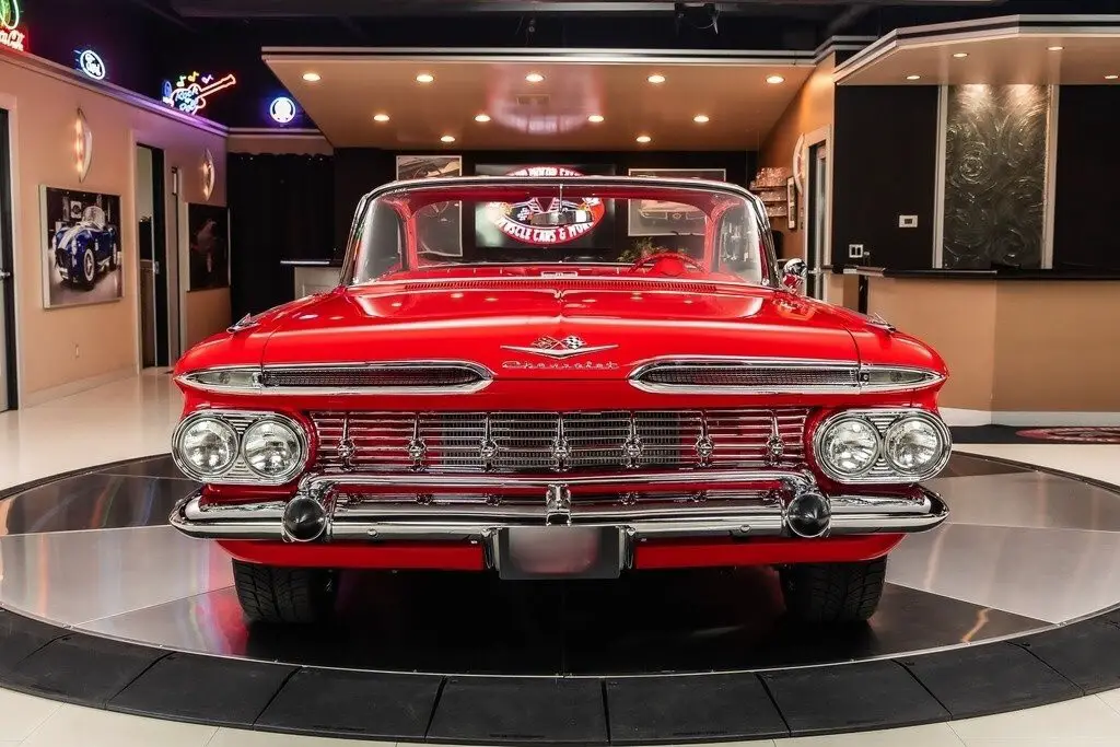 Finished in flawless deep red paint, this Impala commands attention from every angle. Signature chrome and stainless trim, Impala script badging, and polished bumperettes accentuate its sculpted body lines and dramatic rear fins. The overall presentation remains true to 1959 design while exhibiting a concours-level finish throughout.