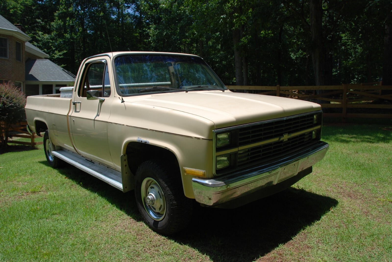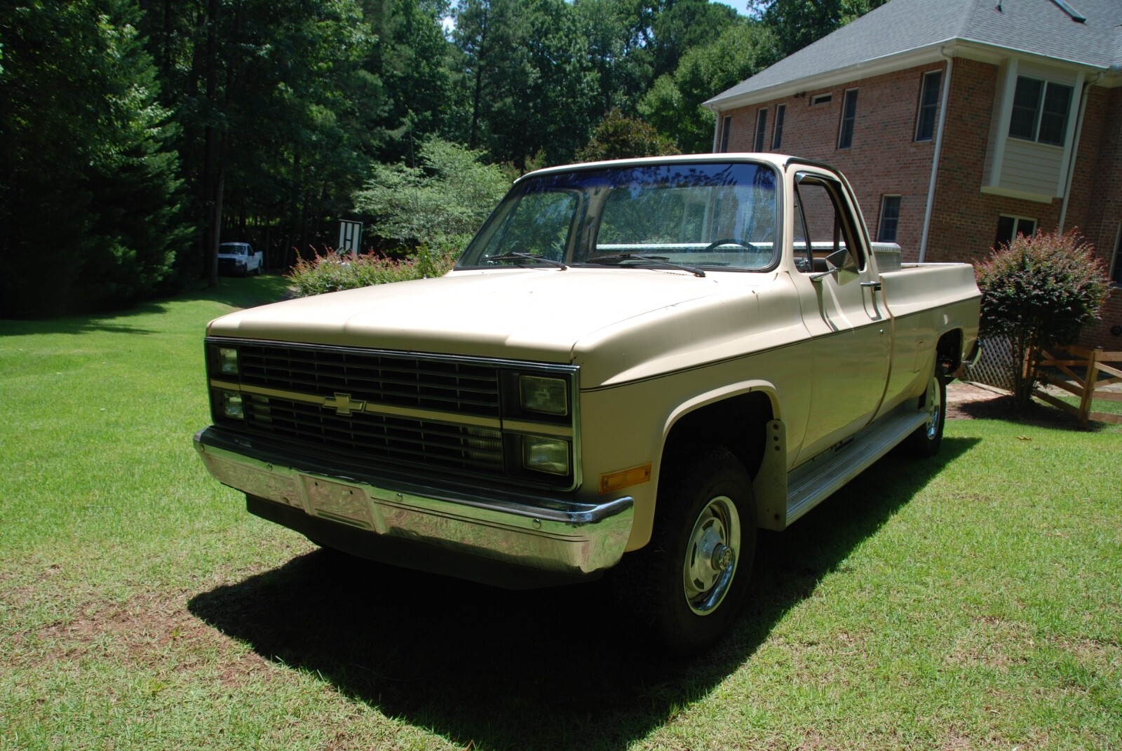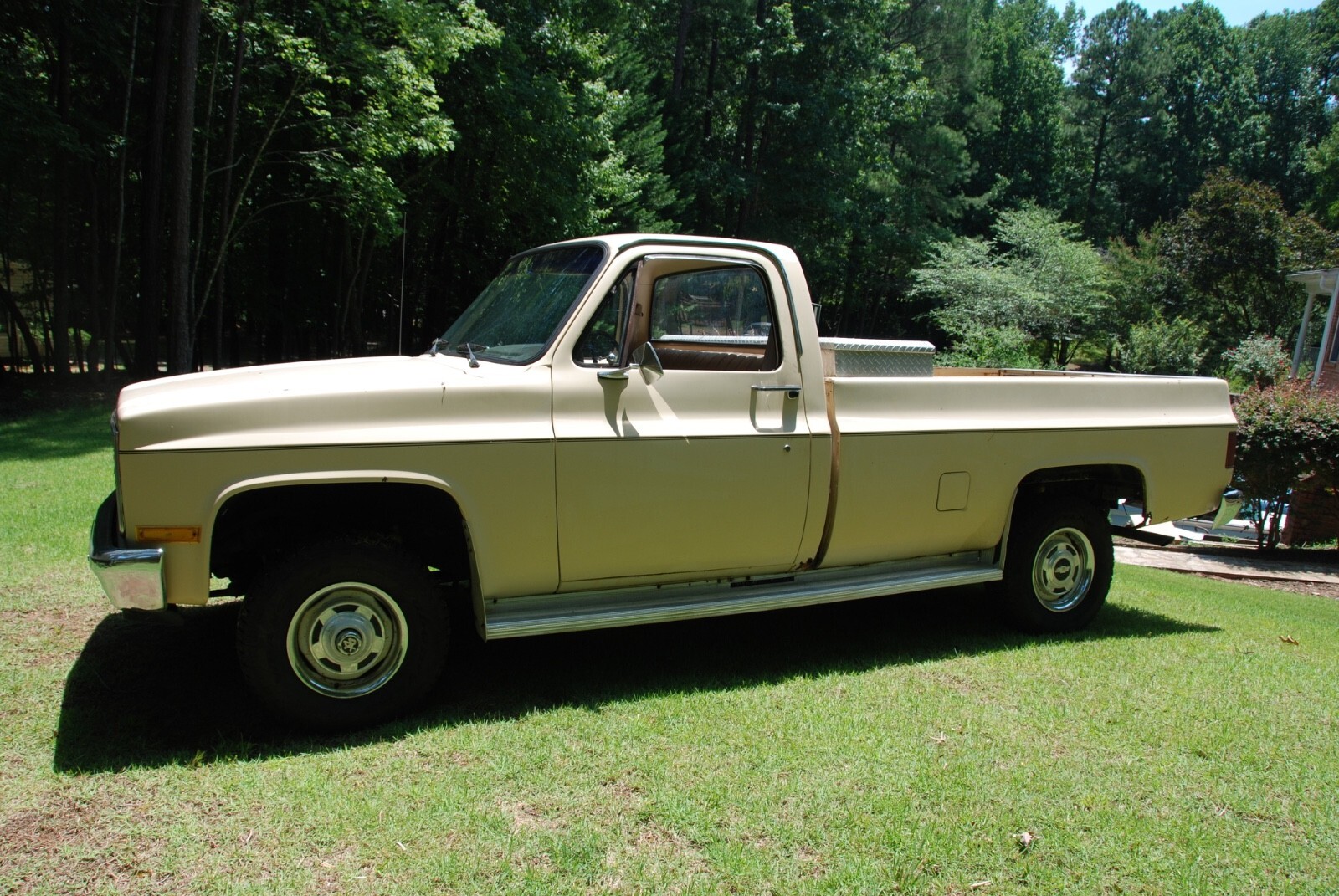 1984 K10 Scottsdale 4WD pick up, factory air, 5.0 V8, G80 locking differential, fleet side, factory gauges, saddle tan exterior, doeskin tan interior and original drive train. One owner original truck from Raleigh, North Carolina. Mechanically very good, new: tires, shocks, brakes, aluminum radiator, battery, and miscellaneous. The vehicle is need of interior, body and paint work. The frame and undercarriage are very good. The cab corners, rocker panels, behind the rear wheel area have rus, see photos. Excellent square body truck for restoration. Vehicle being sold by a North Carolina dealer, Classic Car Investments, 10207 Chapel Hill Road, Morrisville, NC. Located 5 miles from the RDU airport. We have been opened since 1985 with the same ownership.