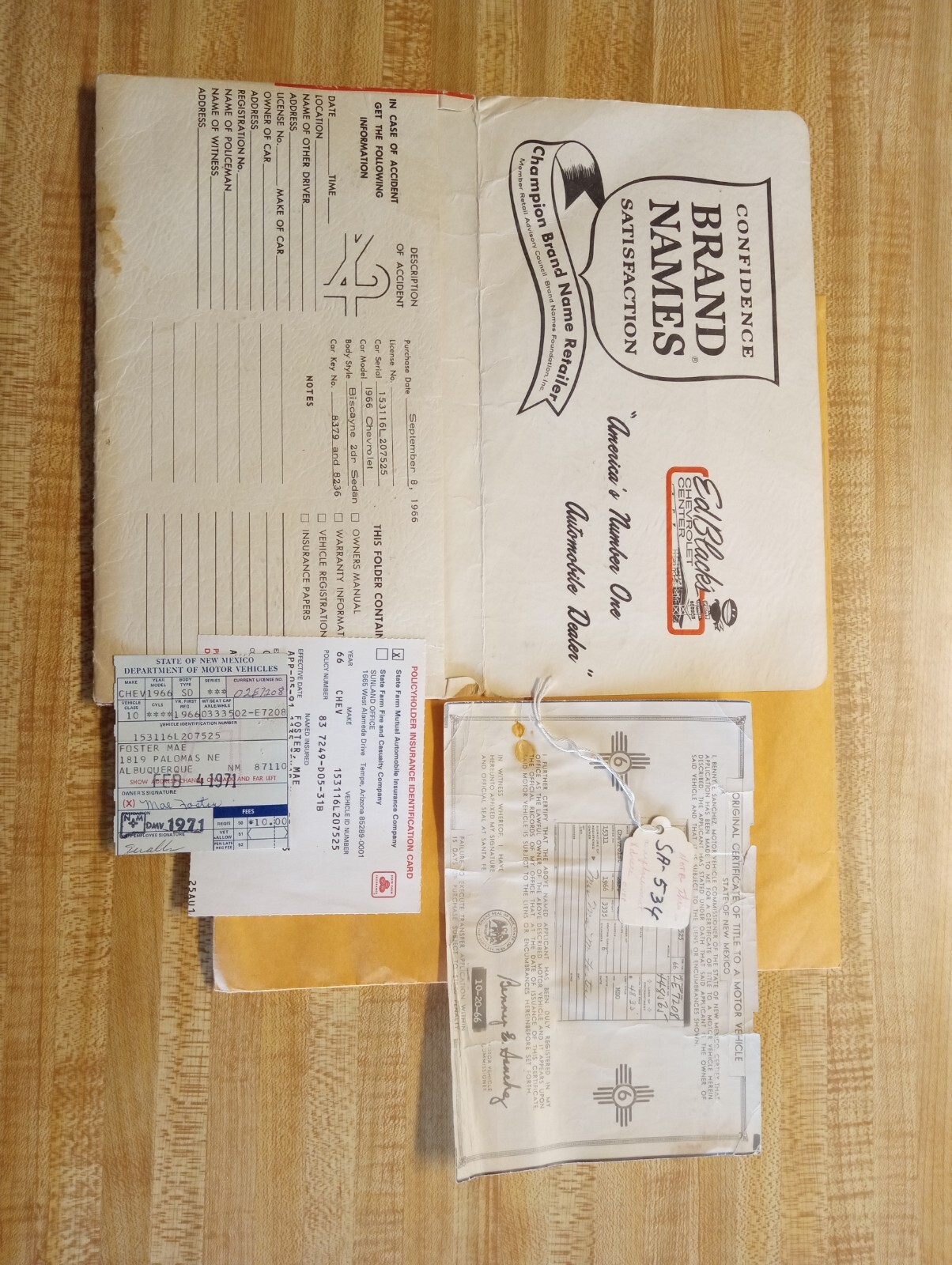 1966 Chevrolet Biscayne PS Barn Find, Aunt Mae's car A nice little Chevrolet Biscayne. She was a younger sister and partner to my Grandfather her older brother, My Grandparents had mom and pop grocery stores. We may have some pictures to post. FIRST COME FIRST SERVED, I know her 49K miles are original miles to her Biscayne she was the only owner of it she bought it new in 1966. The title and paper work in the picture are original to this car from 1966. Pictures show the title and the paperwork from Ed Black Chevrolet Albuquerque in 1966. My Feedback is100% positive feedback. Thank You.$9,999.00