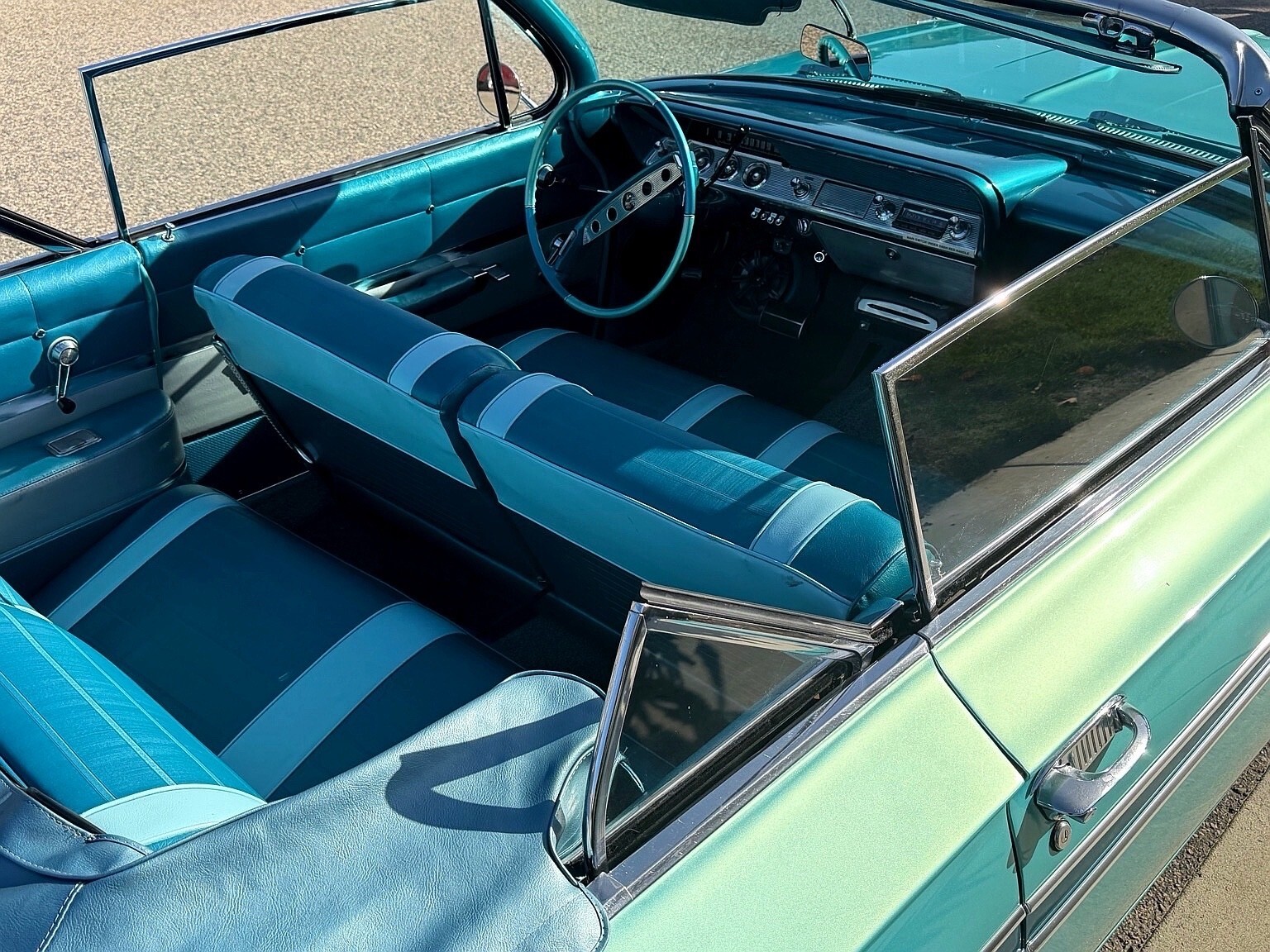 This is a beautifully restored 1961 Chevrolet Impala Convertible finished in a custom turquoise / baby blue paint with a matching blue leather interior. The car presents exceptionally well and retains its original uncut body, making it a standout example of a tastefully restored classic.