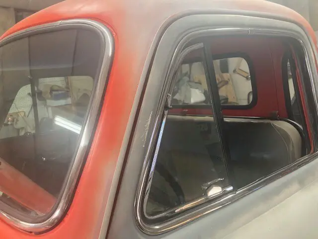 The five-window cab was dismantled and media blasted. The cab corners had some rust and were professionally replaced with reproduction stamped metal panels, along with a small area in the passenger floor. The cab was primed, and the interior, cowl, and window openings were painted factory red, then installed with new body mounts and bolts. Rust-free rear fenders and driver door were added.
