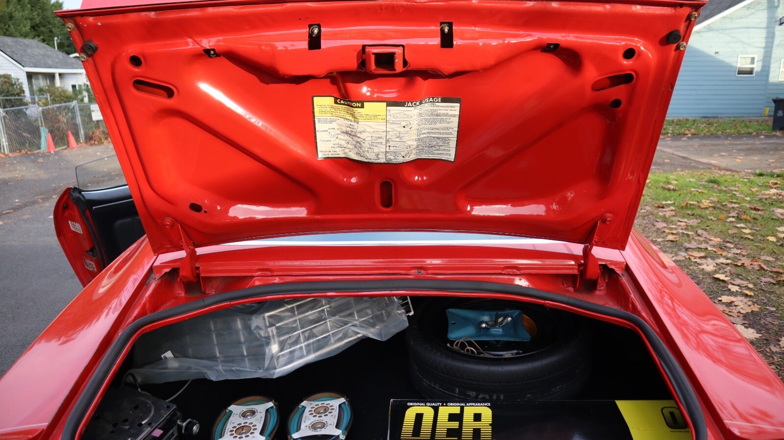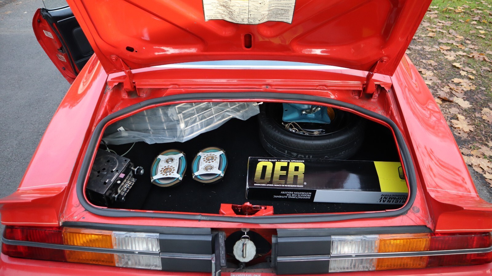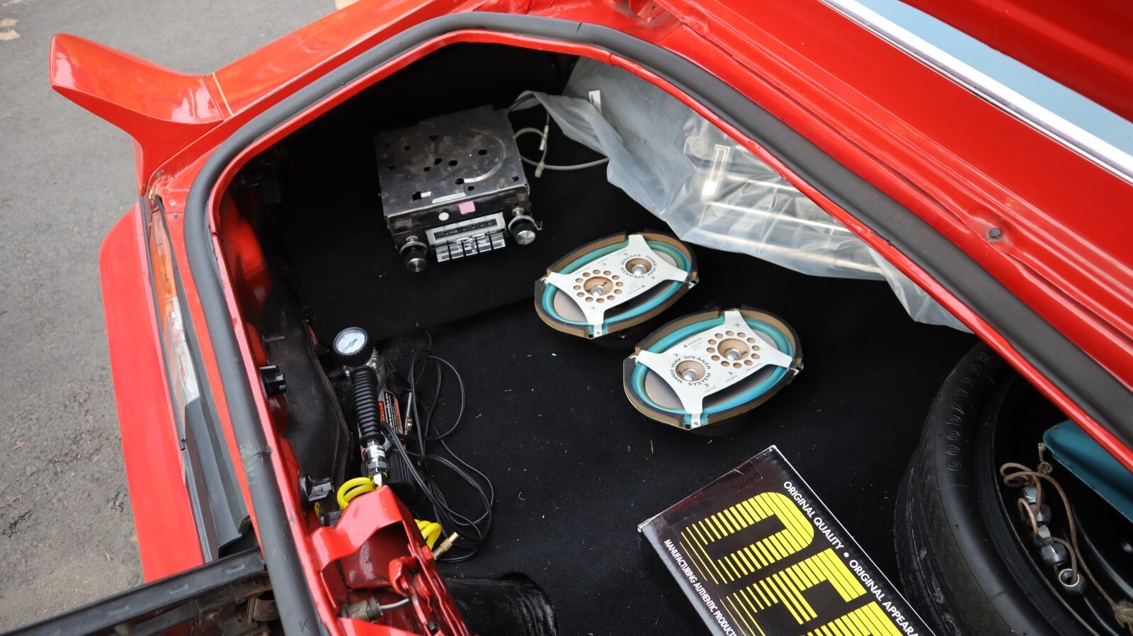 The trunk is clean and includes a spare wheel as well as several extra parts: speakers, gaskets, an OER restoration component, and additional small hardware. The car rides on period-correct wheels with fresh Cooper Cobra tires. It also features Oregon “Pacific Wonderland” plates, and all body tags and VIN plates match.