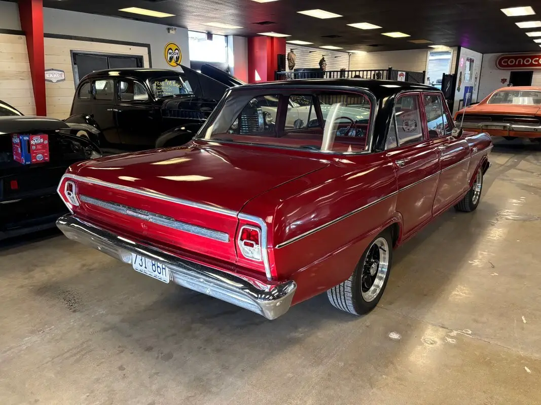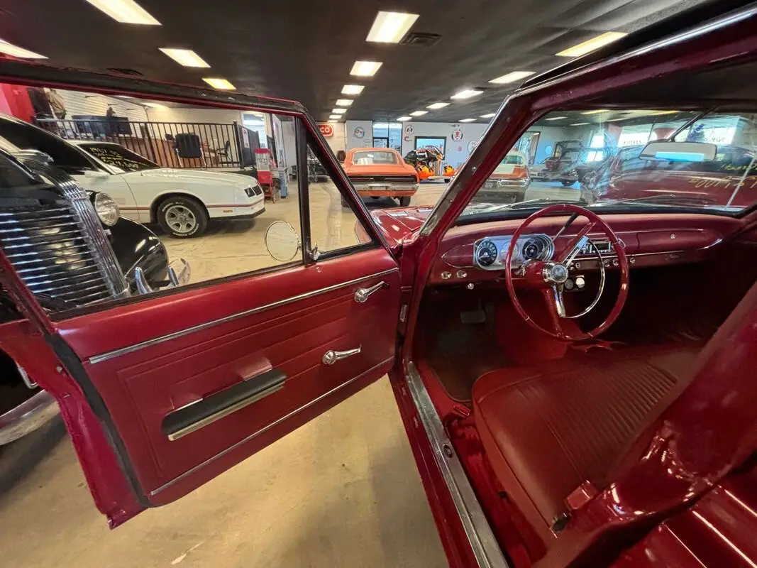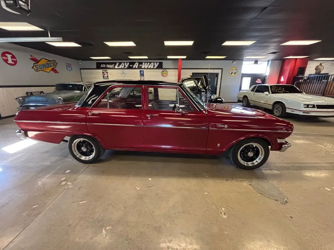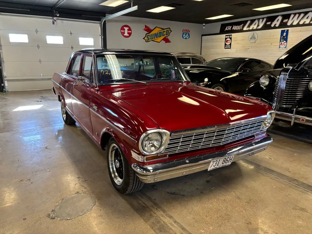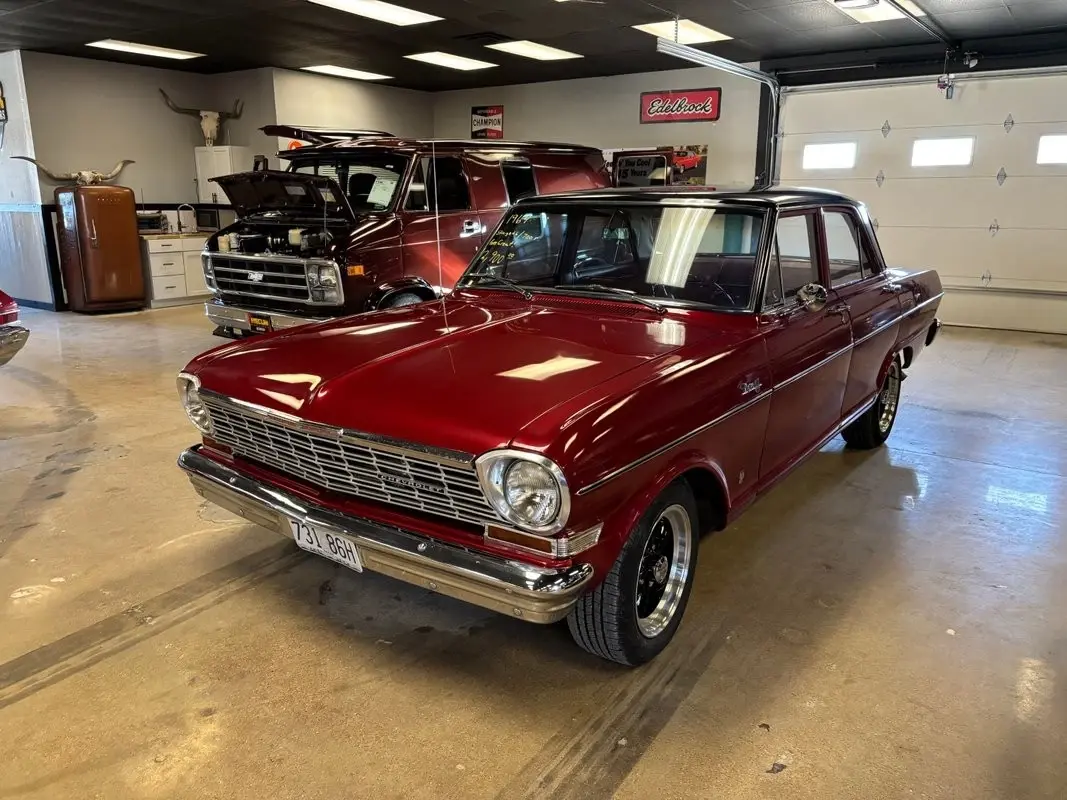 This 1964 Chevrolet Nova sedan is powered by its original 235ci inline-six engine paired with a 700R4 automatic transmission and rear-wheel drive. Finished in burgundy (Ford Toreador Red) with a red vinyl bench-seat interior, it features a column shifter, AM/FM radio, and classic four-door styling. A solid vintage cruiser offering timeless 1960s Chevrolet charm with improved drivability.