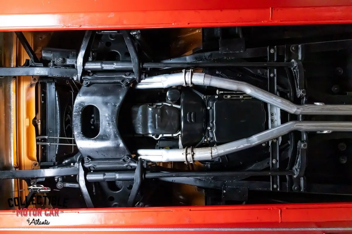 The engine bay is finished in body color and presents with a clean layout, including visible Vintage Air components. Underneath, the photos show a tidy chassis presentation with dual exhaust routing and the Flowmaster mufflers called out above-details buyers care about because they reinforce build quality beyond paint and interior.