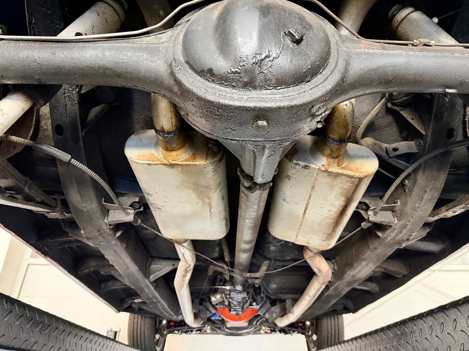 Pop the hood to reveal a dressed up 283 CID Chevrolet small block V8 engine with Mickey Thompson finned valve covers and a polished air cleaner, polished aluminum intake, and Edelbrock 4-barrel carburetor with electric choke. Dual exhaust runs to Flowmaster mufflers for a nice rumble from the rear of the car. A Flamethrower coil provides a strong spark with an upgraded distributor. Chrome adorns the brake booster, master cylinder, and alternator, for a show quality finish. You'll be proud to pop the hood at your local car shows!