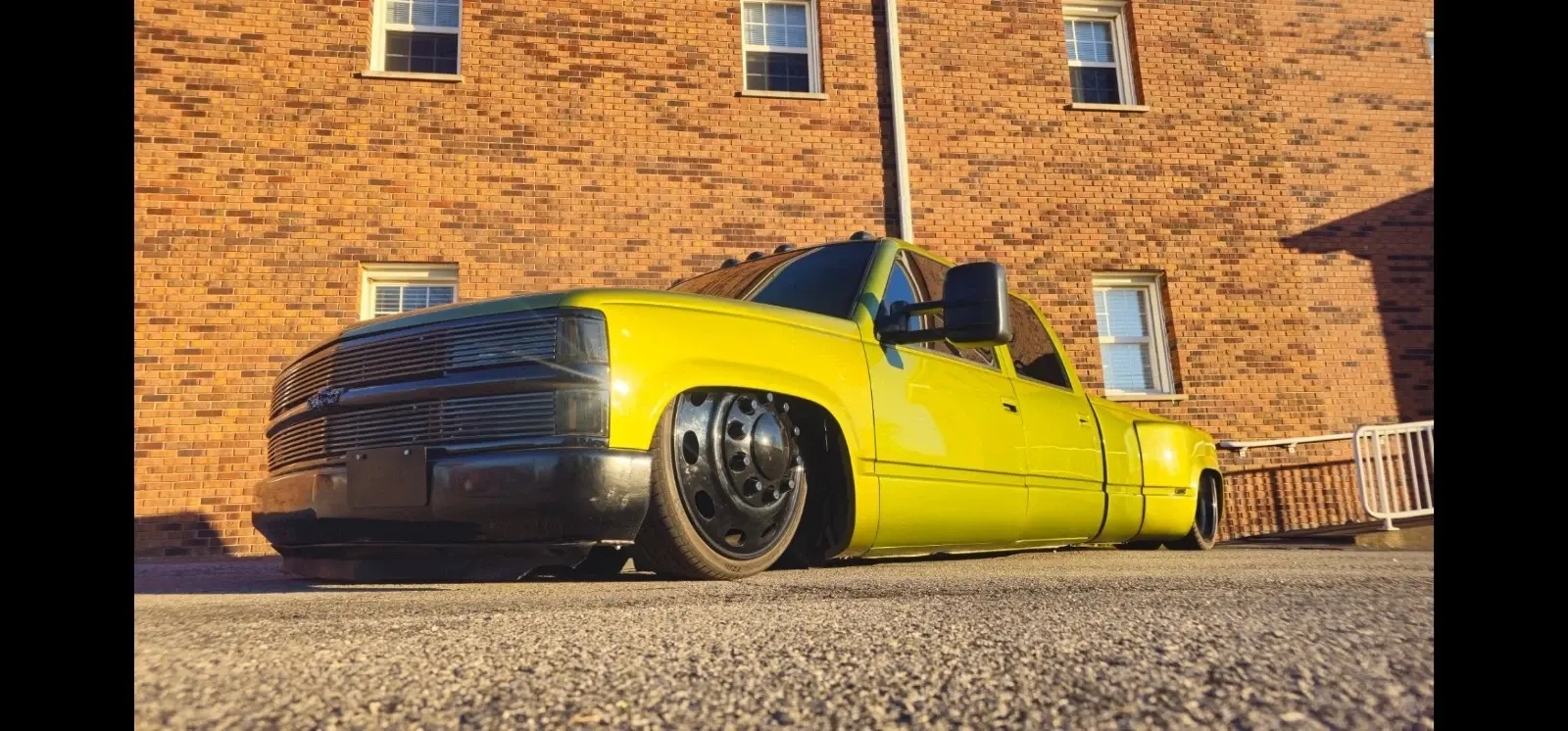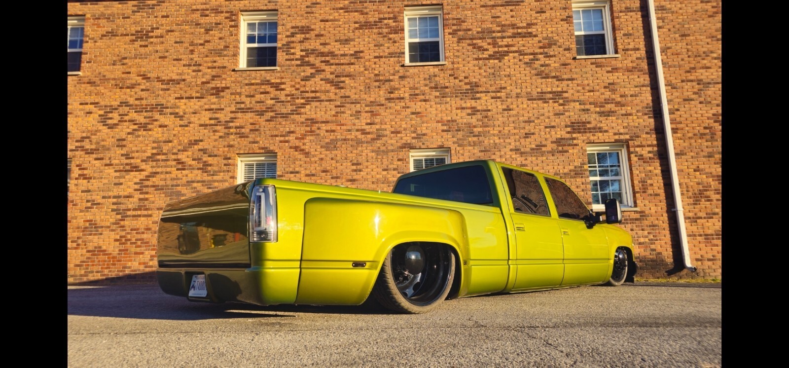 Dual air compressors, one engine driven and one huge 12volt compressor in the bed. 3 link rear end suspension and custom front control arms. Brown swede wrapped interior parts. 98 interior and dash. Cluster is from an escalade. Motor and trans look really clean. Runs good. Four 10 inch speakers behind the rear seat in a blow thru box from the bed. Also a big speaker box between thr rear seats. 2 fuel tanks and 2 seperate fuel pumps. This is about a 10 year old build and it has a few nicks in the paint but still shows well. Oh those leathers seats from an escalade are heated. The truck has an alarm system too. Led lights are in the inside and outside door handles.
