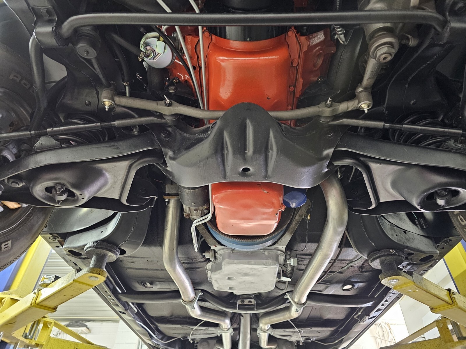 The undercarriage is clean, original floors, no signs of patches and is rust free. Looking up at the bottom of the motor it is clean. It has a Turbo 400 three speed automatic transmission, power front disc brakes, F41 suspension, rear sway bar and boxed-in lower control arms. It also has newer springs, front and rear shocks. It also features a 2.5” dual exhaust system that runs all the way out the back with the correct cowbell tips. The E-brake assembly is complete and working. The undercarriage is painted and has a nice satin black finish.