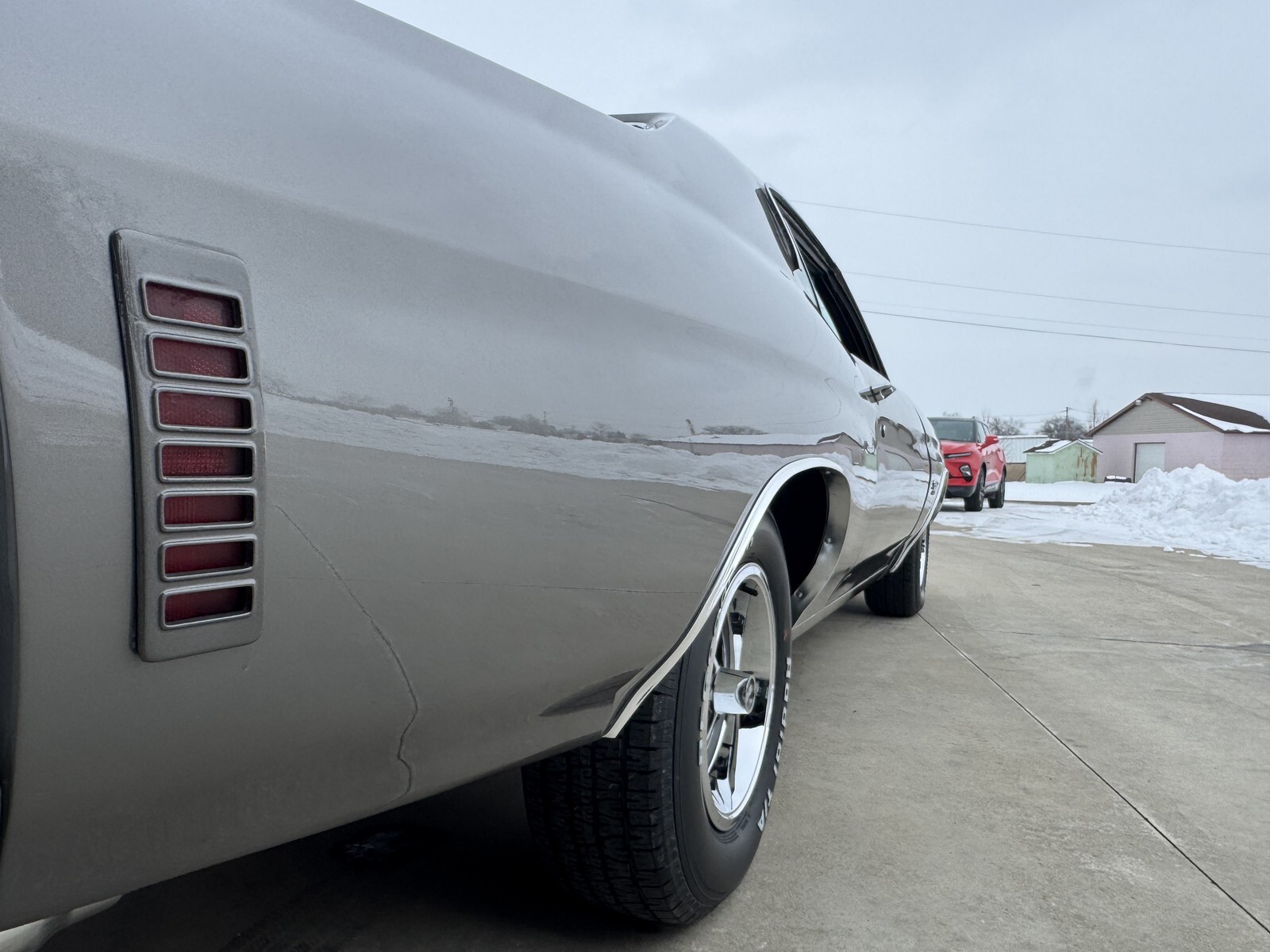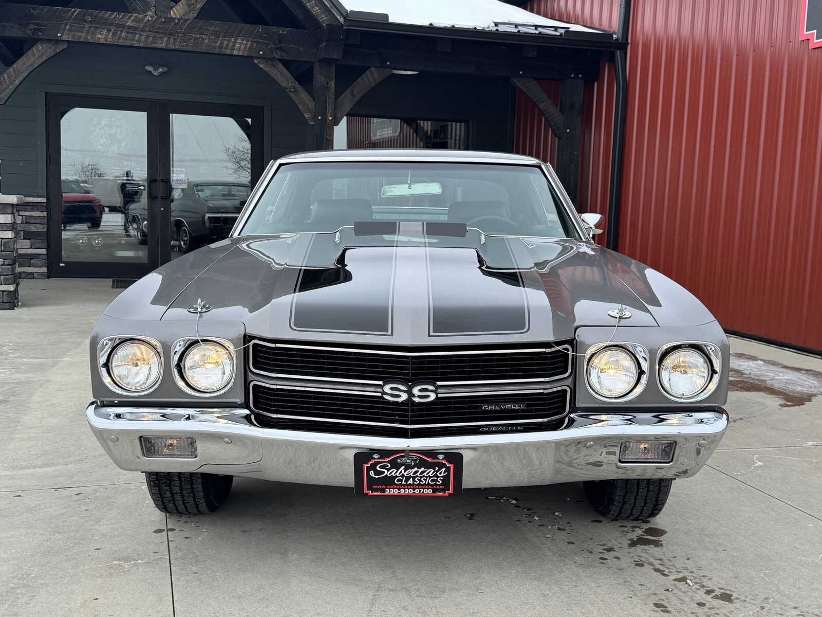 This 1970 Chevelle is absolutely gorgeous in its factory color Shadow Gray, code 17. It features black SS stripes running down the functional Cowl Induction hood and deck lid. The body is gorgeous and very straight down both sides. The paint has been color sanded to a smooth high gloss finish. The black SS stripes are under the clear coat and smooth to the touch. It sports a functional Cowl Induction hood with factory hood pins. All the stainless and trim are like new. The door handles, mirrors, front and rear bumpers have been replaced and look very shiny. It has new headlight bezels. The front grill and SS emblem are like new. It also has new weather stripping and window seals. All the glass is in good condition. The door jambs are nicely painted. It sits on a set of 14x7 SS