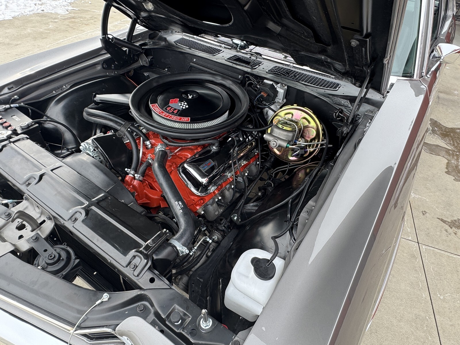 The engine compartment has a period-correct 454 ci engine. Some features include a dual feed Holley carb with correct fuel line, Cowl Induction air cleaner, factory chrome valve covers, HEI ignition, stock exhaust manifolds, new cadmium plated brake booster and master cylinder. It has a 4-core radiator (for those hot summer days!), power steering, cadmium plated brake booster with newer master cylinder, correct spring style battery cables and GM hoses with correct tower clamps. The engine compartment has a black satin finish.