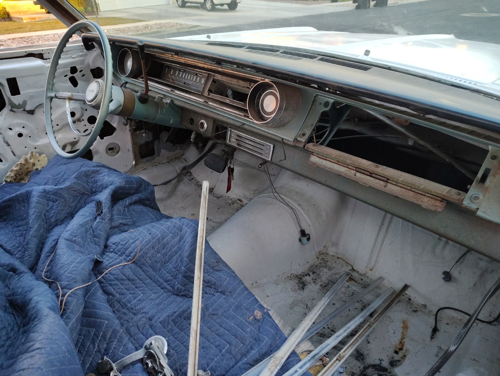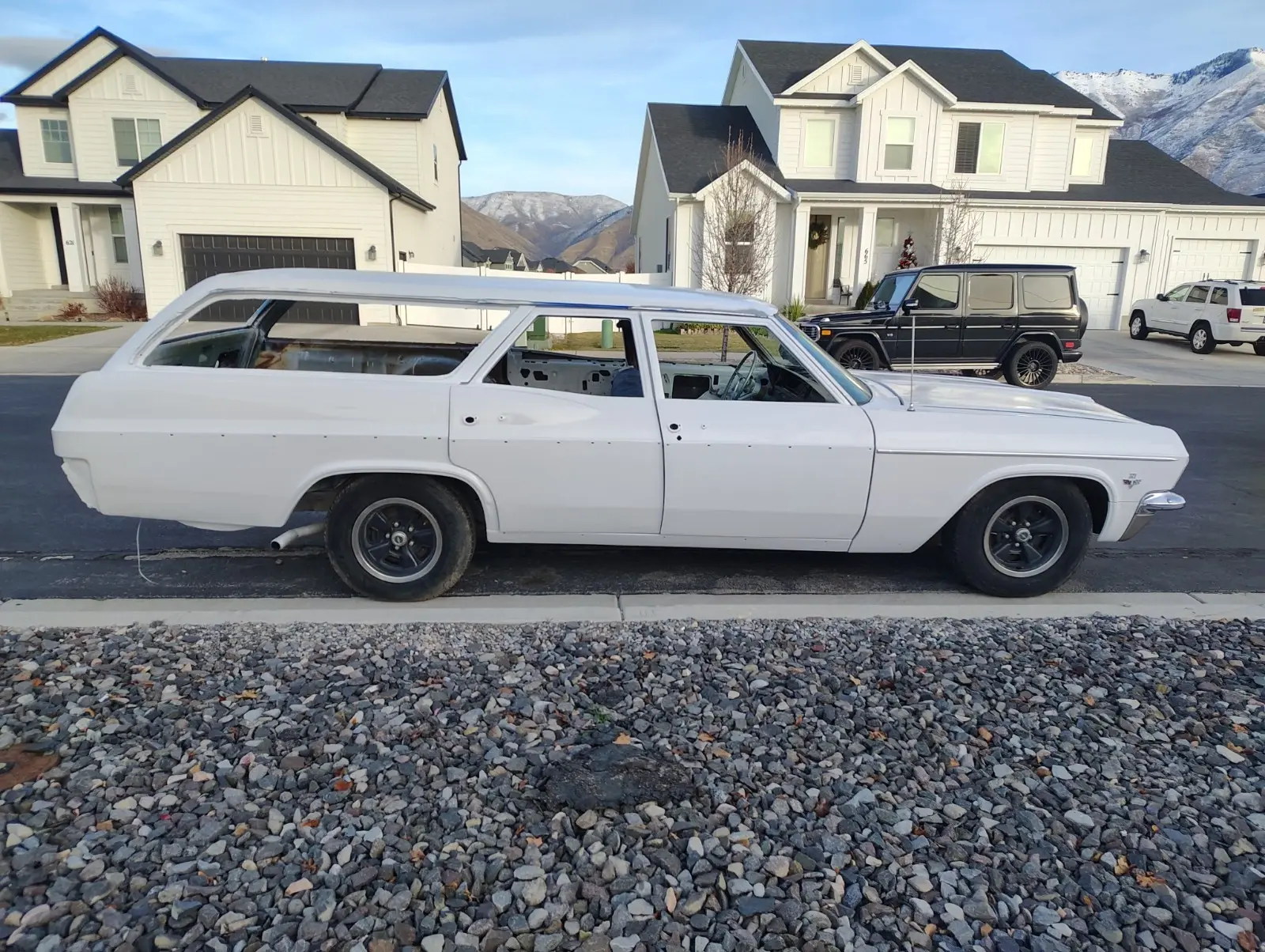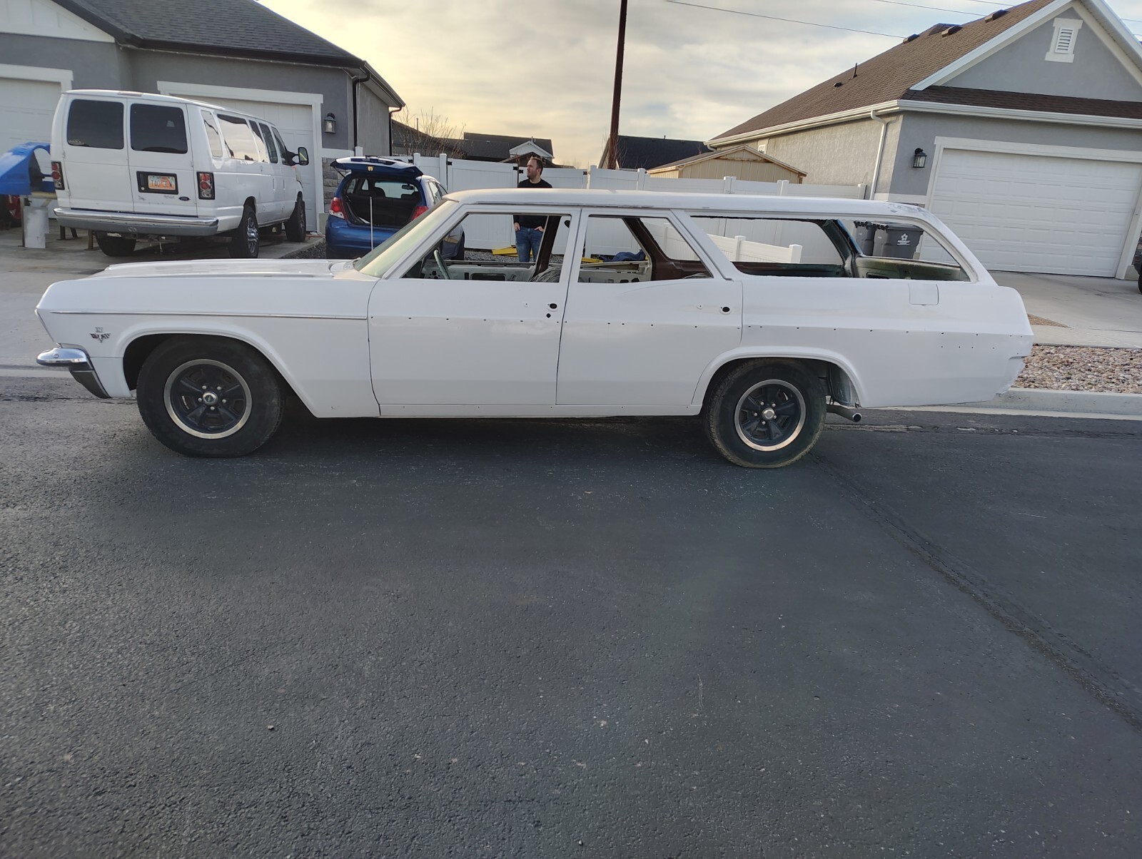 1965 Bel Air station wagon project needs to be finished currently painted with hardened rustoleum just to protect it from winter. The car was originally white with a light turquoise interior, with dark aqua dashboard and carpet.The car come with a gallon paint kit with the original turquoise paint to paint the interior parts and trunk. I stop here in case someone wants to change the interior color.