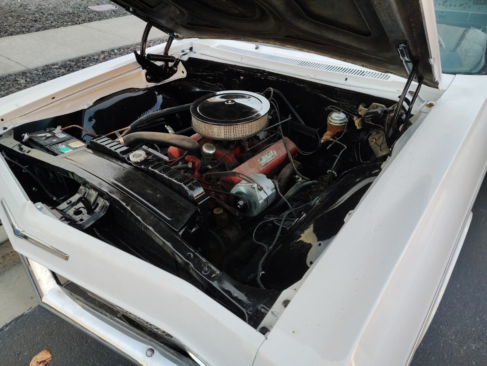 The drivetrain is a 1980s 350 masquerading as a 327. The original four jet 4 barrel carberator works well but needs attention, or replace. The original single point ignition is present and works well. Comes with a good old powerglide (that still shifts solid), and 12 bolt rear end.