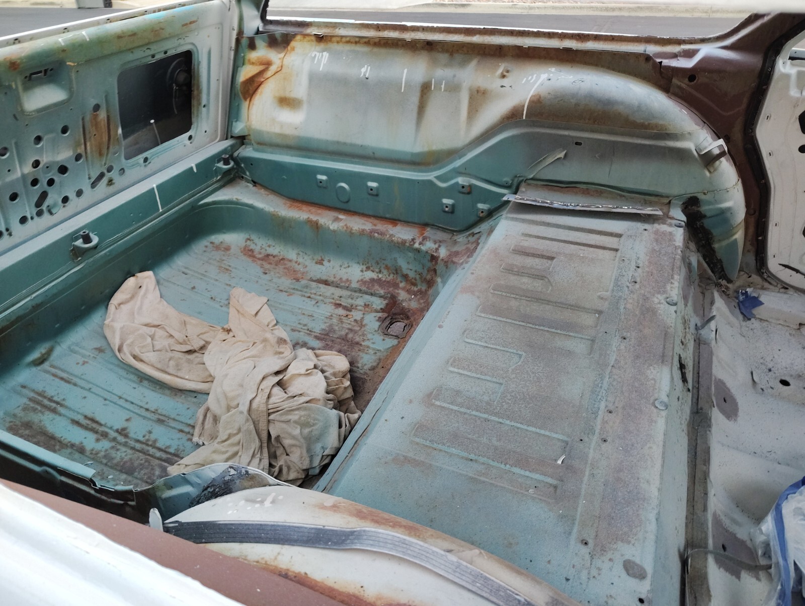 The rust repair under the new windshield has been done with a section taken out of another car and welded in. The floors have small patch panels that were welded in, and then covered with fiberglass to produce a nice solid floor.