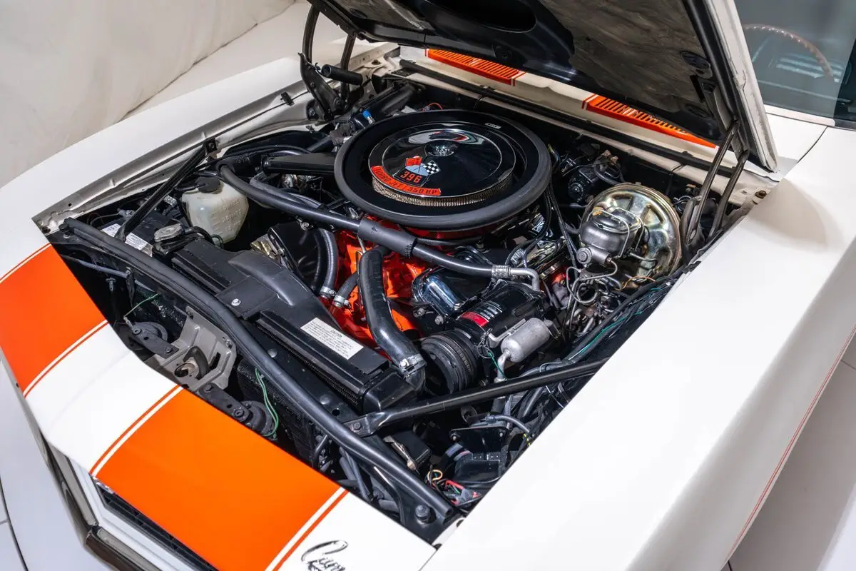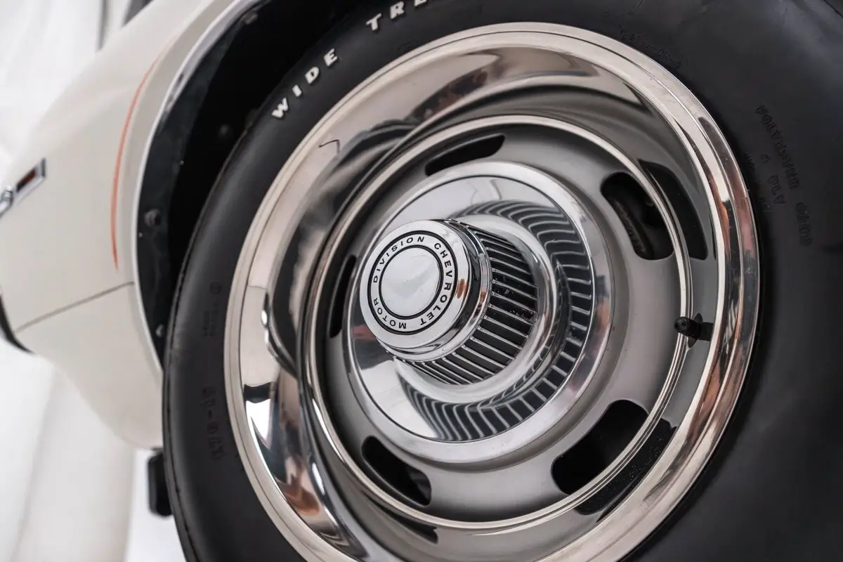 The 15" Rally wheels are mounted with E70-15 Goodyear Wide Tread GT tires. The car is equipped with power steering, and stopping power is provided by power-assisted four-wheel discs. Cars optioned as such were all finished in Dover White with Z/28-style stripes in Hugger Orange, and had a rear spoiler, a special ducted hood, and concealed headlights.