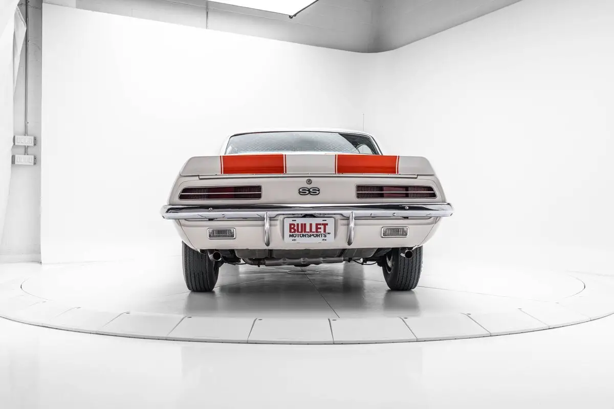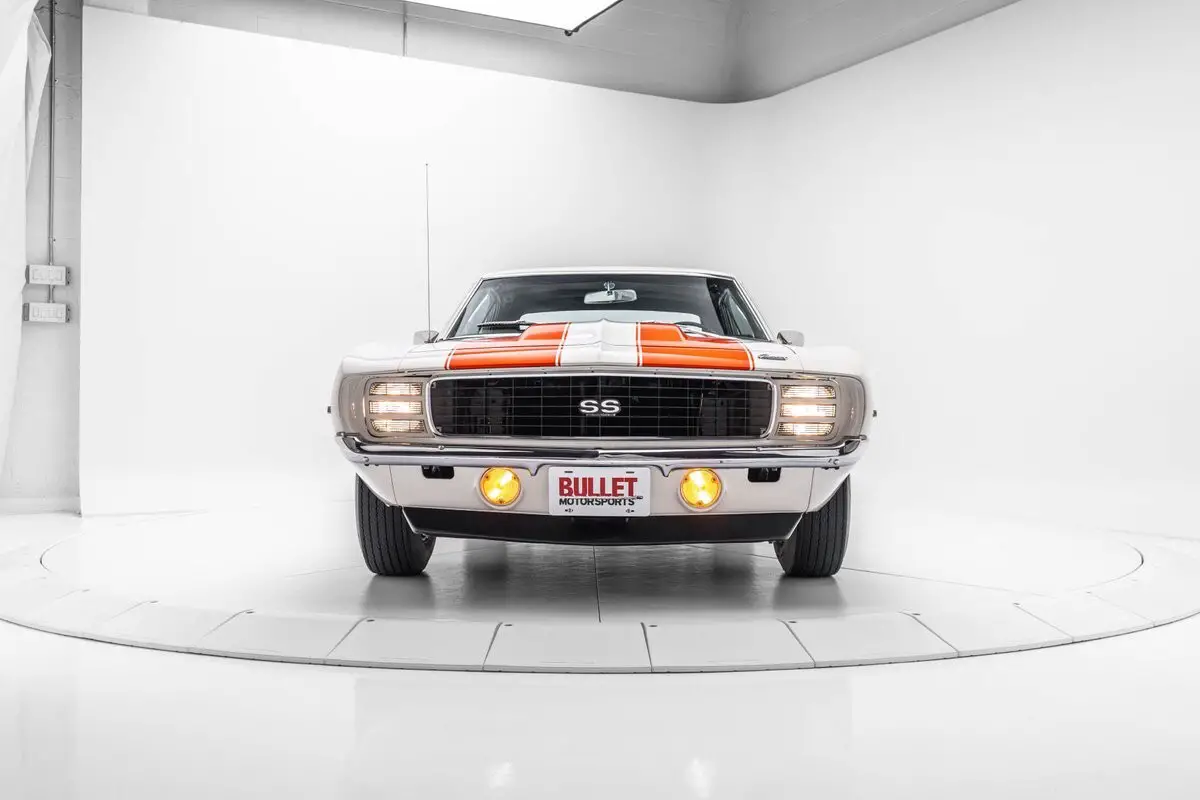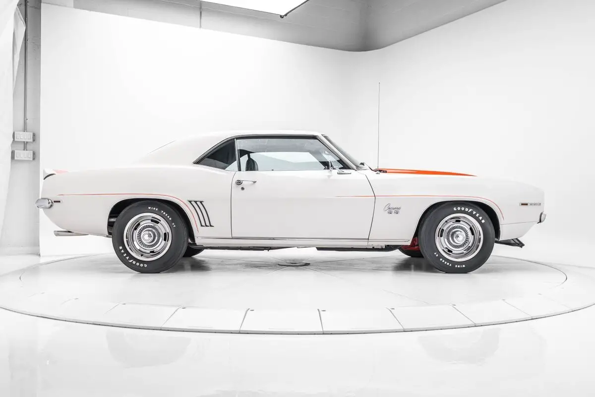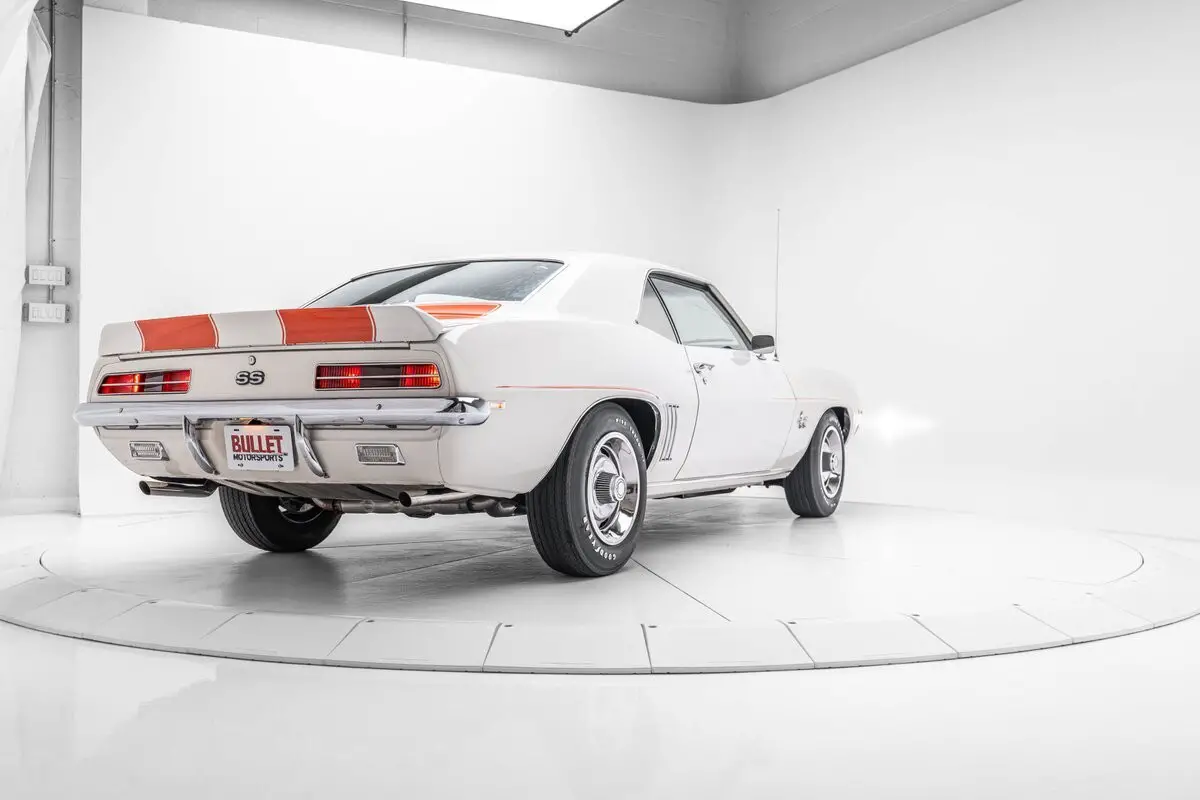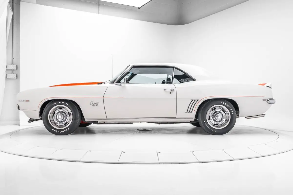 This 1969 Chevrolet Camaro coupe is equipped with the Z10 option, which added the RS and SS packages and a Dover White paint and Hugger Orange Z/28-style stripe livery similar to the Z11 Indy 500 pace car package available for convertibles. This example is said to have been found in a barn by the current owner in the 2000s and subsequently refurbished. Power is provided by a 396ci V8 paired with a three-speed Turbo Hydramatic automatic transmission, and additional equipment includes concealed headlights, front and rear spoilers, power steering, 15" Rally wheels, power-assisted disc brakes, front bucket seats, a push-button FM radio, air conditioning, and a four-barrel carburetor.