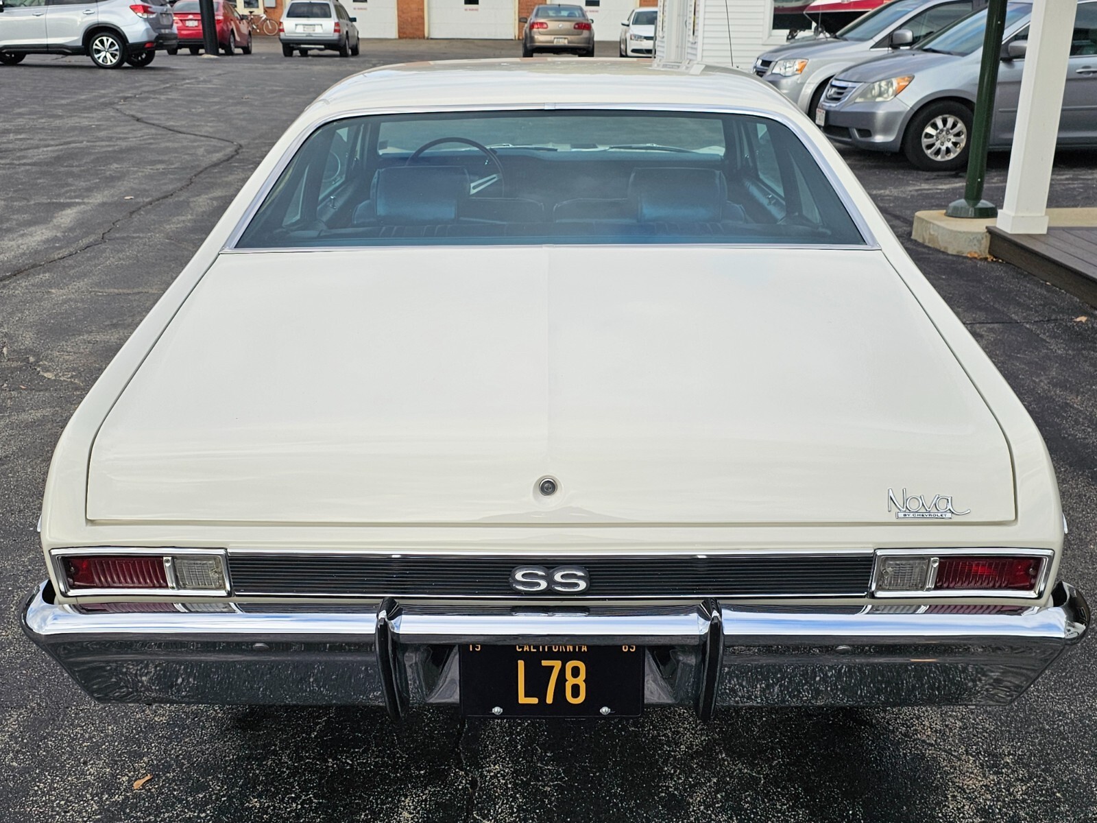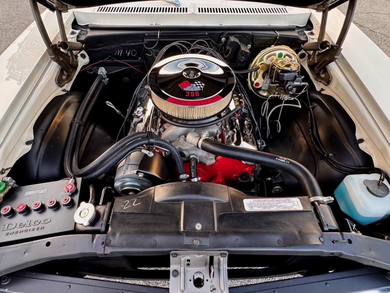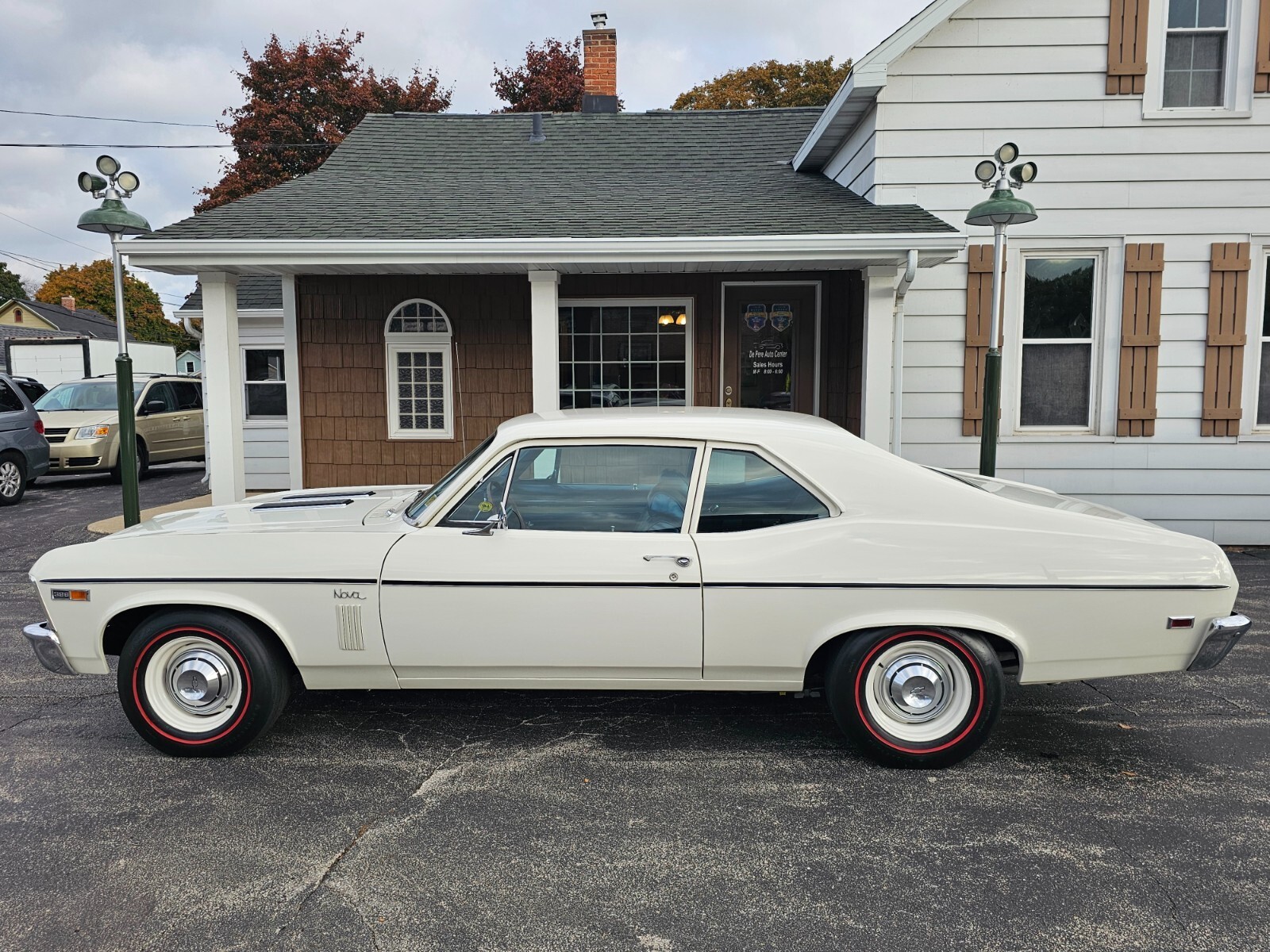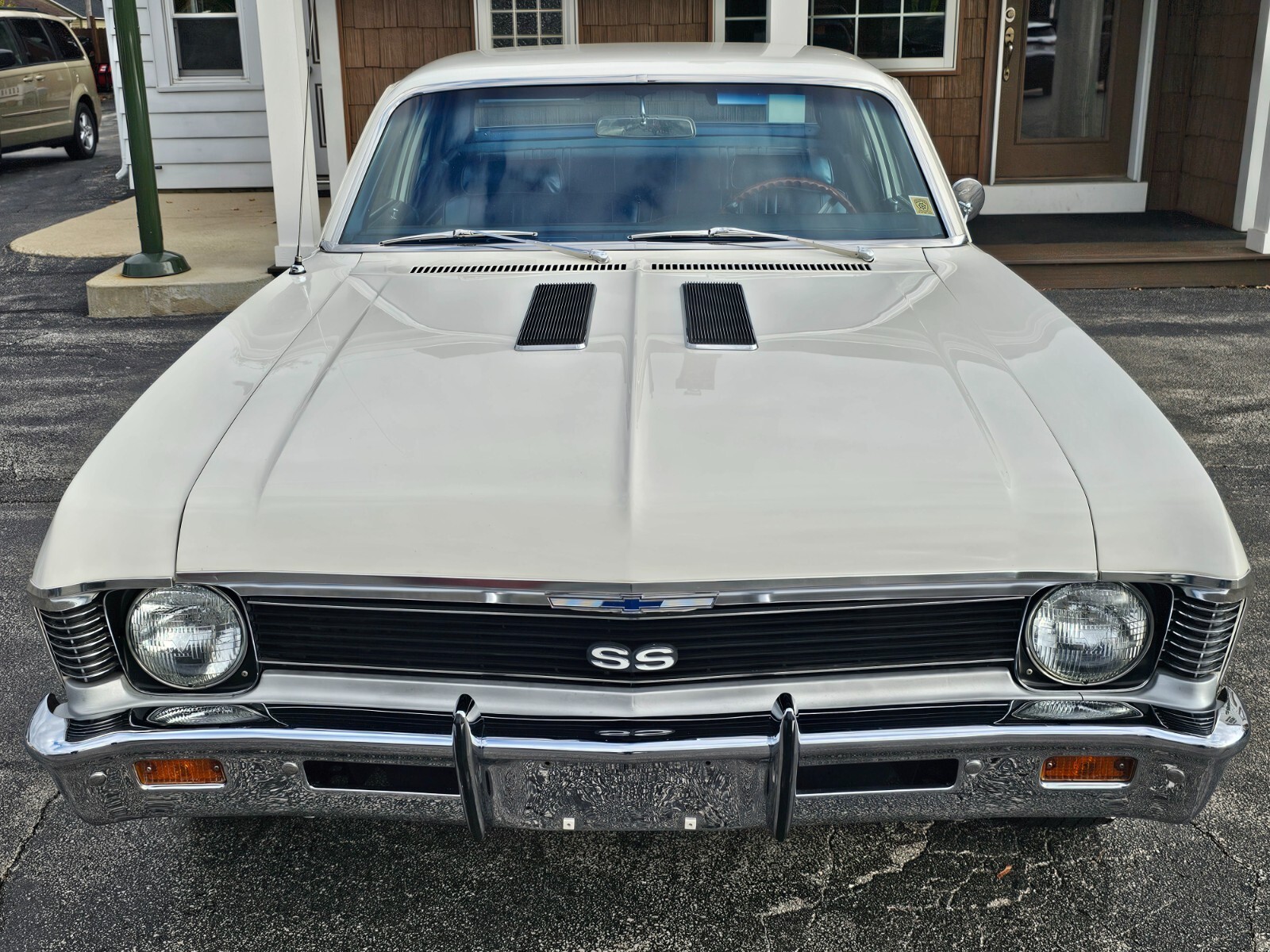 This Nova is equipped with a 396/375 HP V8 CE engine, automatic transmission, 12-bolt positraction rear axle, power steering, and power disc brakes, pushbutton AM radio, simulated rosewood steering wheel, soft ray tinted glass, F-70 Firestone Redline tires, correct spare and jack assembly, and front and rear bumper guards.