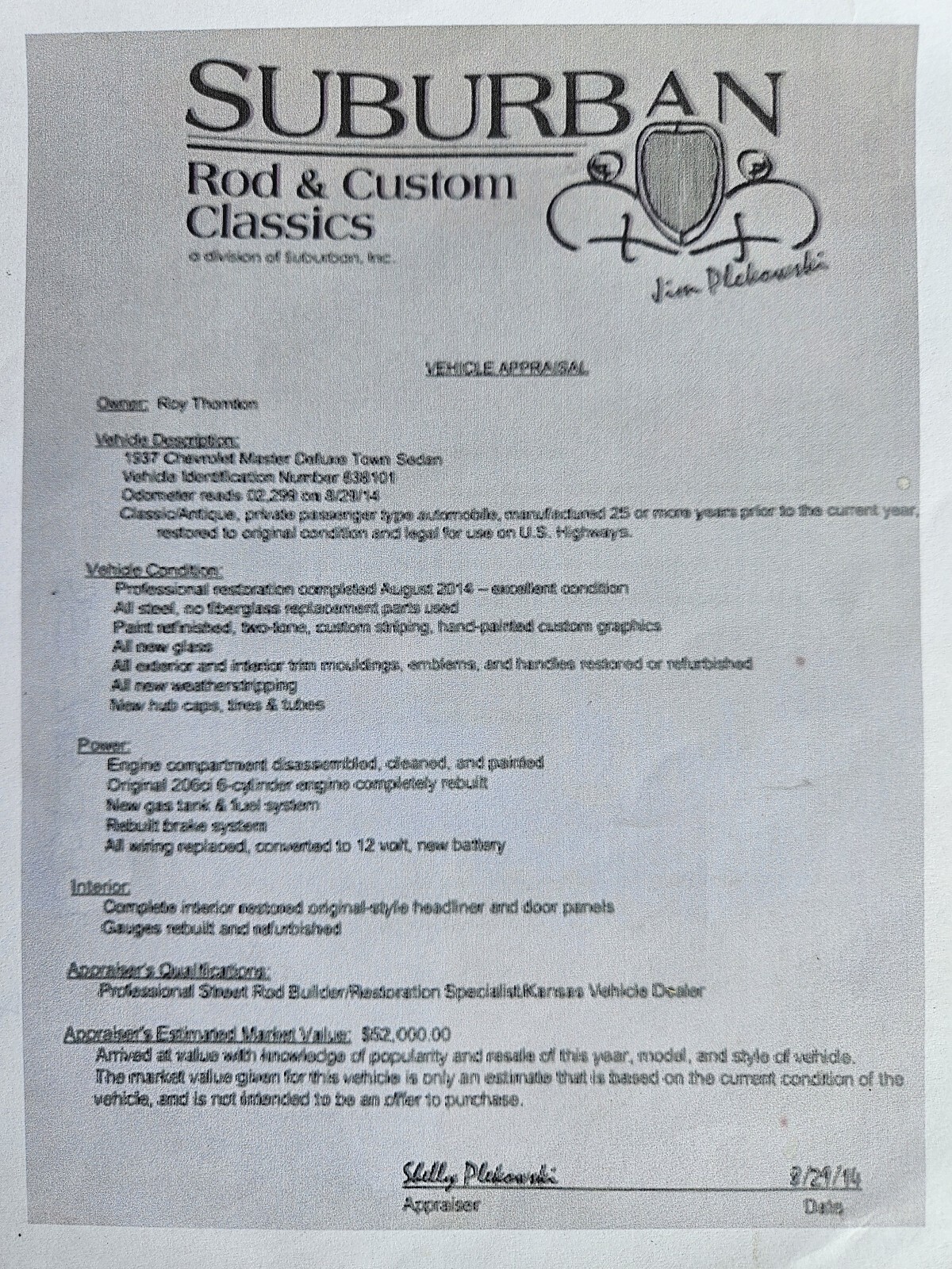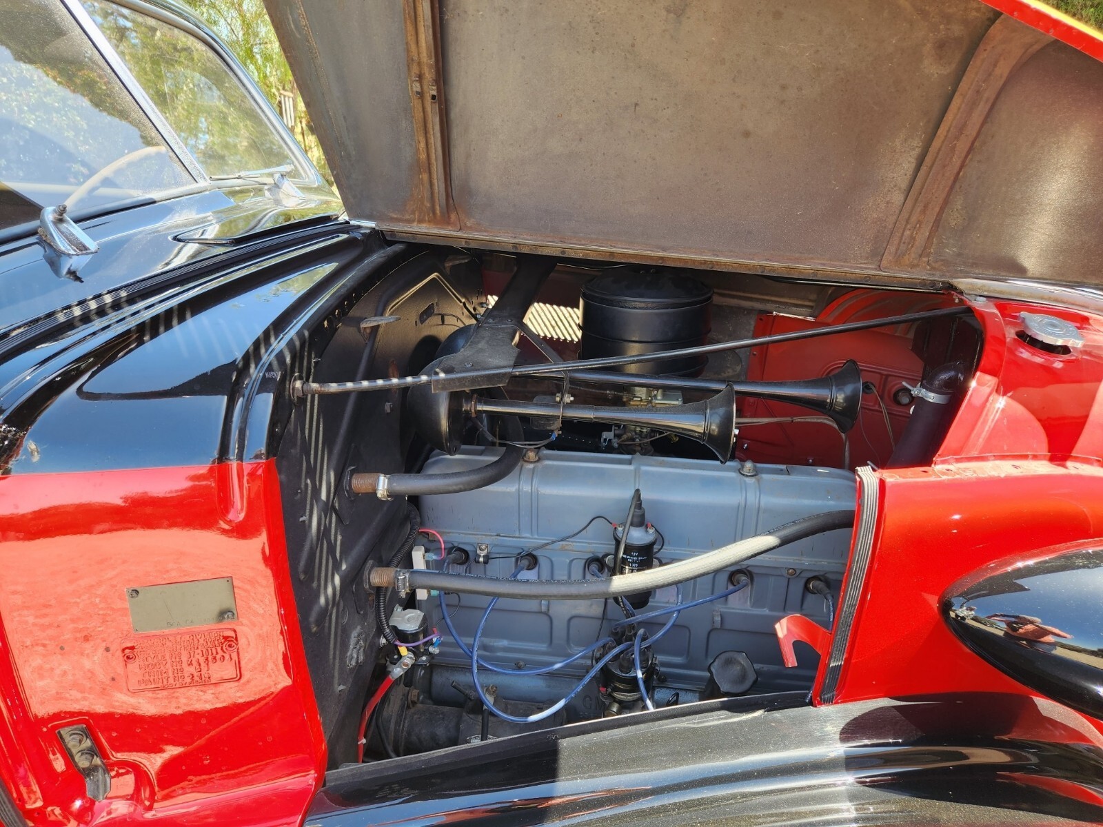 All steel, no fiberglass parts used. Paint refinished, 2-tone, custom striping, custom graphics. All new glass. All exterior & interior trim, mouldings, emblems, & handles restored or refurbished. All new weather stripping. Engine compartment disassembled, cleaned & painted. New gas tank & fuel system. Rebuilt break system. All wiring replaced, coverted to 12v. Interior completely restored. Original engine completely rebuilt July 2024.