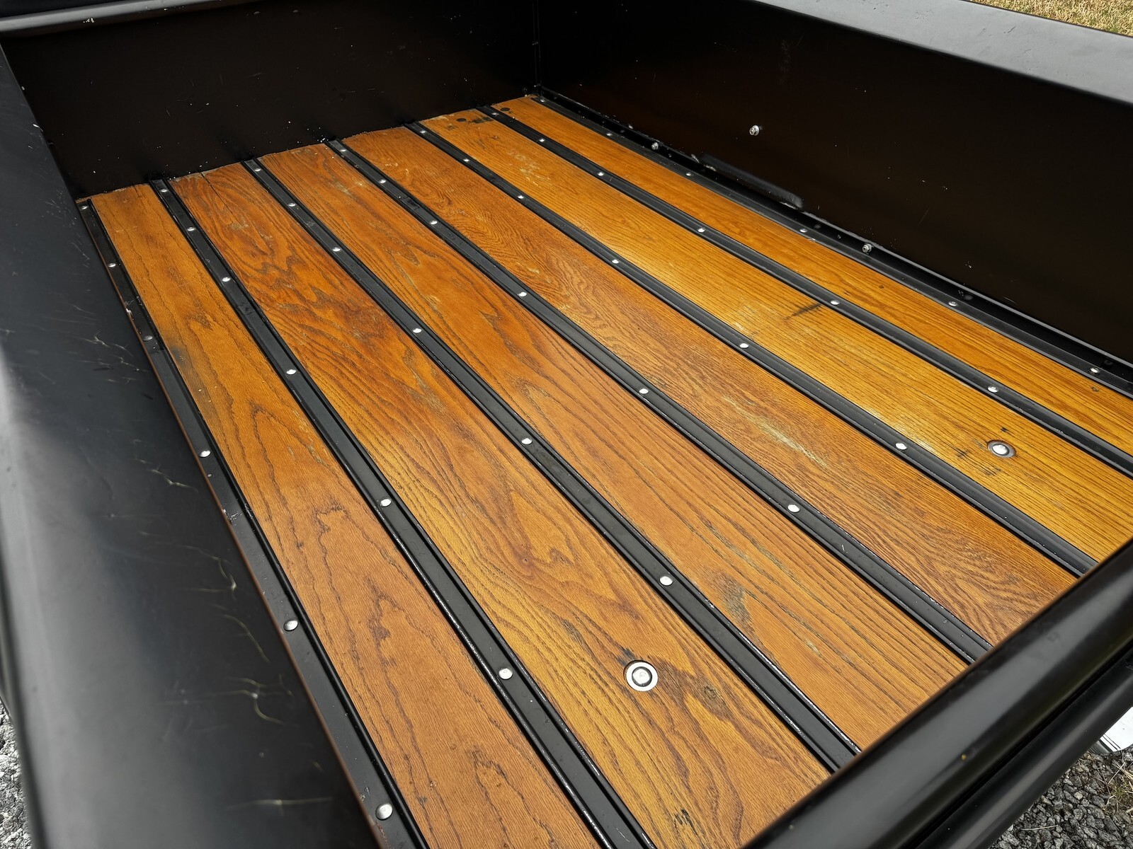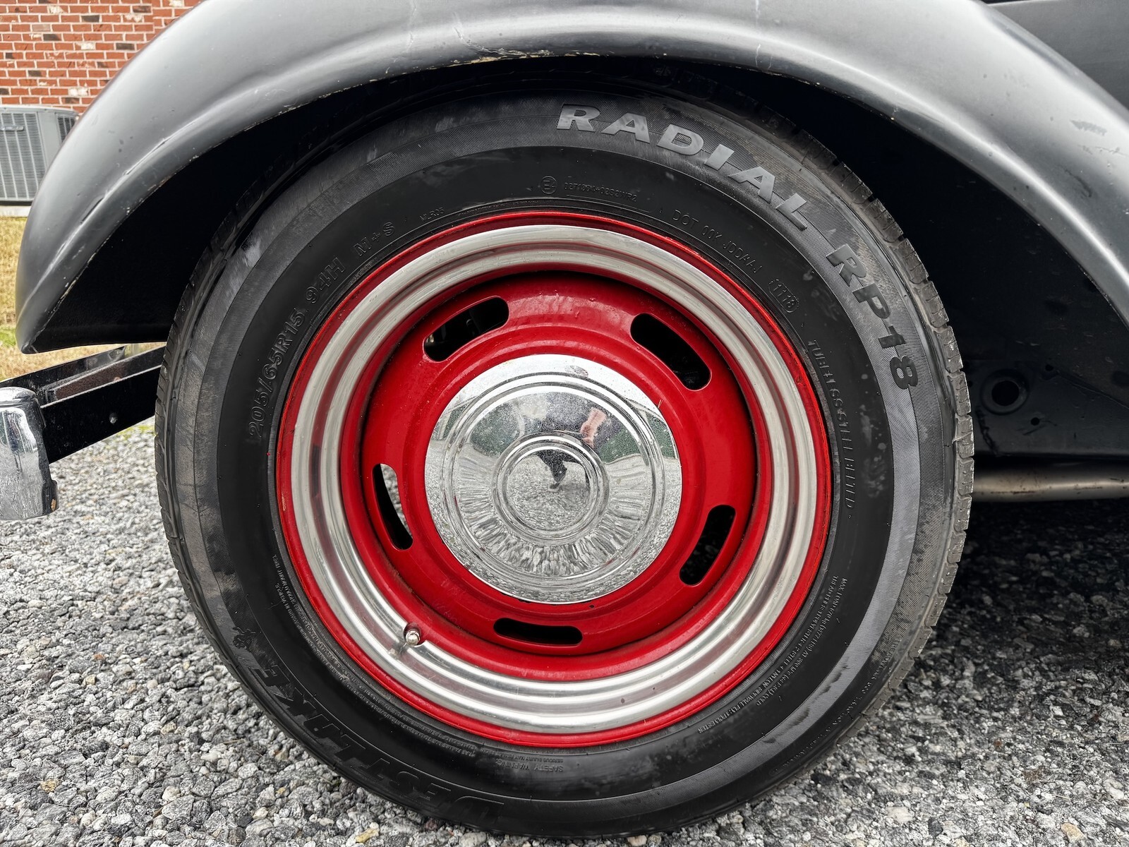 Rolling on red steel wheels with trim rings and classic hubcaps, the truck carries 205/65-15 front and 215/70-15 rear tires for that hot-rod stance. The exterior features hot rod black