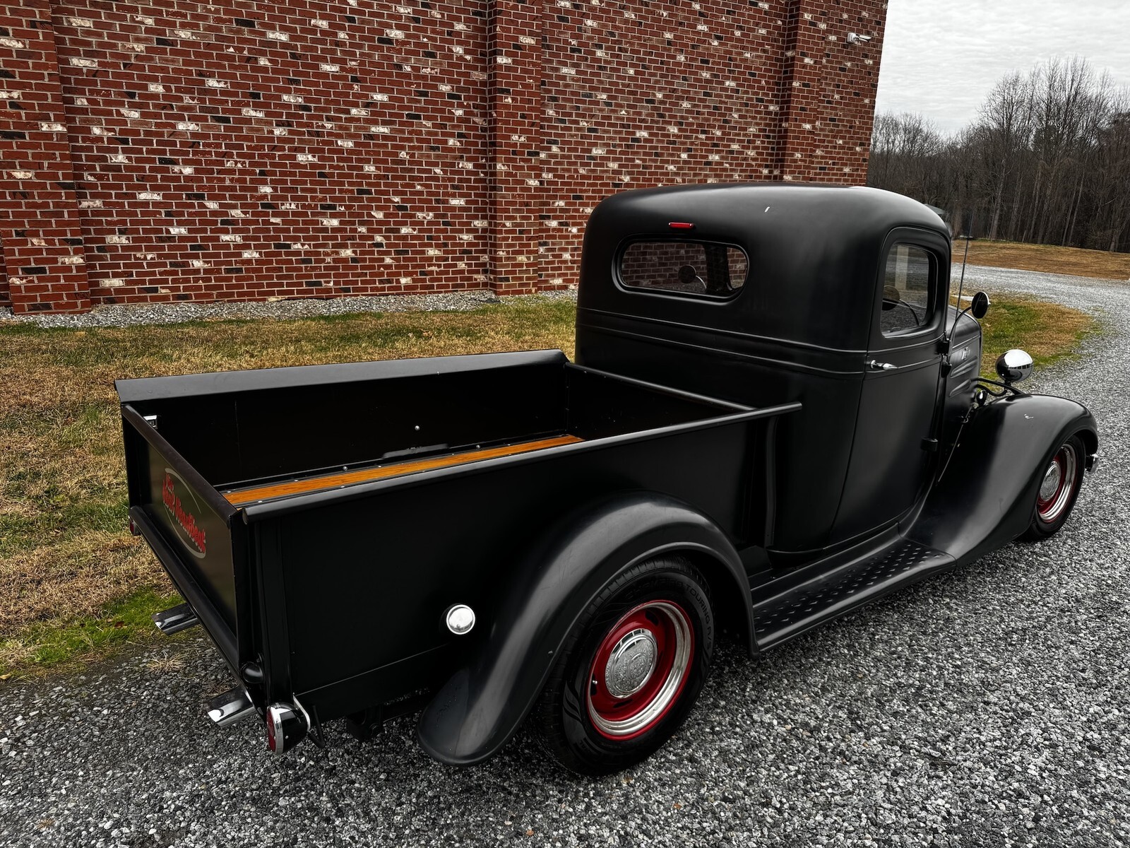 The suspension setup combines front coil springs, rear leaf springs, and rack-and-pinion steering, making this ’36 far easier to handle than most trucks of its era. Stopping power comes from power front disc brakes paired with rear drums, offering confident braking.