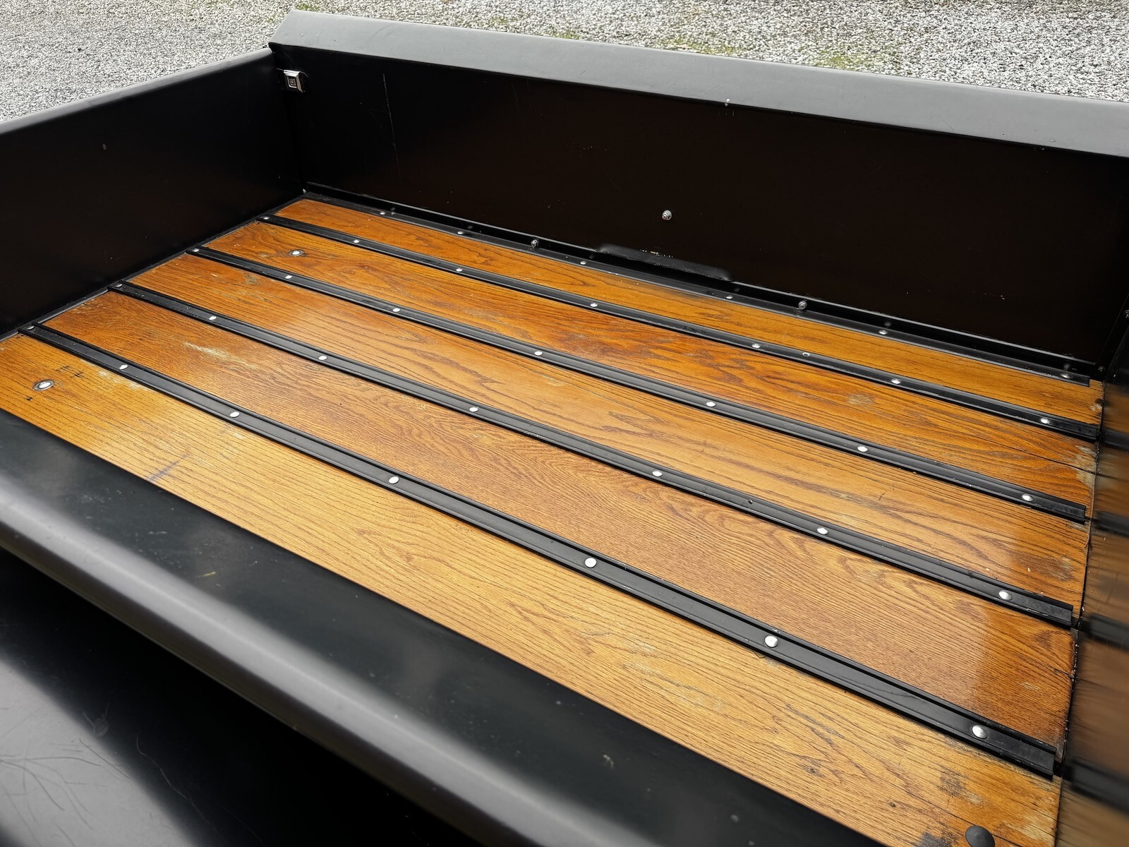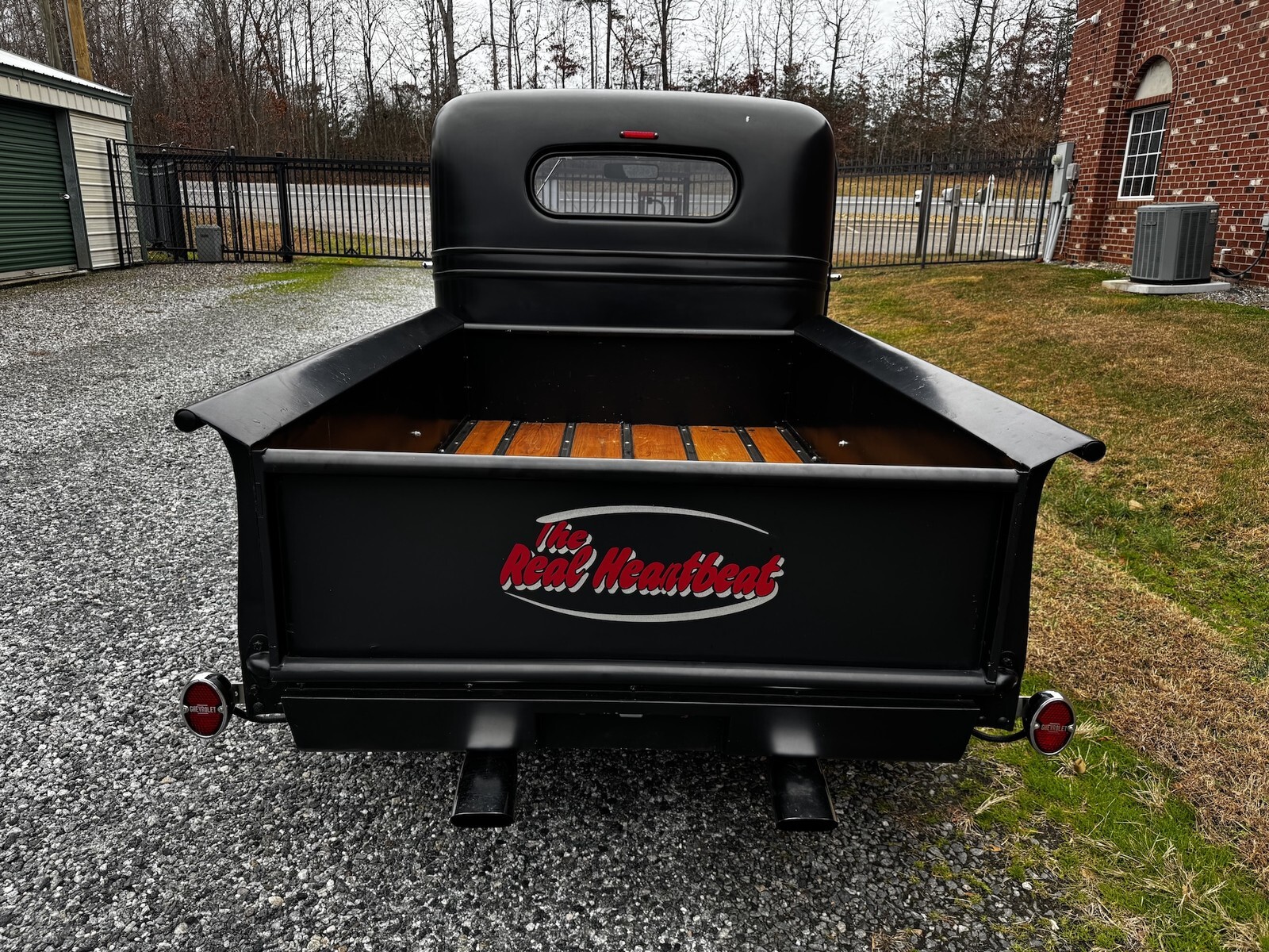 Rolling on red steel wheels with trim rings and classic hubcaps, the truck carries 205/65-15 front and 215/70-15 rear tires for that hot-rod stance. The exterior features hot rod black paint contrasted by a yellow firewall, with patina trim and good glass throughout for a period-correct look that turns heads everywhere it goes.