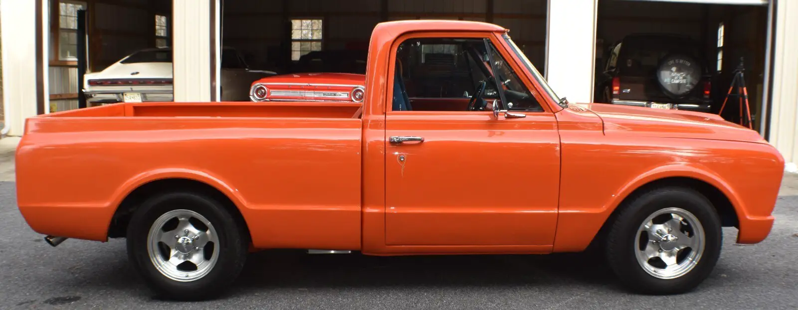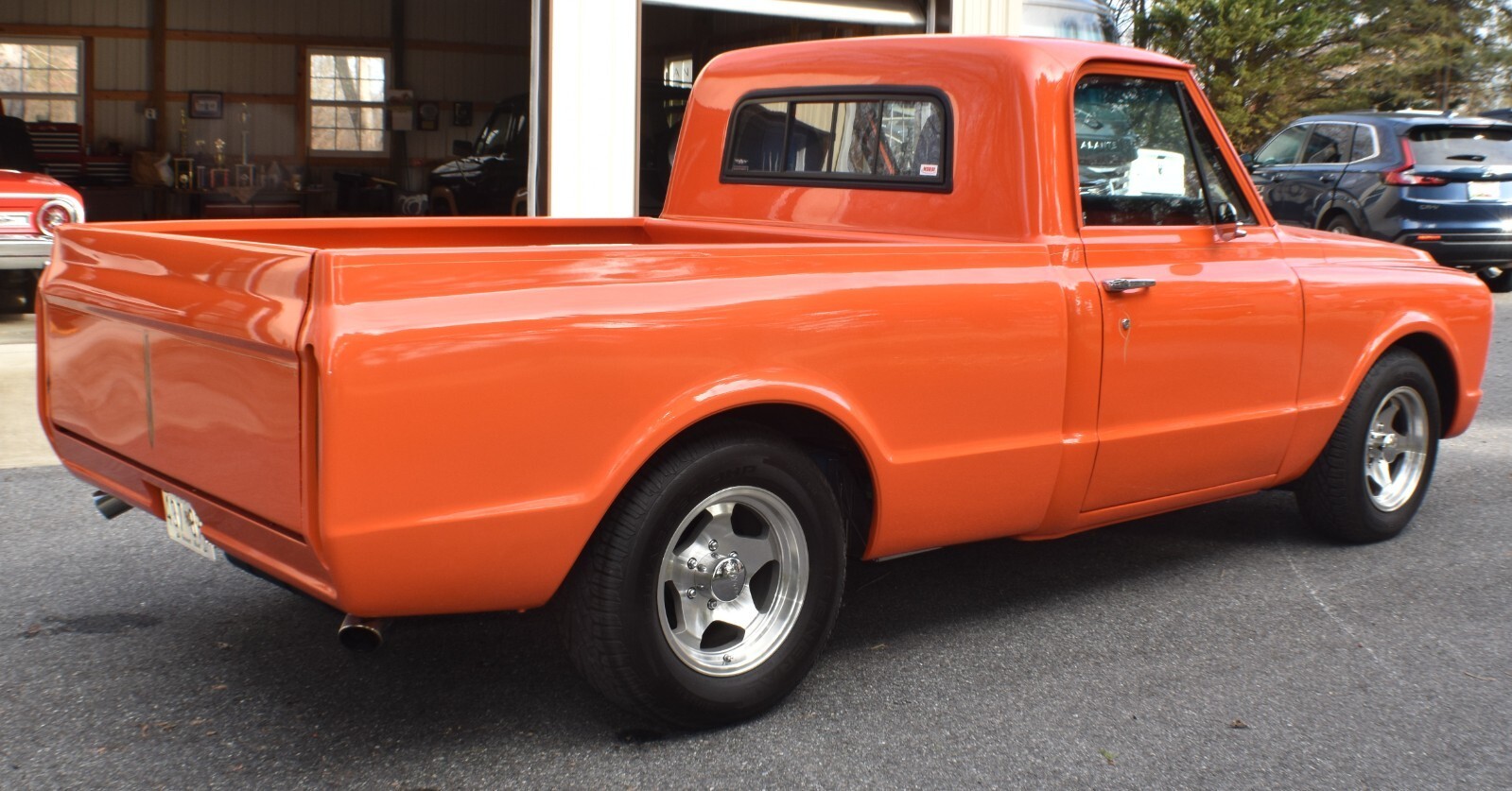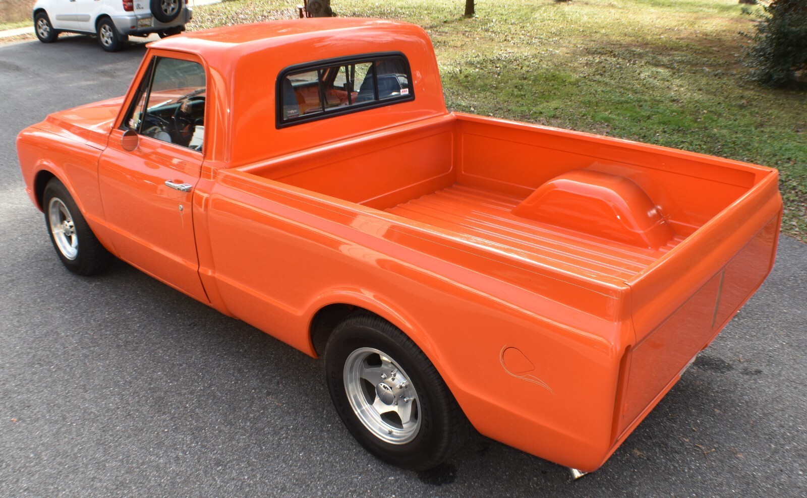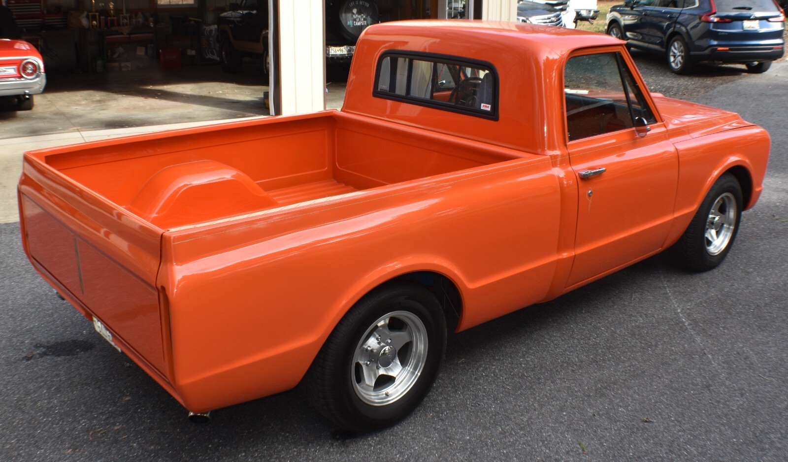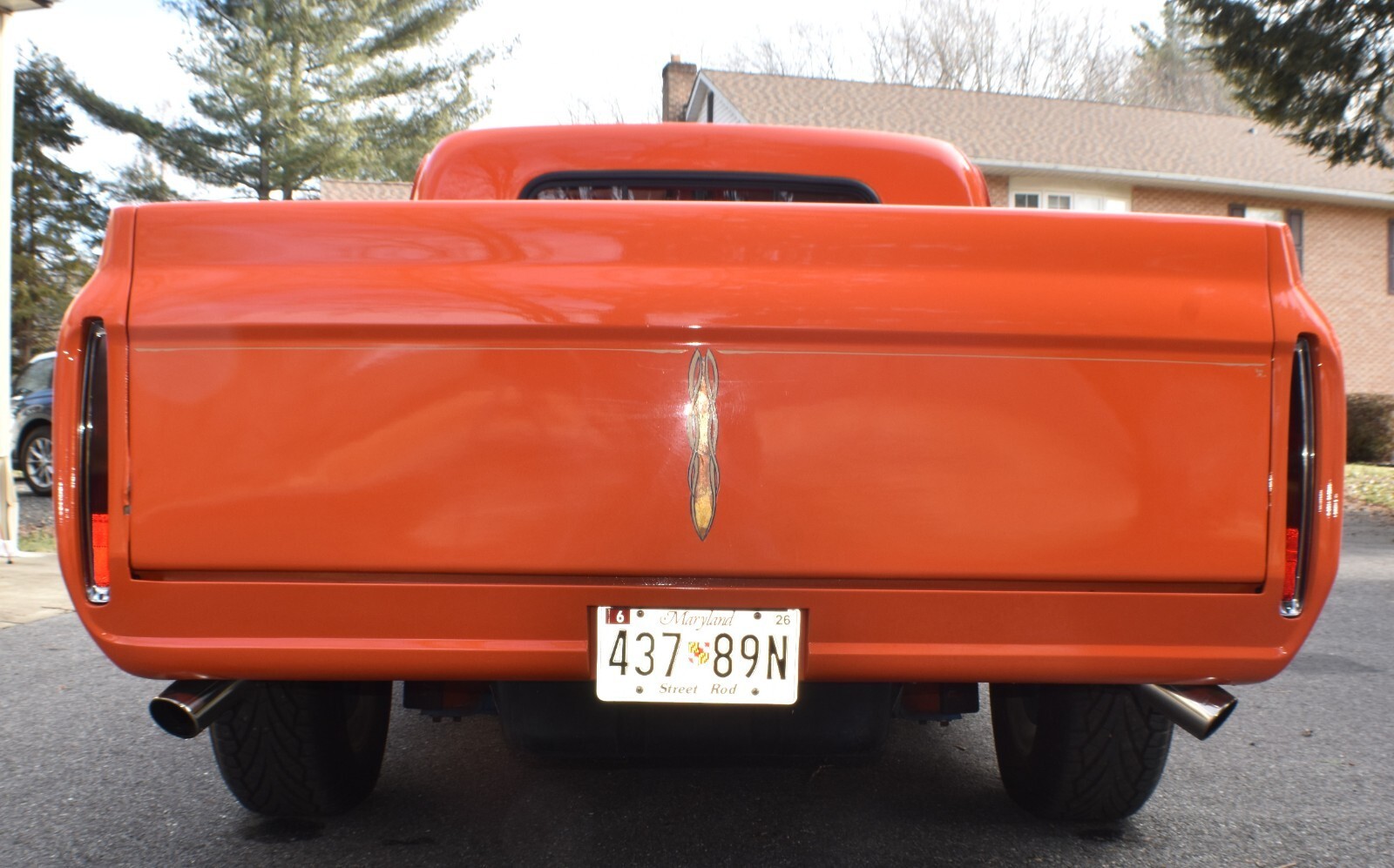 Stock C10 cab with a 6-ft bed painted in a 2-stage urethane “Hugger” orange with pinstriping accents. Electrically operated hydraulic hood opens and closes the hood with reverse hinges. Late model Cadillac taillights and turn signals. Body has been dechromed and all emblems have been shaved. Gas tank was relocated is uses a ‘push and release’ door on the left side of the bed. The paint and bodywork still look excellent.