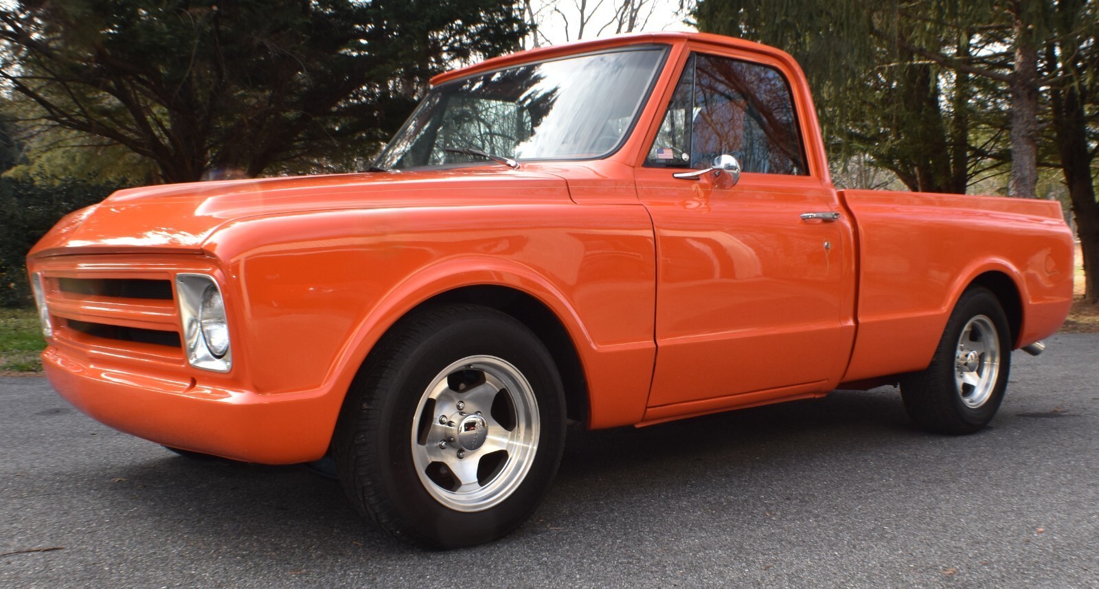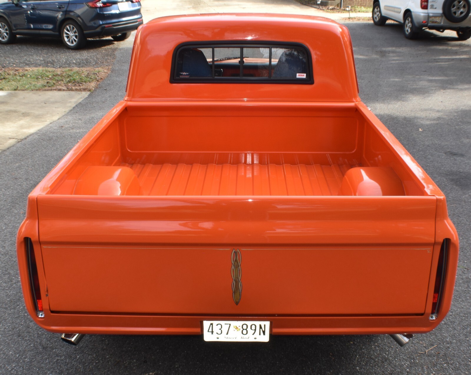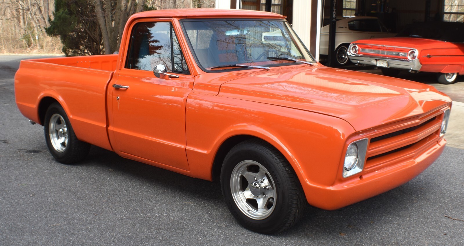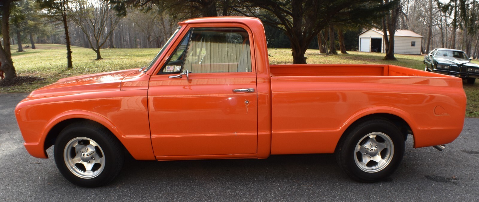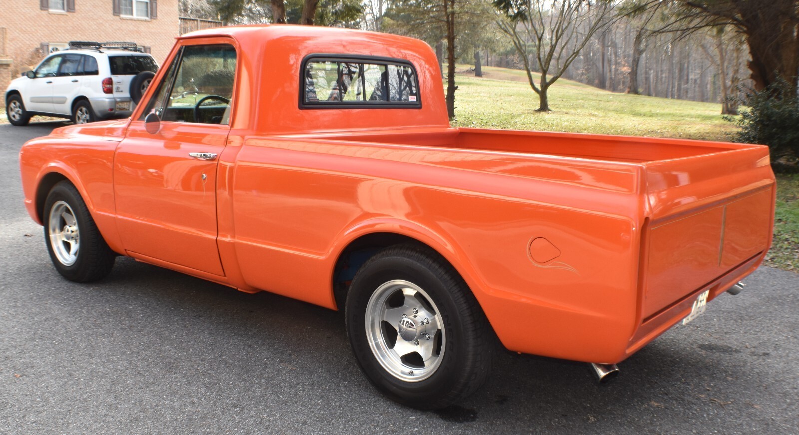 Stock C10 cab with a 6-ft bed painted in a 2-stage urethane “Hugger” orange with pinstriping accents. Electrically operated hydraulic hood opens and closes the hood with reverse hinges. Late model Cadillac taillights and turn signals. Body has been dechromed and all emblems have been shaved. Gas tank was relocated is uses a ‘push and release’ door on the left side of the bed. The paint and bodywork still look excellent.