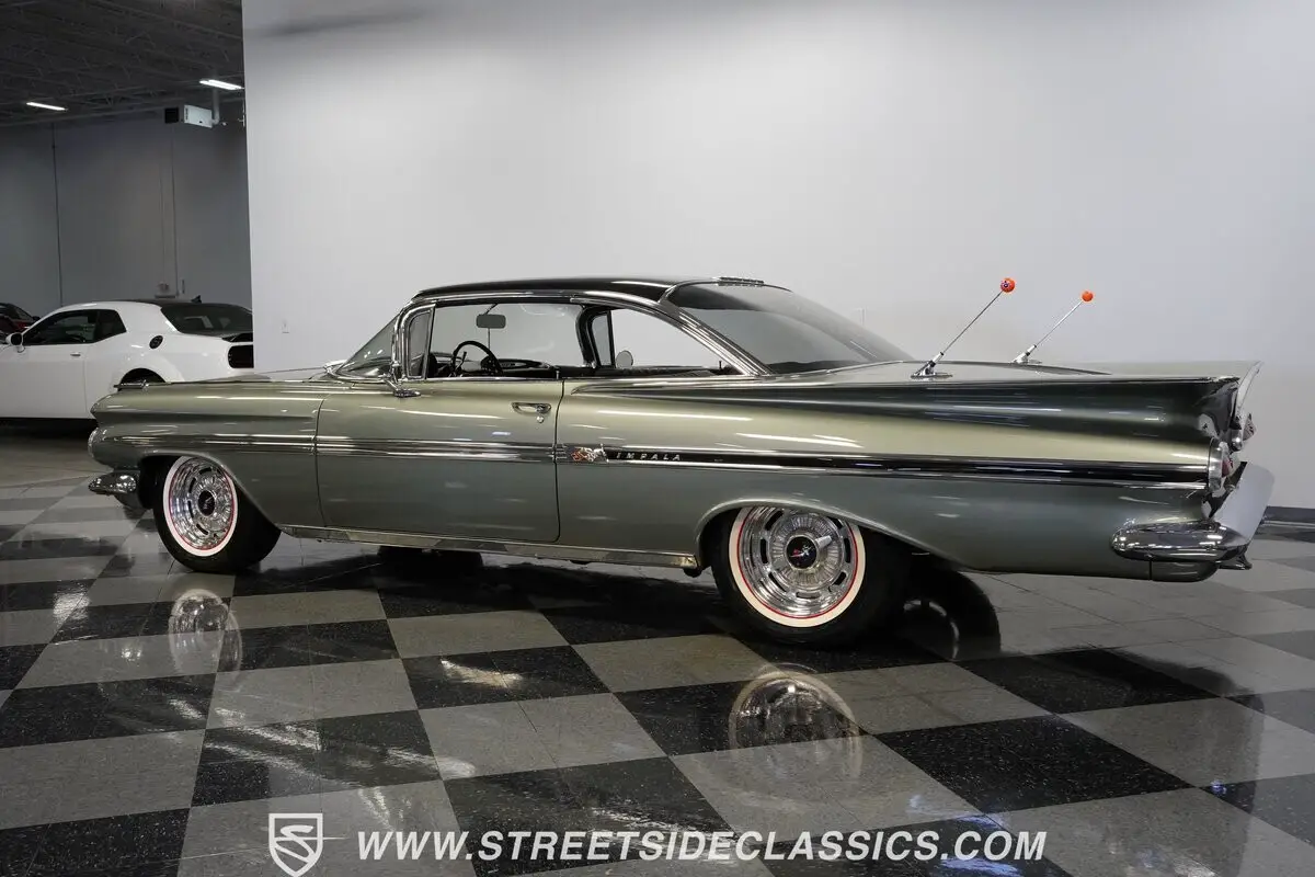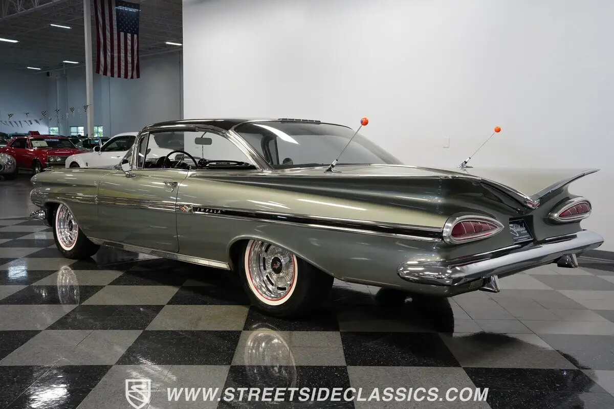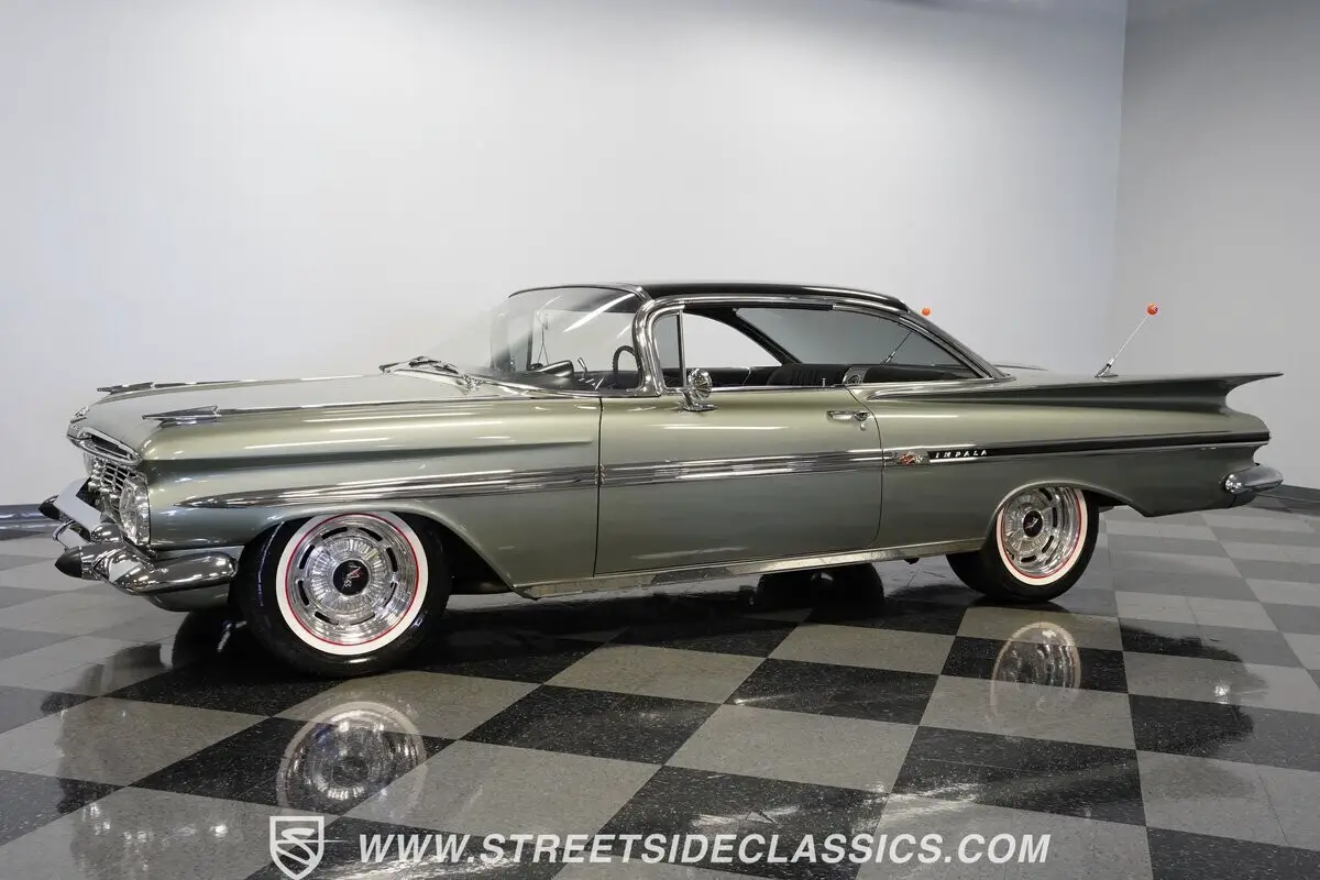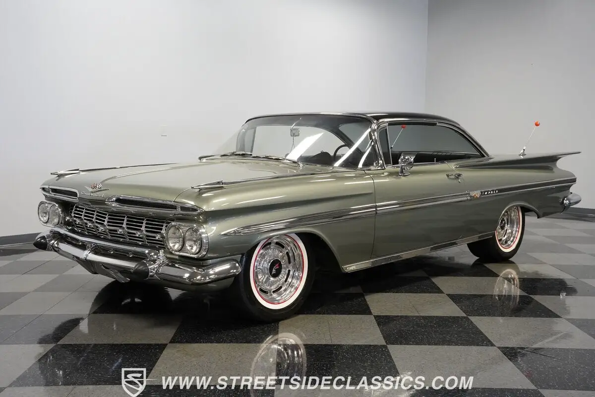 Fully restored by Hot Rod Dynamics in North Carolina, this 1959 Chevrolet Impala LS3 Restomod gleams in Green Metallic paint with just the right amount of metal flake for depth and character. The iconic '59 Impala styling with its distinctive horizontal rear fins and dramatic front end creates an unmistakable profile that defines American automotive design. The exterior presentation is elevated by 18-inch front and 19-inch rear wheels styled to resemble classic Chevy hubcaps, wrapped in 255/45ZR18 front and 295/45ZR19 rear tires that amplify the stance. Dual antennas, laser-straight body panels, and exceptional bumpers and trim complete this meticulously crafted exterior.
